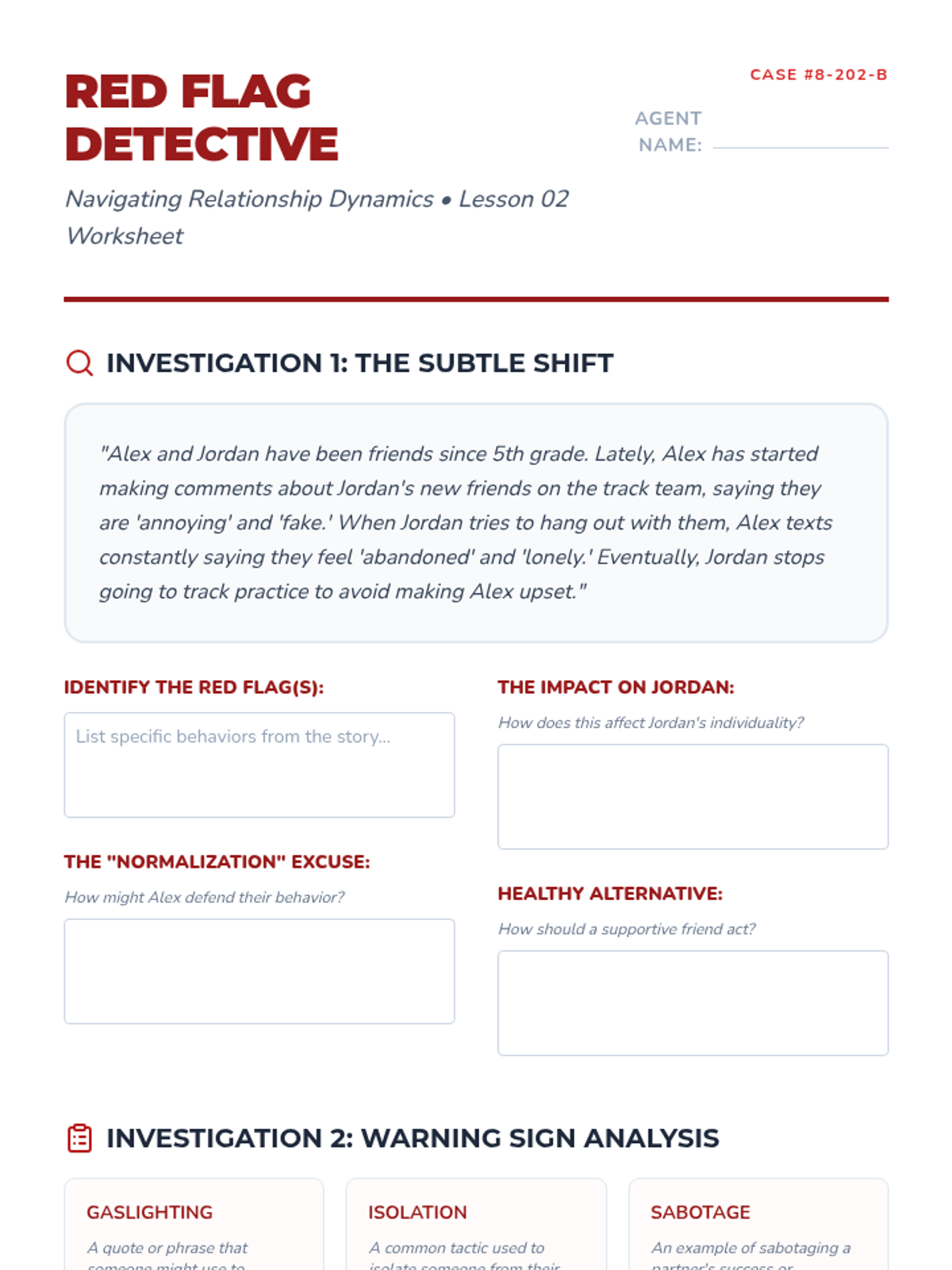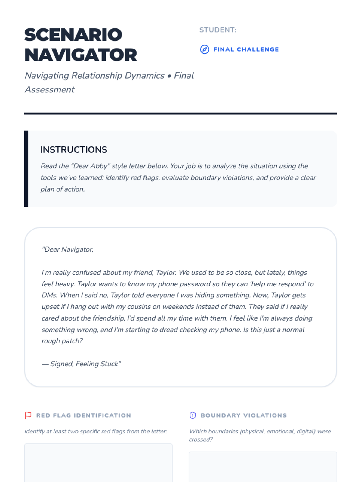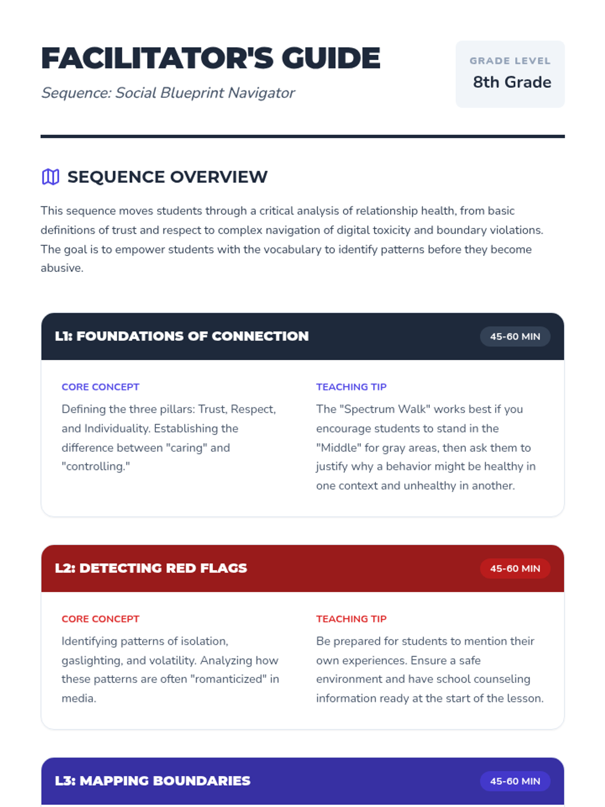 This 8th-grade sequence guides students through analyzing relationship dynamics, distinguishing between healthy and toxic behaviors, and establishing personal boundaries in both physical and digital spaces. Students move from foundational definitions to complex real-world application, culminating in scenario-based assessments and resource mapping for seeking help.