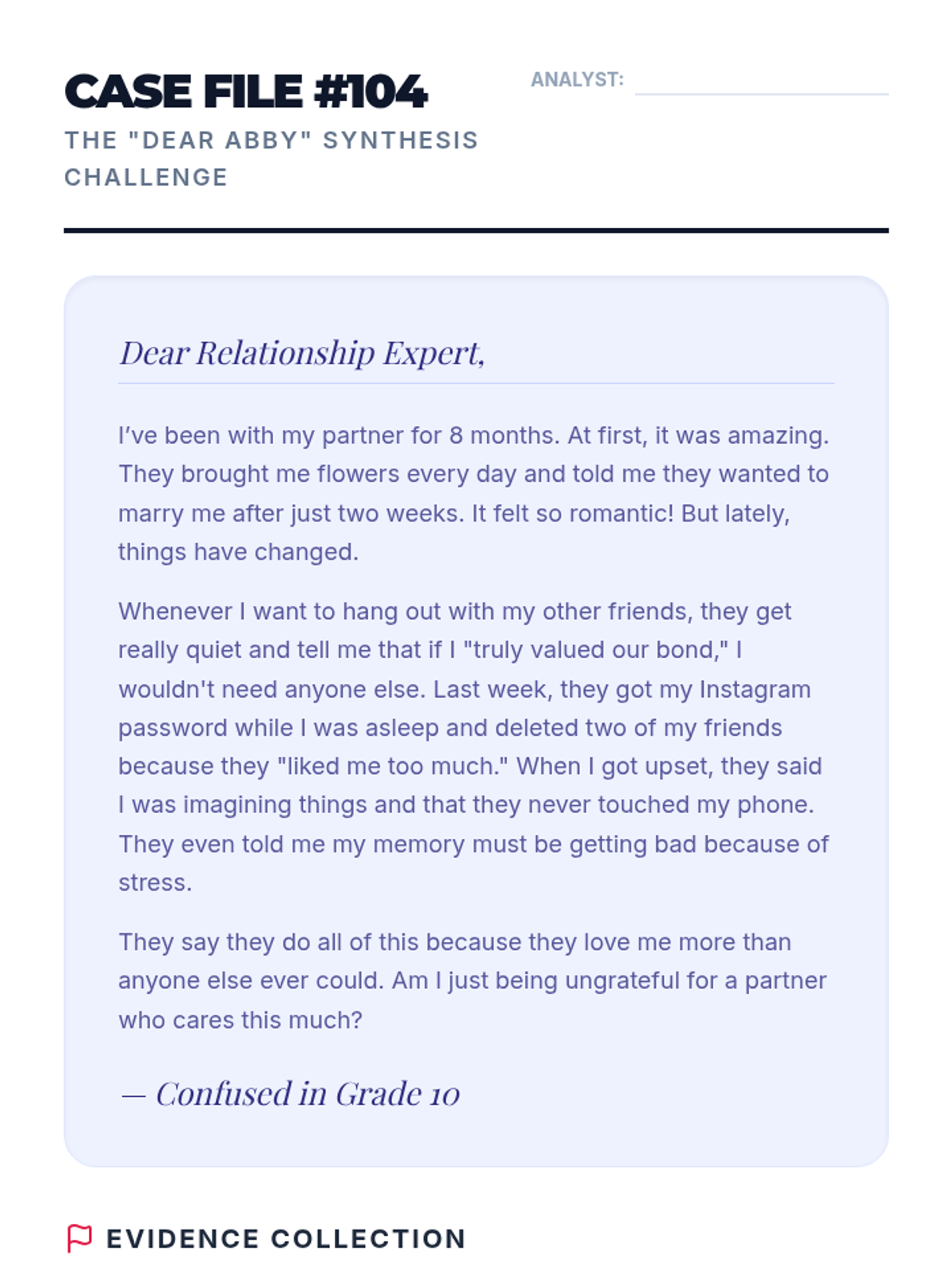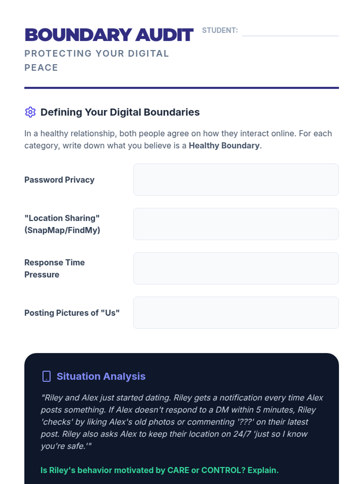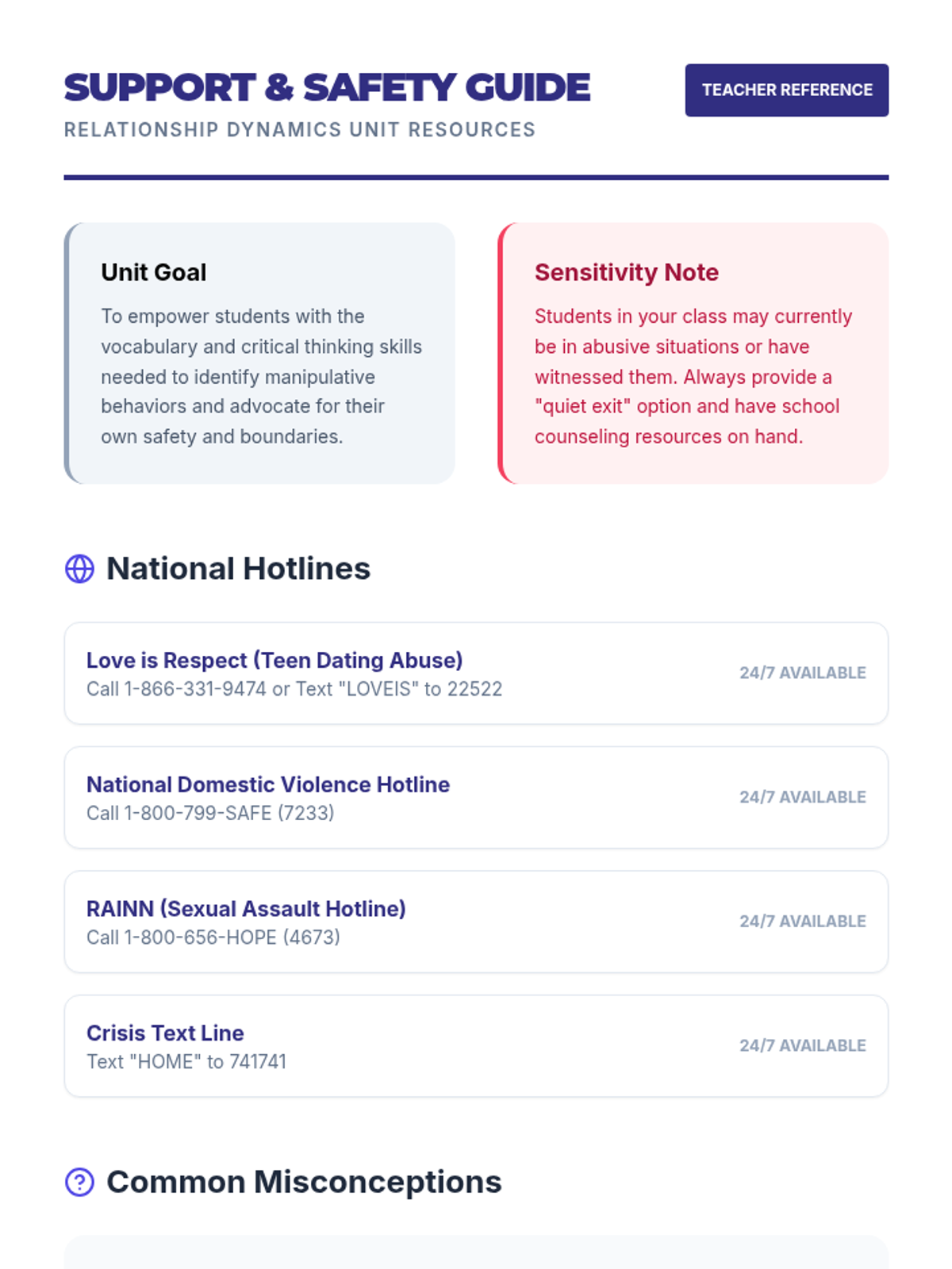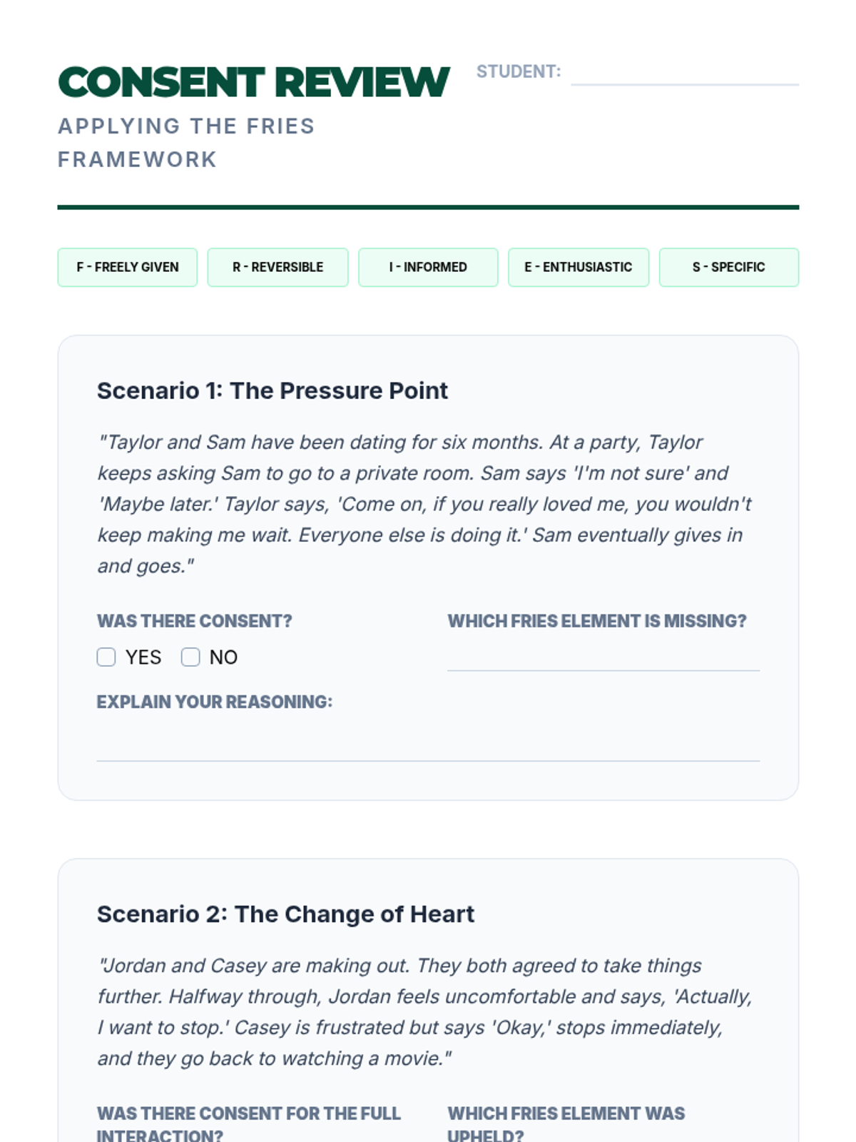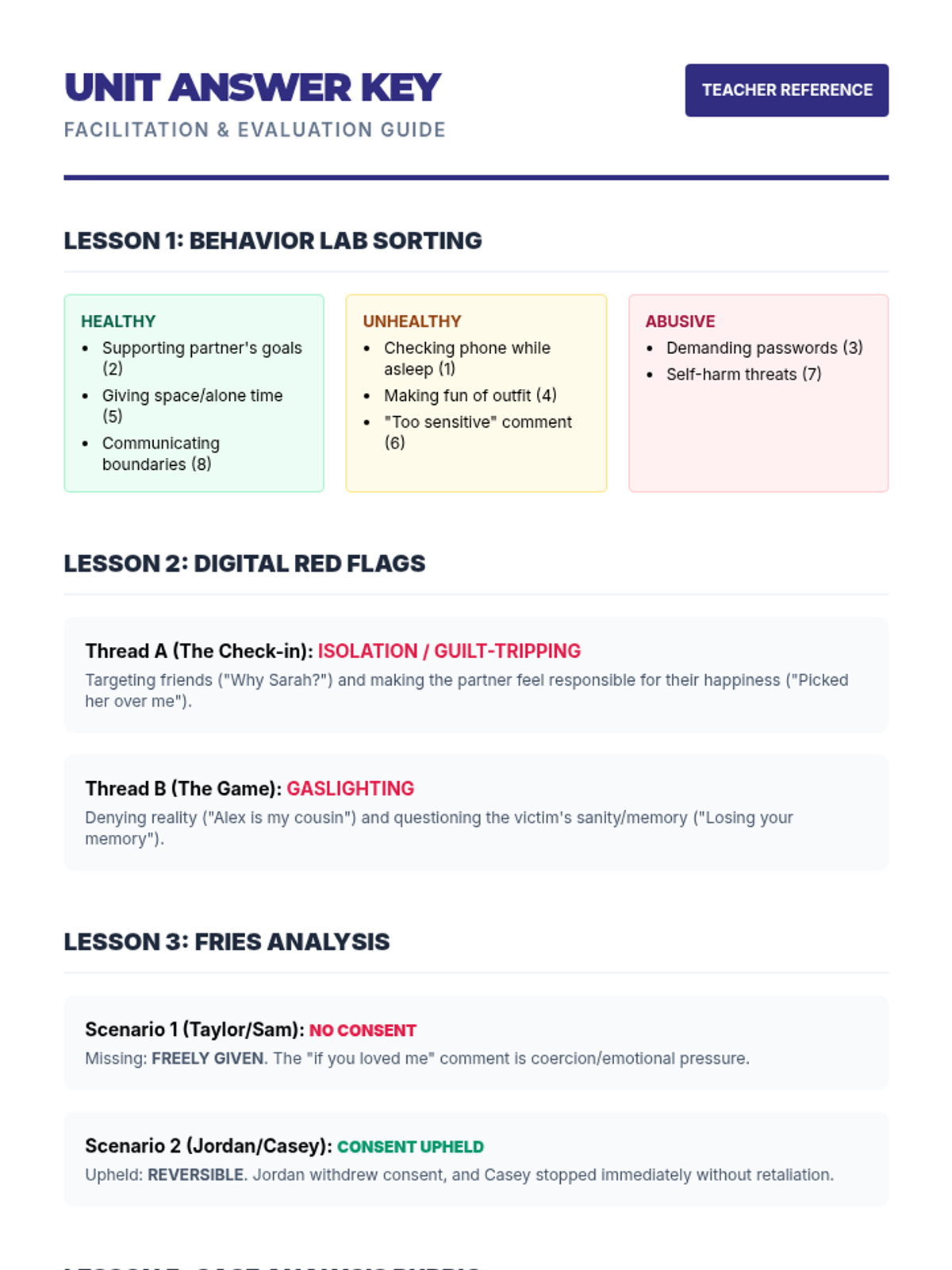 A comprehensive 5-lesson unit for 10th-grade students exploring the nuances of healthy relationships, power dynamics, consent frameworks (FRIES), digital boundaries, and real-world case study analysis. Students move from basic definitions to complex ethical evaluations and safety planning.
