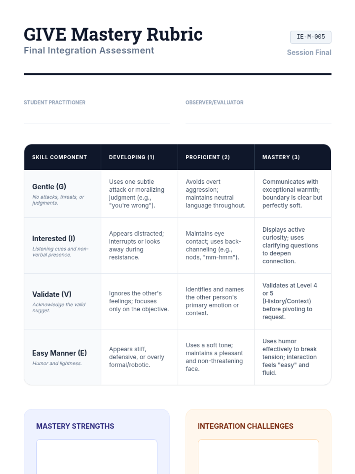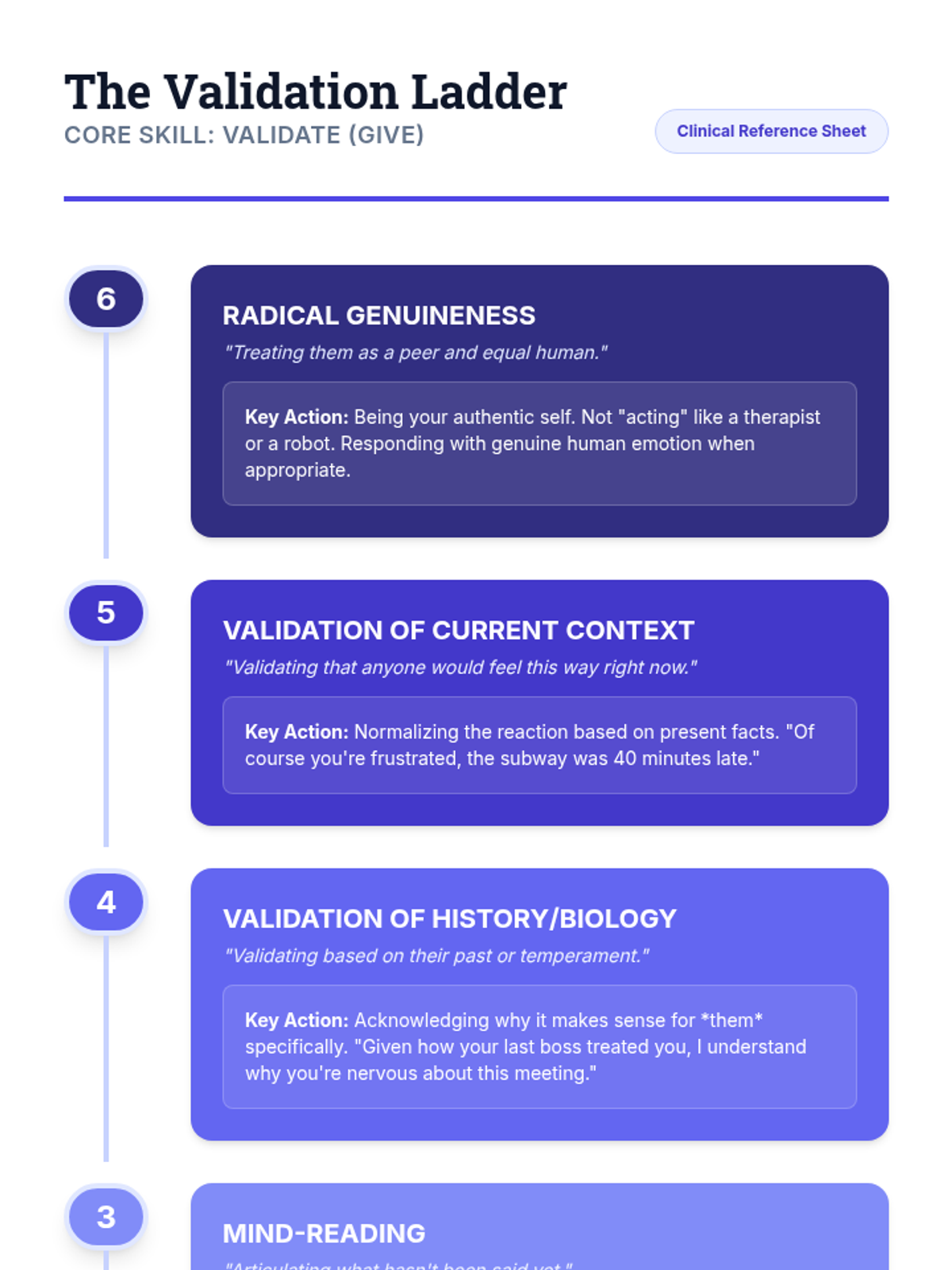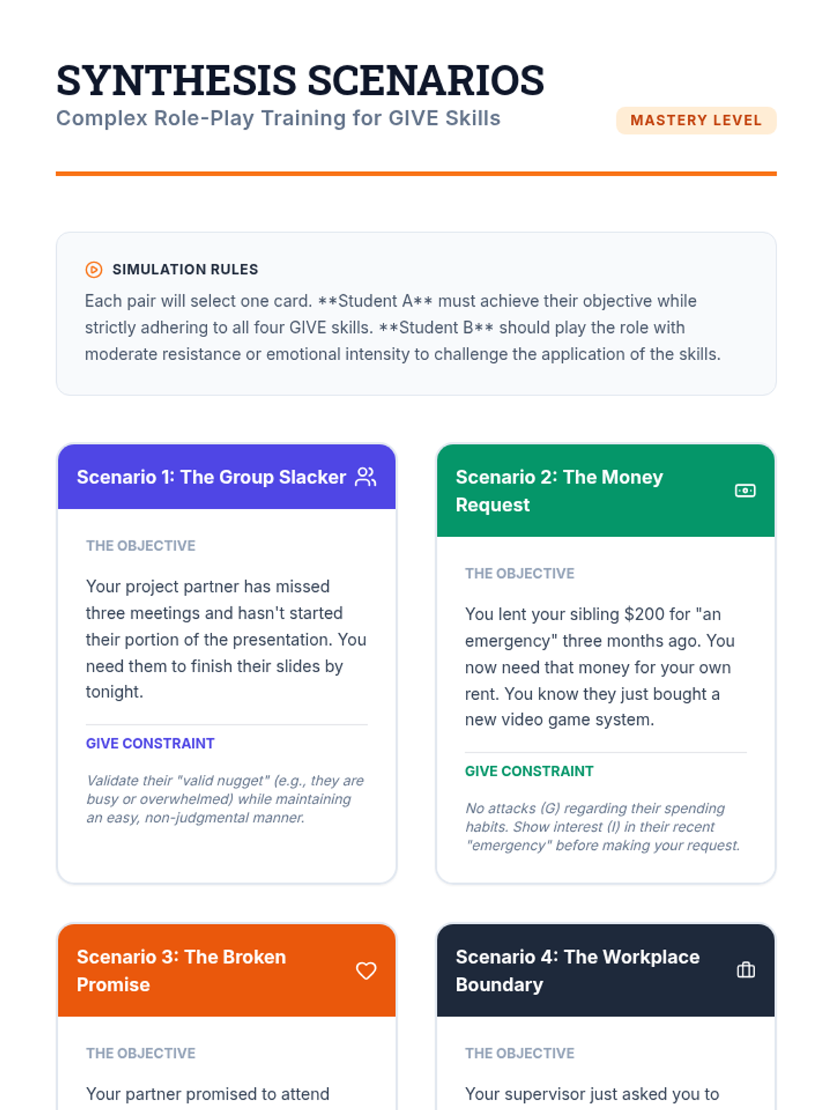 A comprehensive sequence for undergraduate psychology and social work students focusing on the 'GIVE' skill set within Dialectical Behavior Therapy (DBT). This course covers interpersonal effectiveness, prioritizing relationships, and the technical application of gentleness, interest, validation, and an easy manner in therapeutic and personal communication.