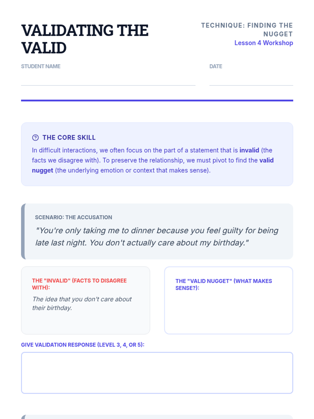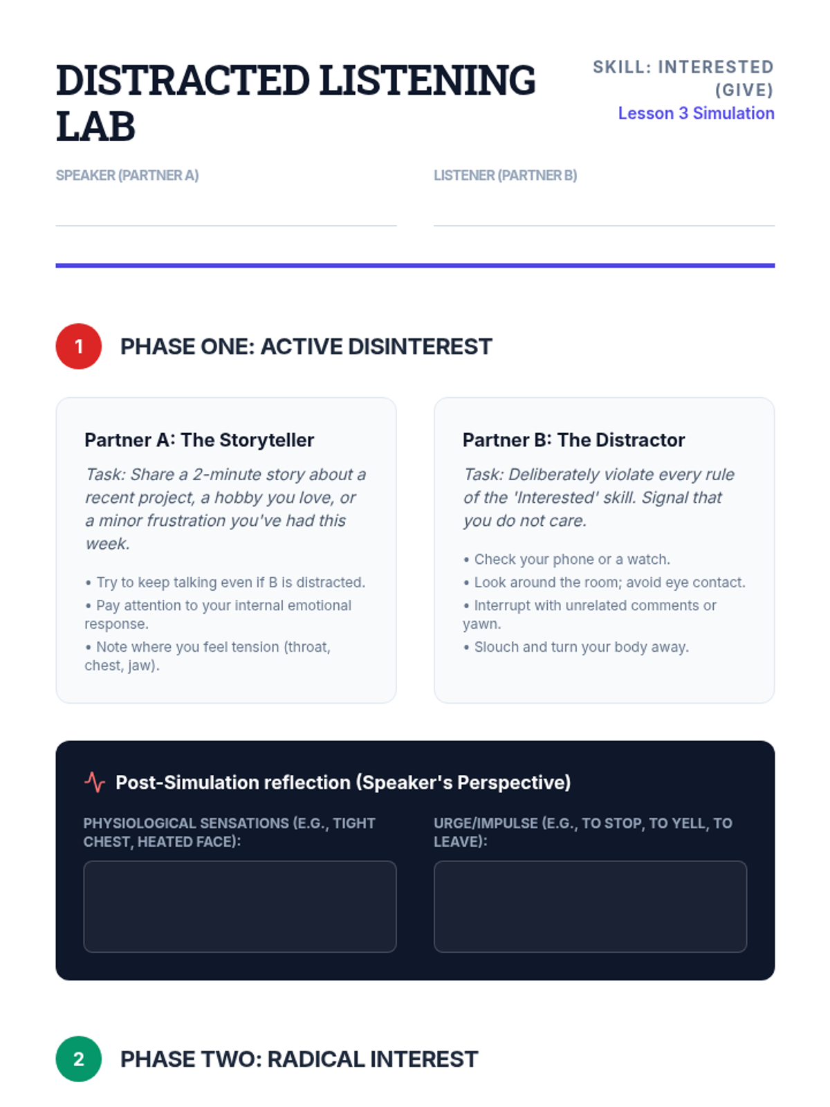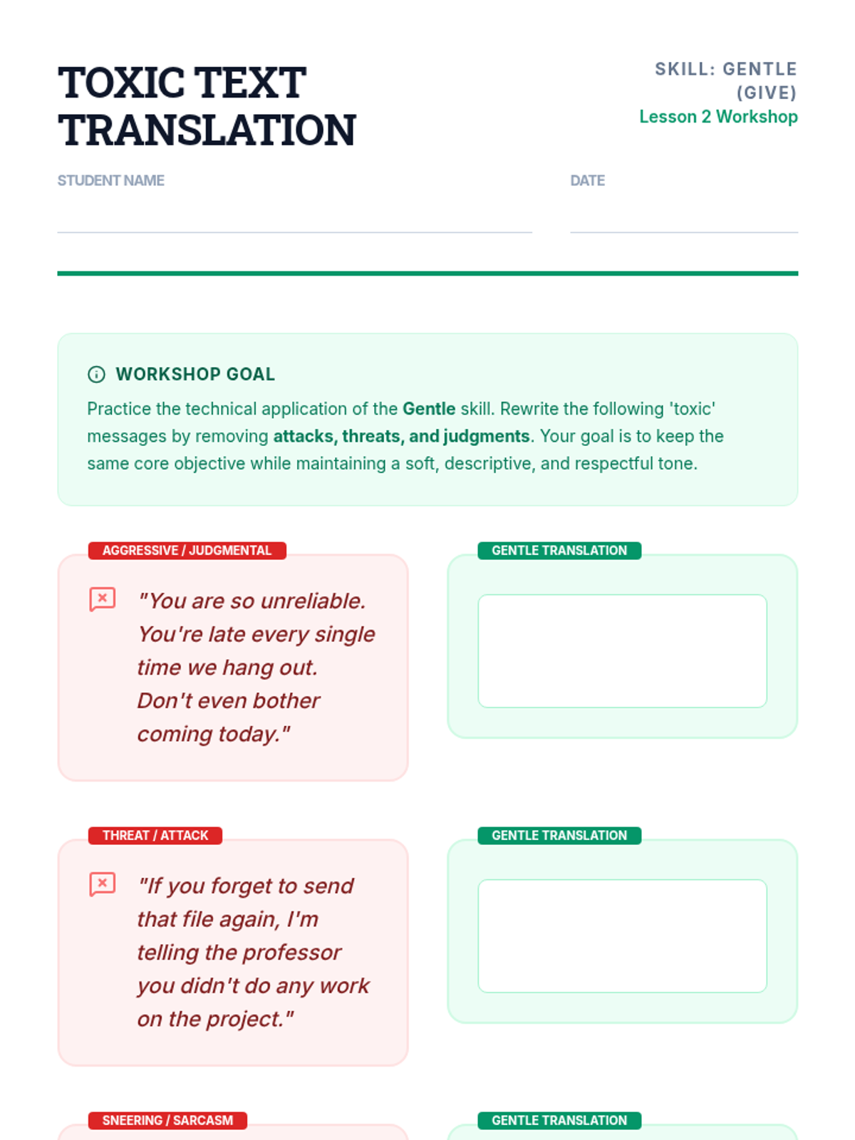 A comprehensive sequence for undergraduate psychology and social work students focusing on the 'GIVE' skill set within Dialectical Behavior Therapy (DBT). This course covers interpersonal effectiveness, prioritizing relationships, and the technical application of gentleness, interest, validation, and an easy manner in therapeutic and personal communication.