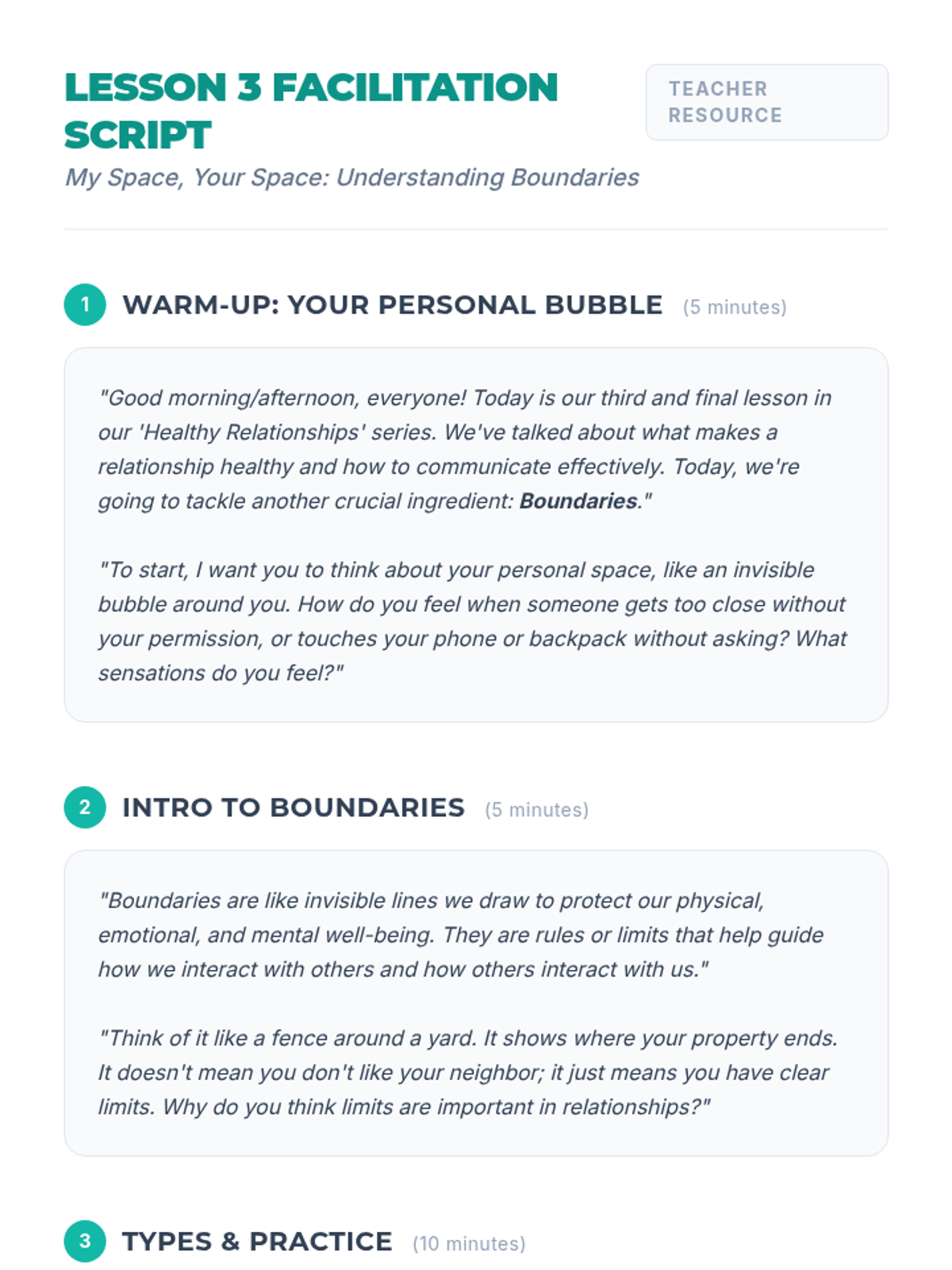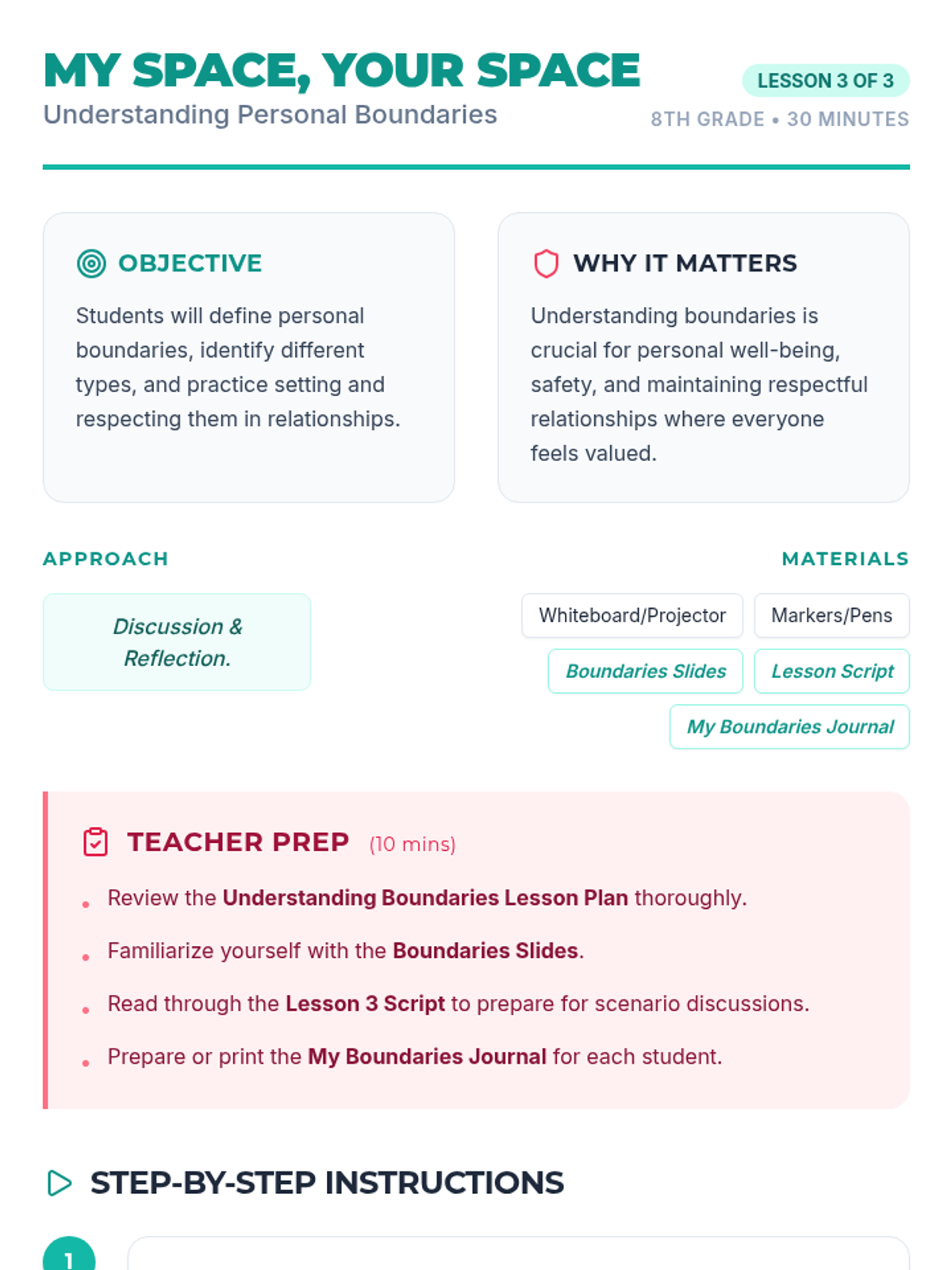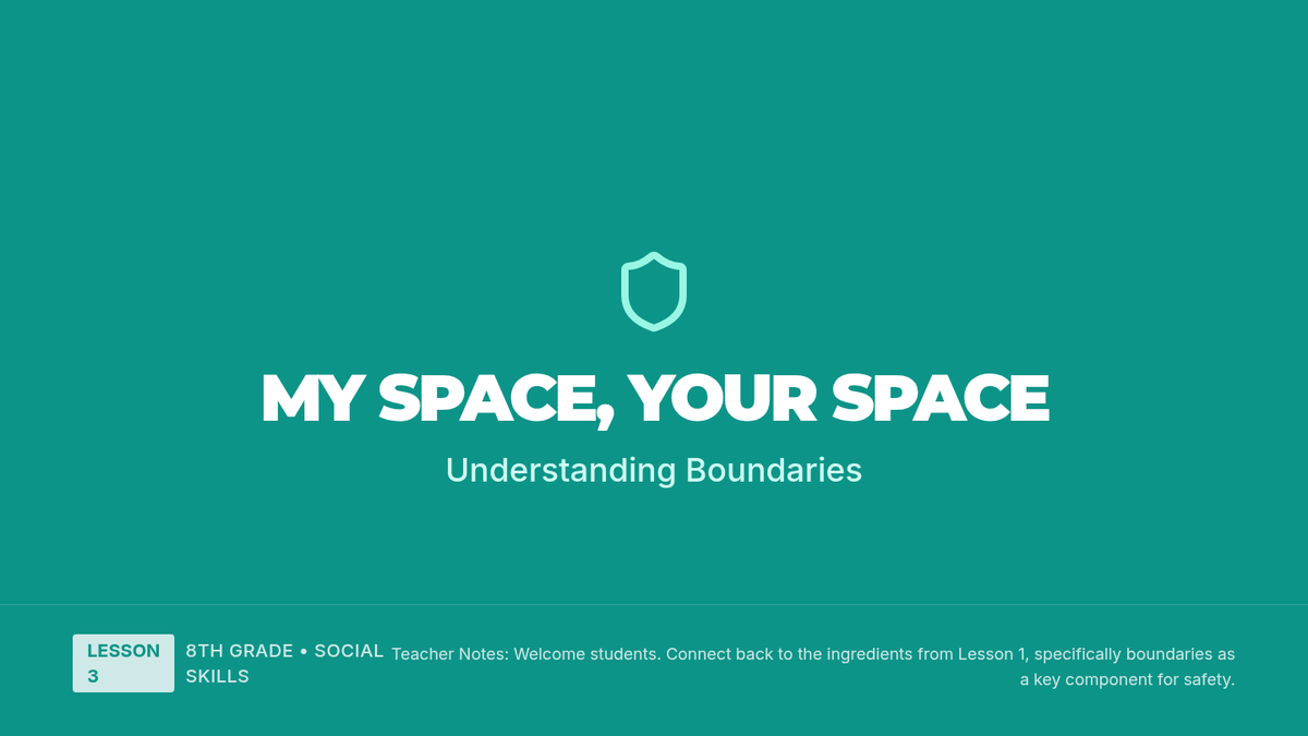 A three-part lesson series for 8th-grade students exploring the foundations of healthy relationships, focusing on communication, respect, and boundaries. Students learn to identify key relationship 'ingredients', practice active listening and 'I' statements, and understand how to set and respect personal boundaries.