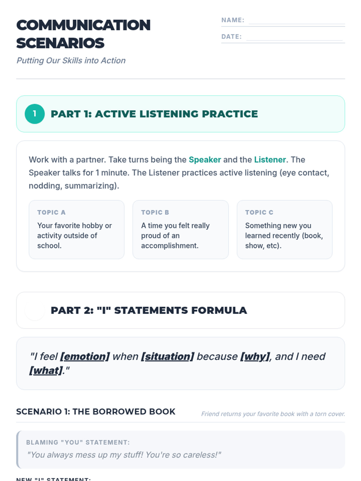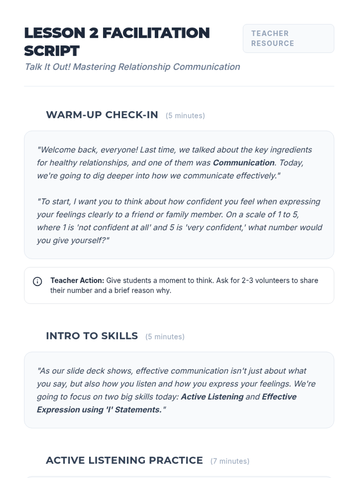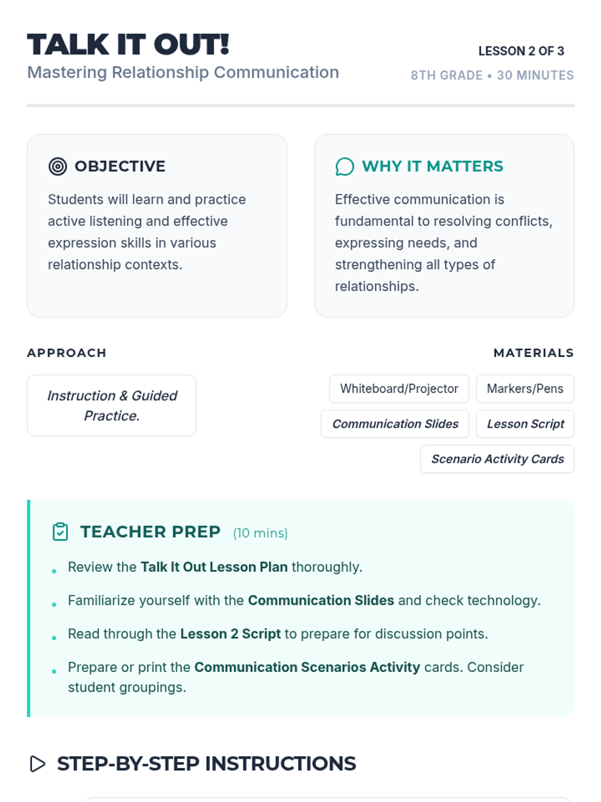 A three-part lesson series for 8th-grade students exploring the foundations of healthy relationships, focusing on communication, respect, and boundaries. Students learn to identify key relationship 'ingredients', practice active listening and 'I' statements, and understand how to set and respect personal boundaries.