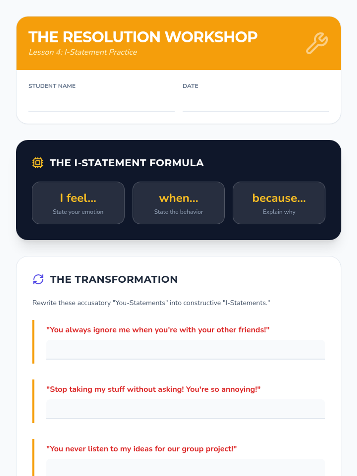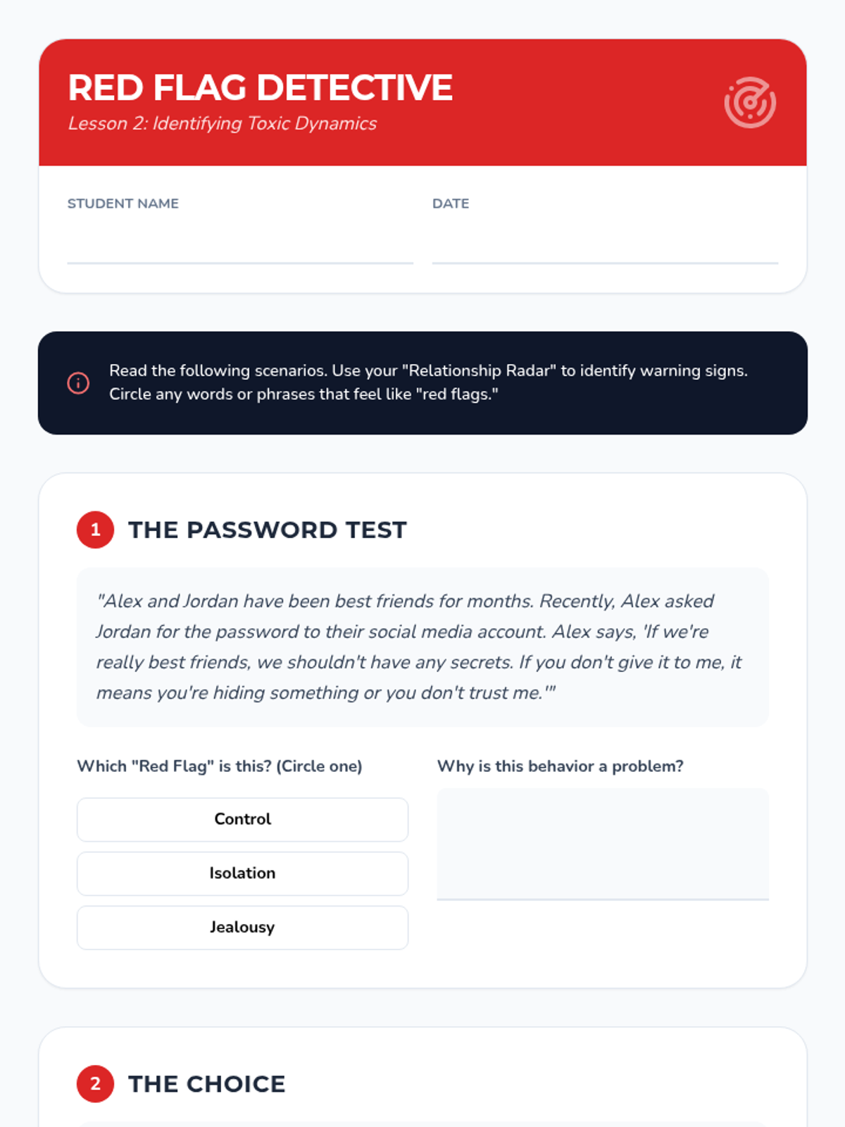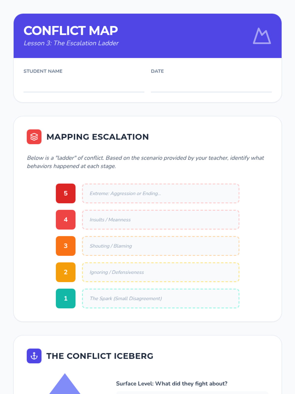 A comprehensive 5-lesson sequence for 6th graders exploring the dynamics of healthy vs. unhealthy relationships, conflict resolution strategies, and support systems. Students learn to identify red flags, use 'I-statements', and build personal resource maps.