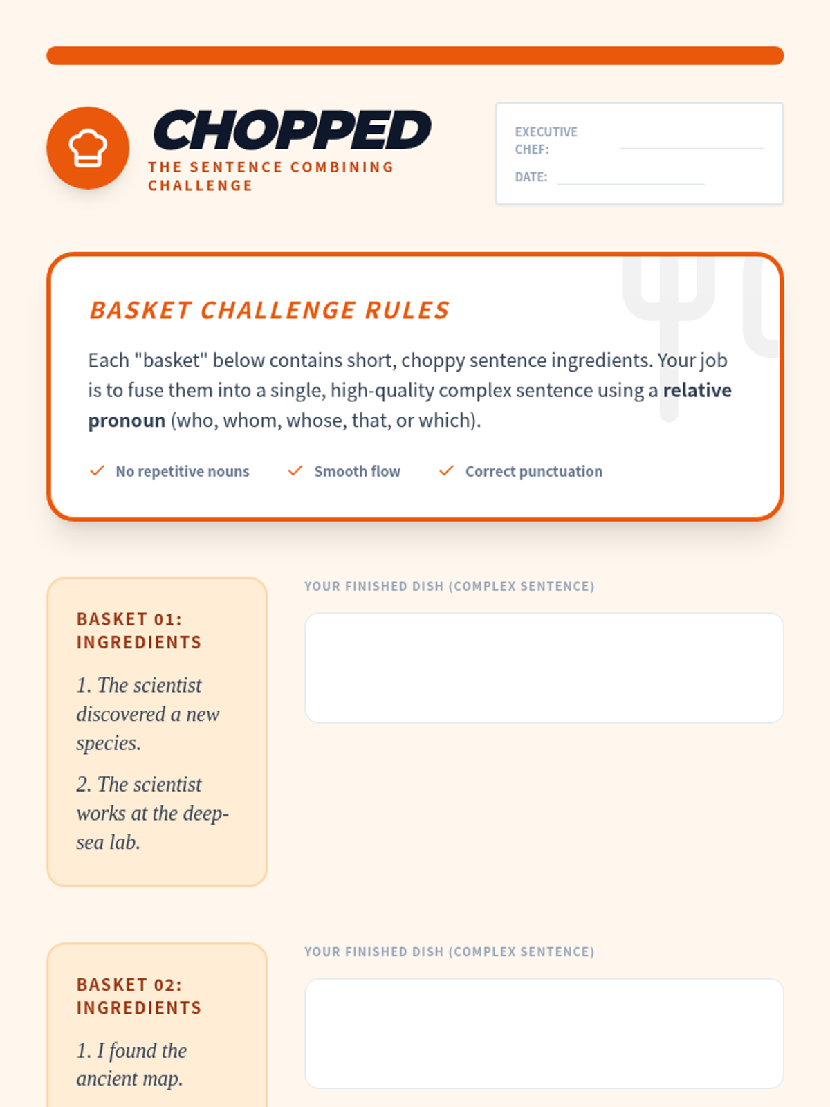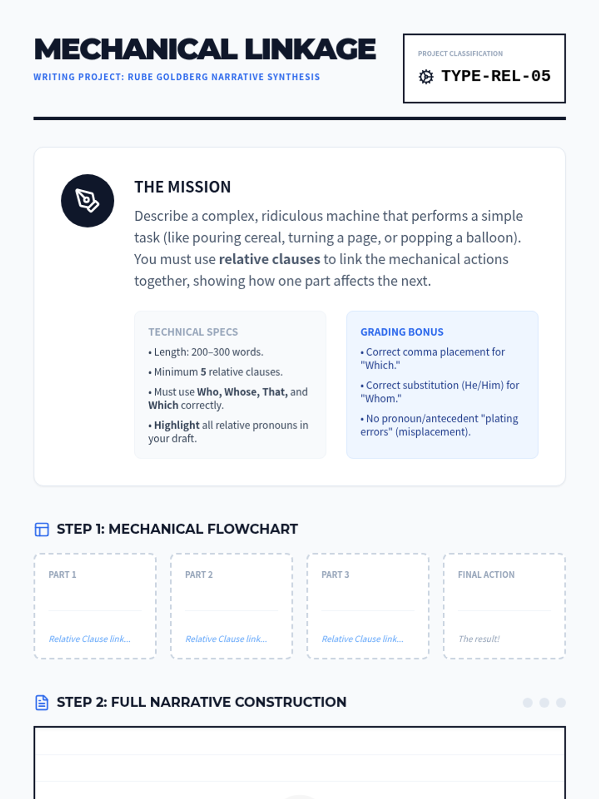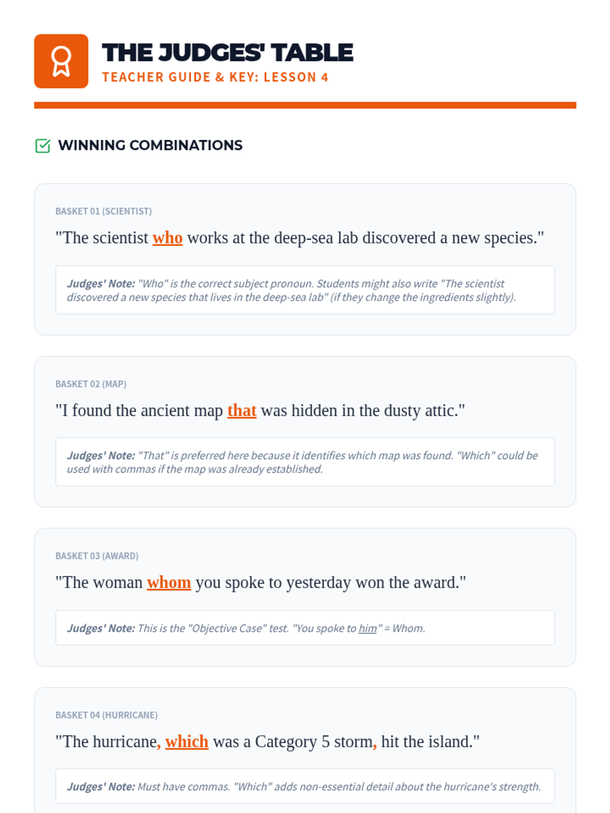 An 8th-grade grammar sequence focusing on relative pronouns as tools for sentence complexity. Students move from analyzing literary examples to mastering tricky distinctions like 'who vs. whom' and 'that vs. which', culminating in creative narrative synthesis.