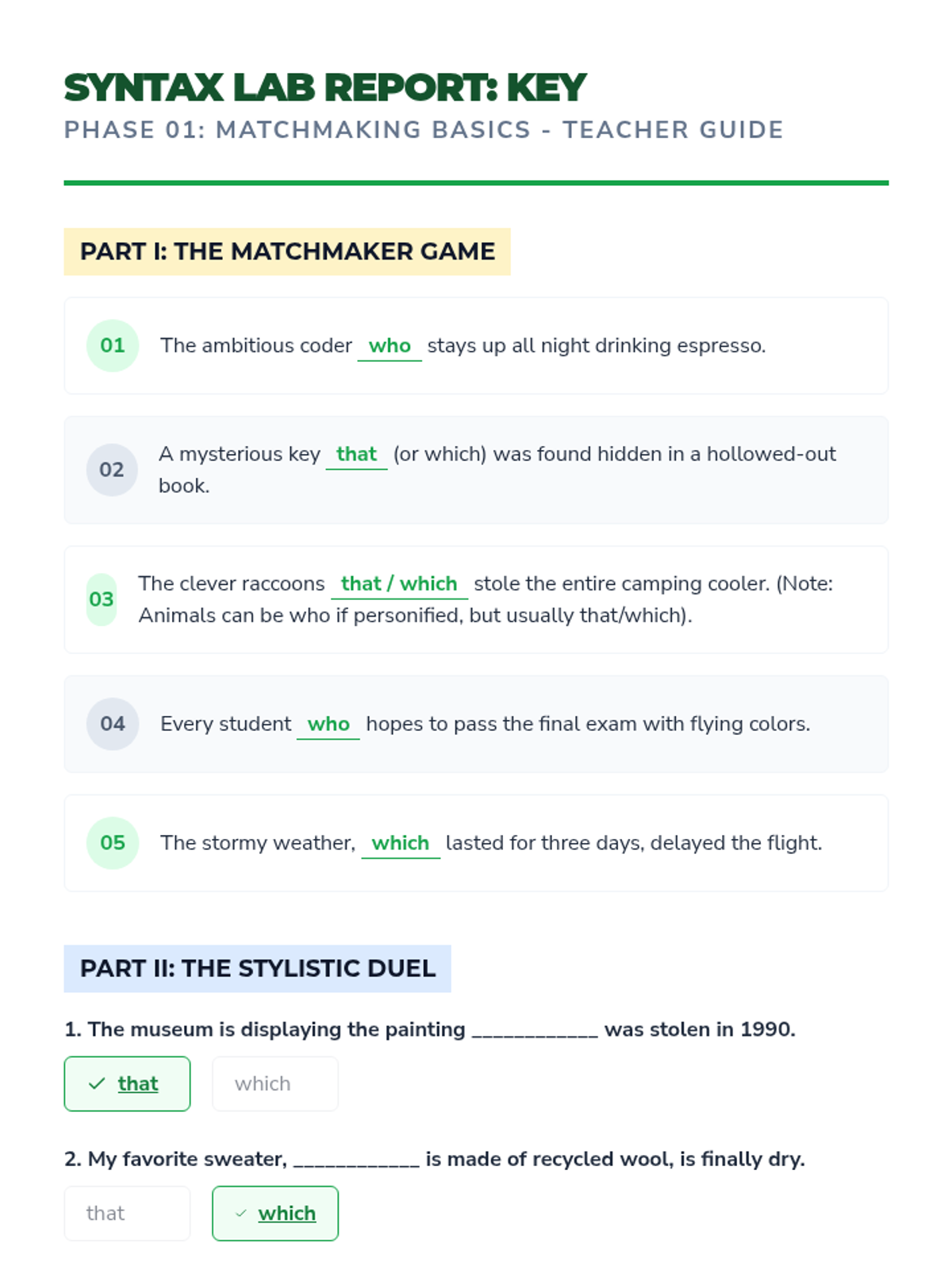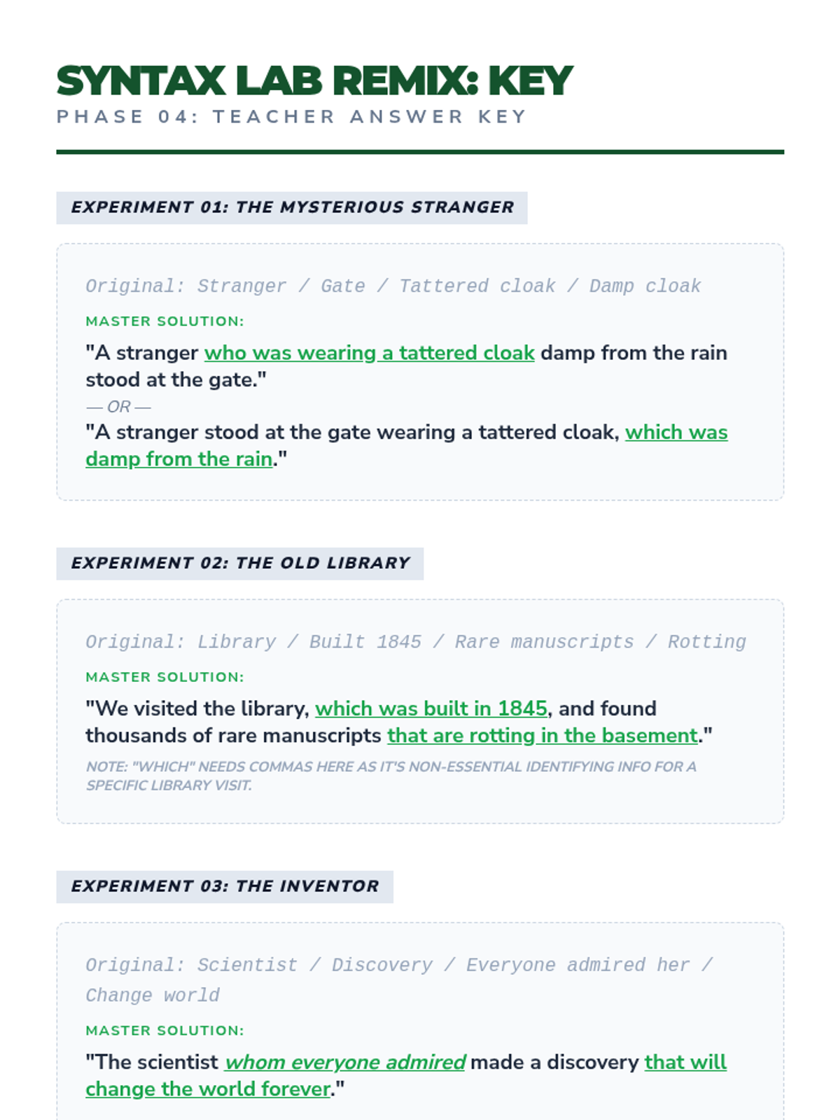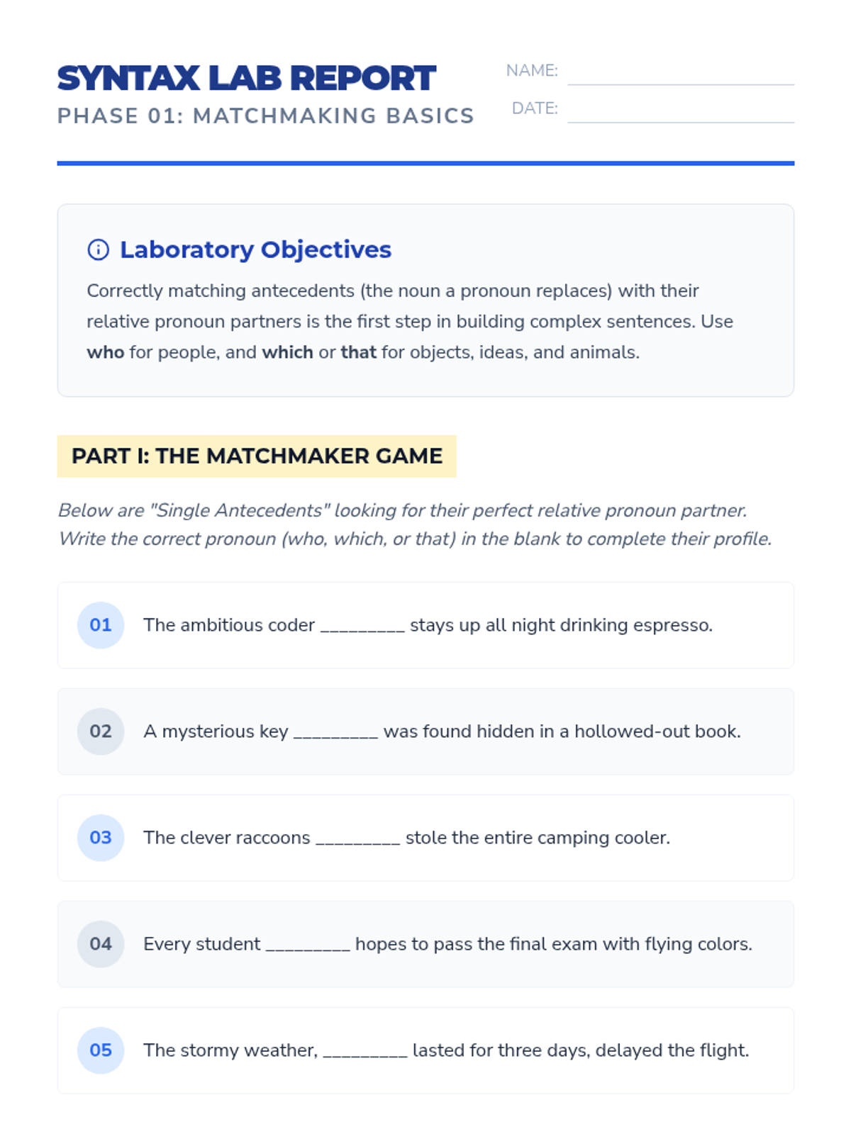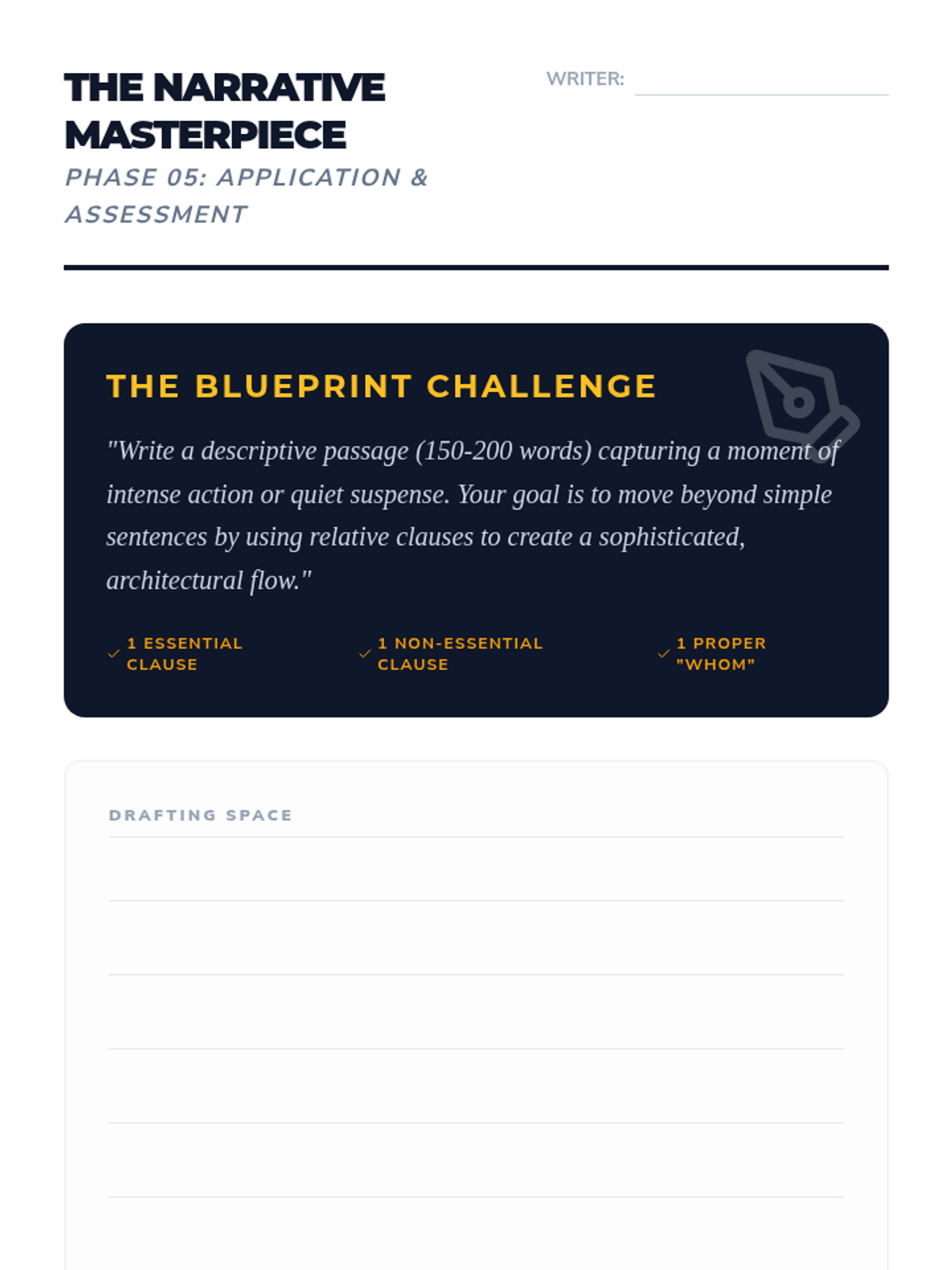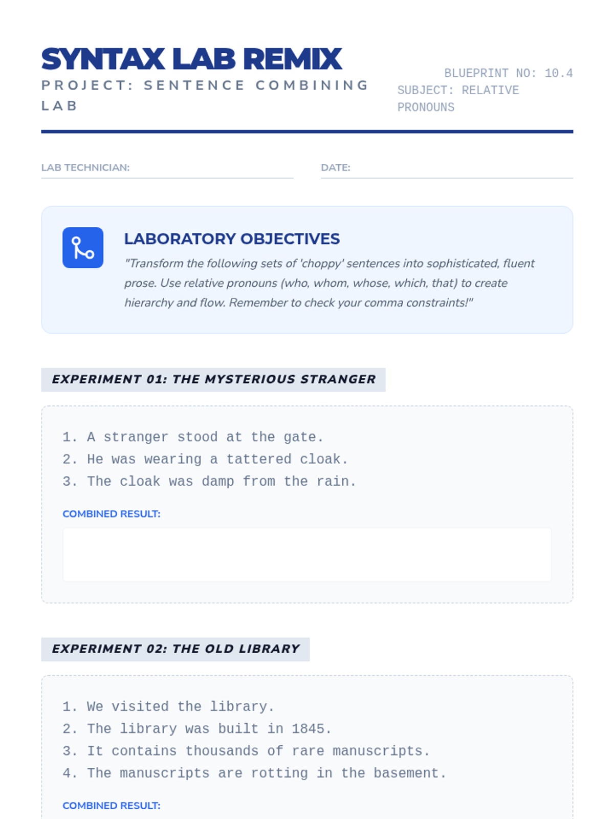 A comprehensive 10th-grade ELA sequence focused on mastering relative pronouns to enhance sentence variety and prose fluency. Students progress from basic identification to complex sentence synthesis and narrative application.