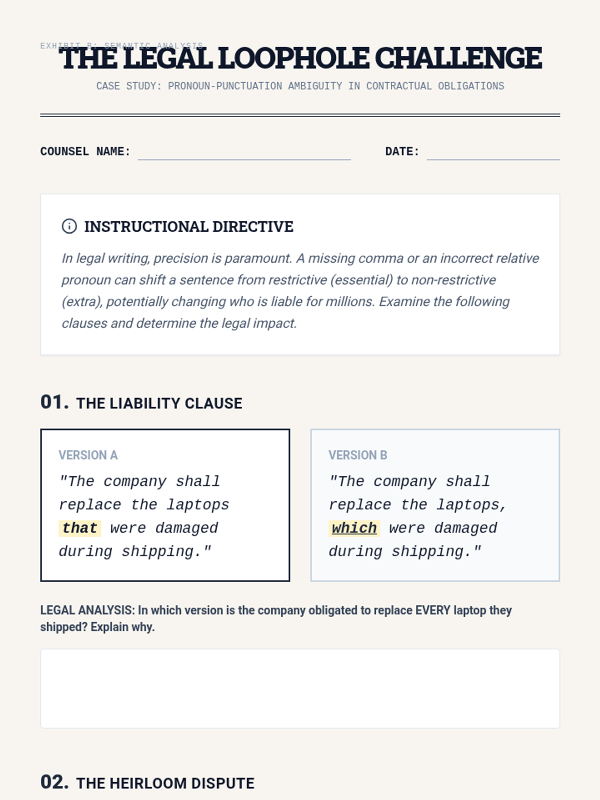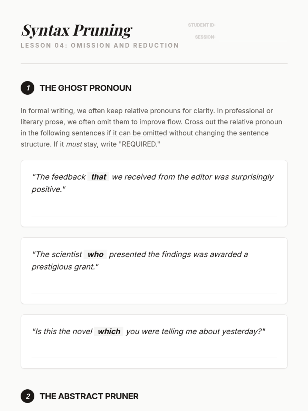 A high-level grammar sequence for 12th graders focused on using relative pronouns to enhance sentence complexity and variety. Students move from clause identification to sophisticated stylistic choices, including restrictive vs. non-restrictive distinctions and reduced relative clauses.