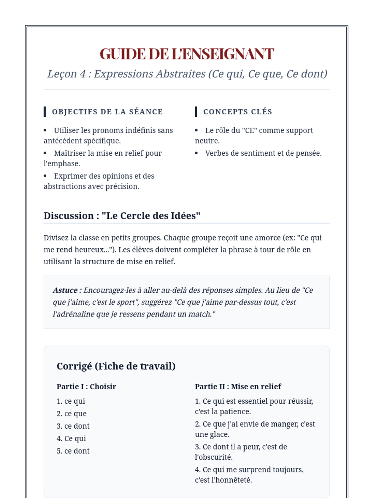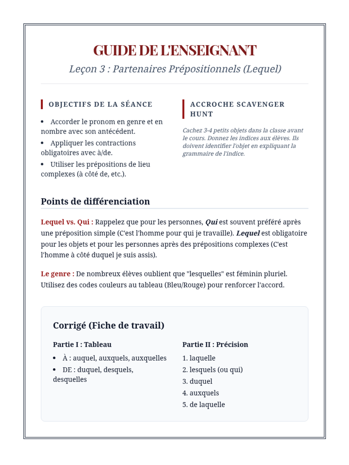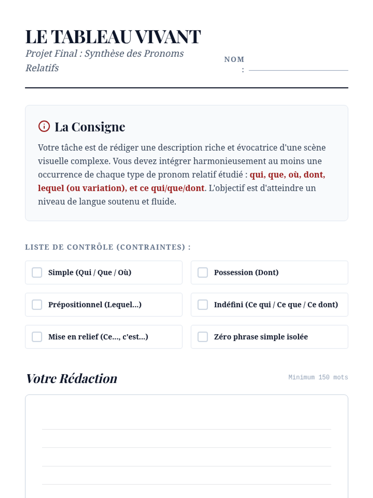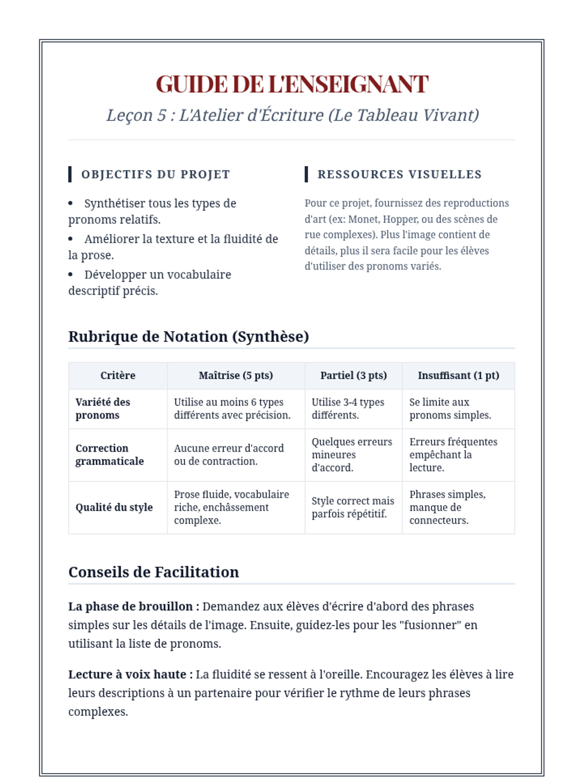A comprehensive advanced French grammar sequence for 10th-grade students focused on mastering simple and complex relative pronouns to enhance sentence variety and writing sophistication. Students progress from basic functions to complex prepositional structures and indefinite relatives, culminating in a descriptive writing workshop.