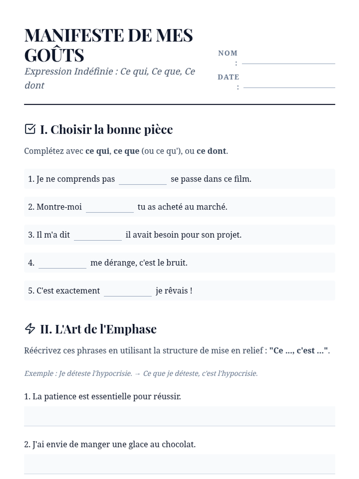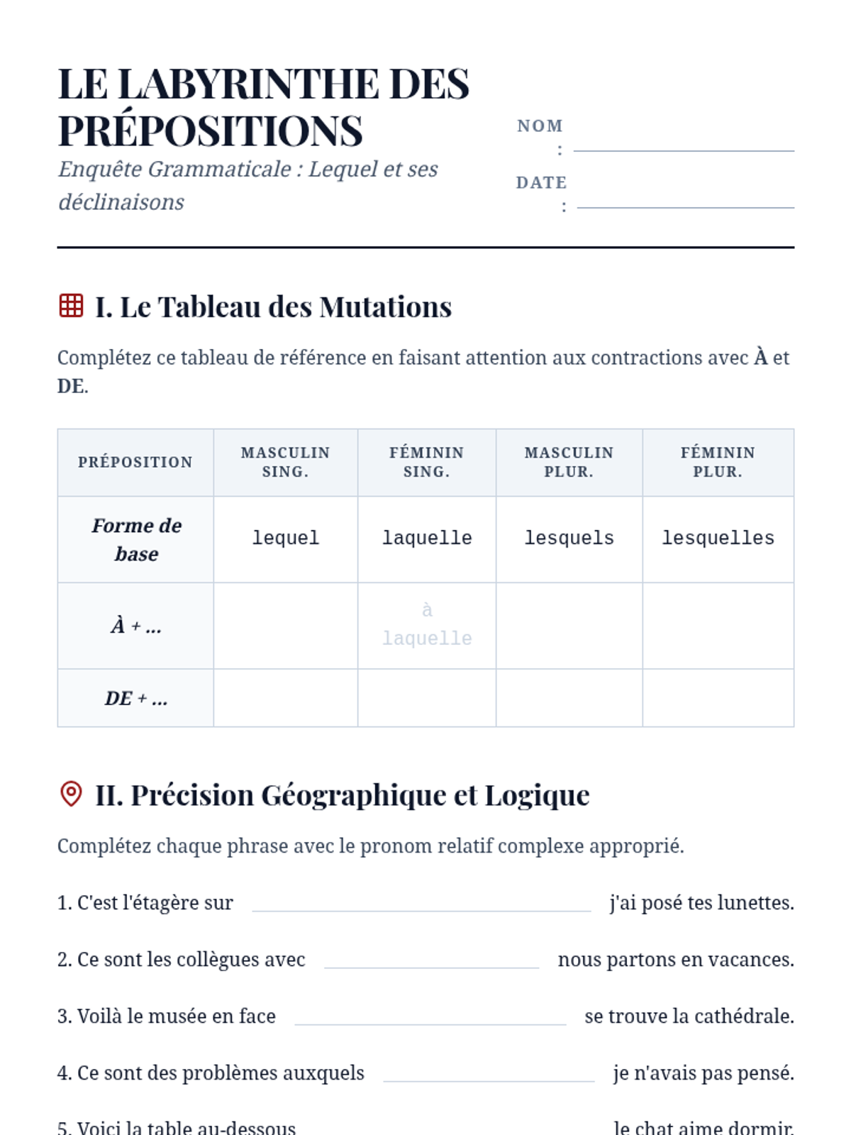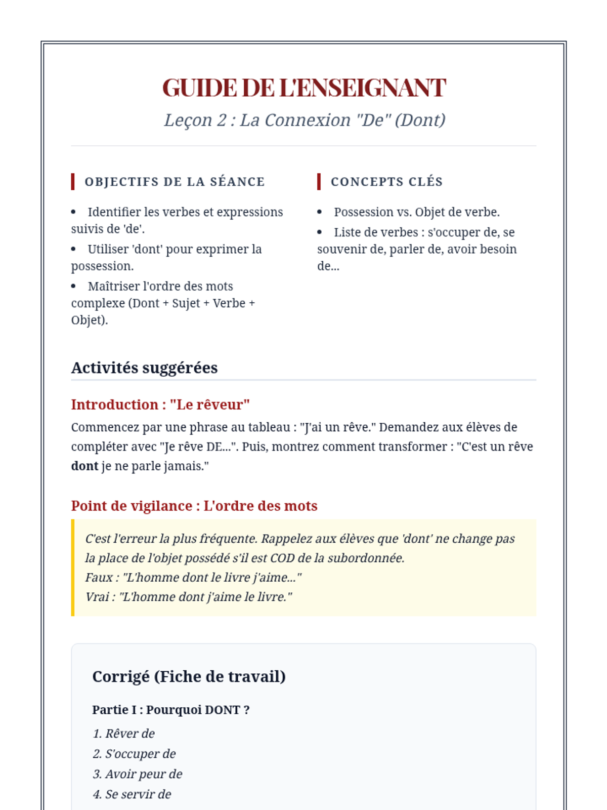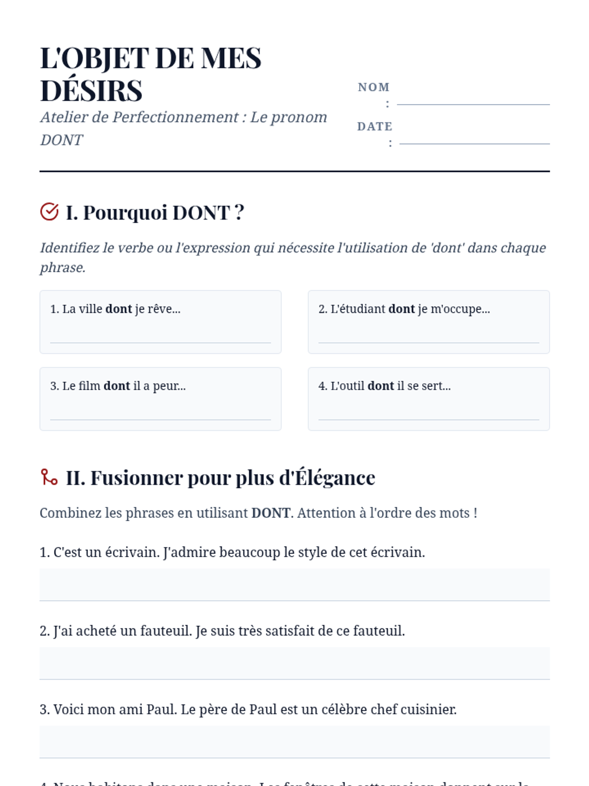 A comprehensive advanced French grammar sequence for 10th-grade students focused on mastering simple and complex relative pronouns to enhance sentence variety and writing sophistication. Students progress from basic functions to complex prepositional structures and indefinite relatives, culminating in a descriptive writing workshop.
