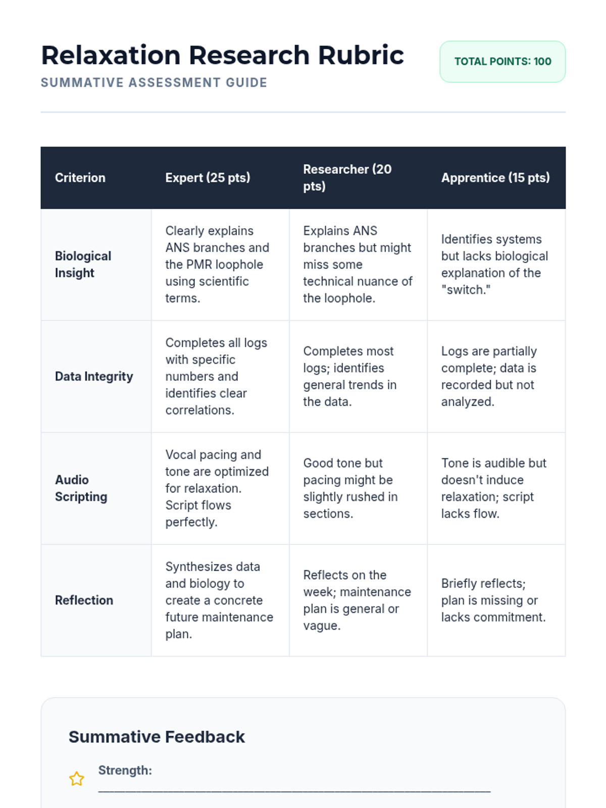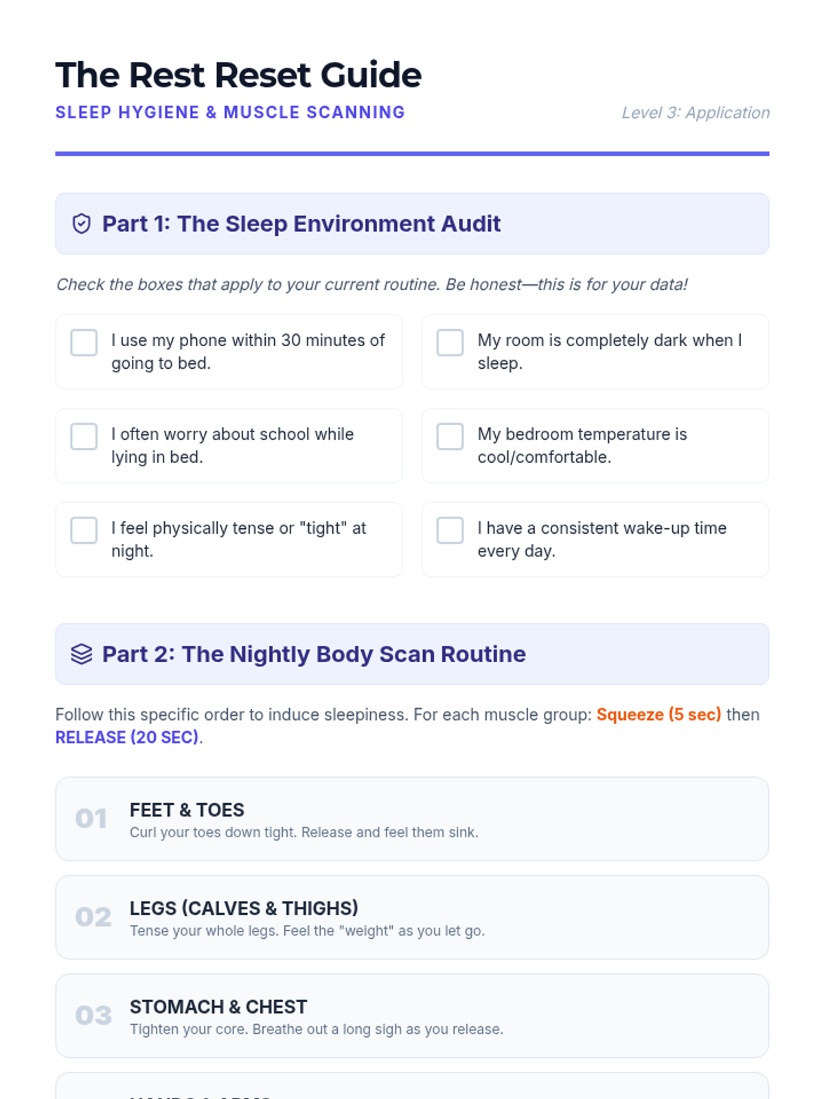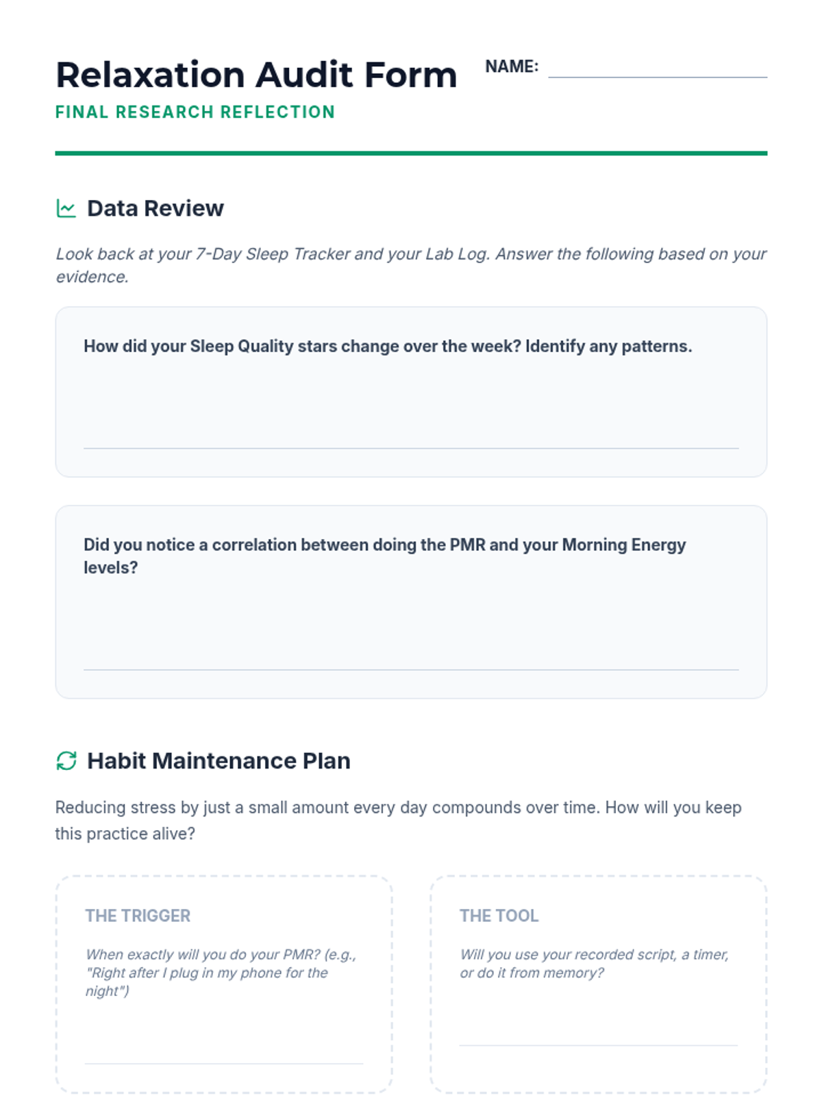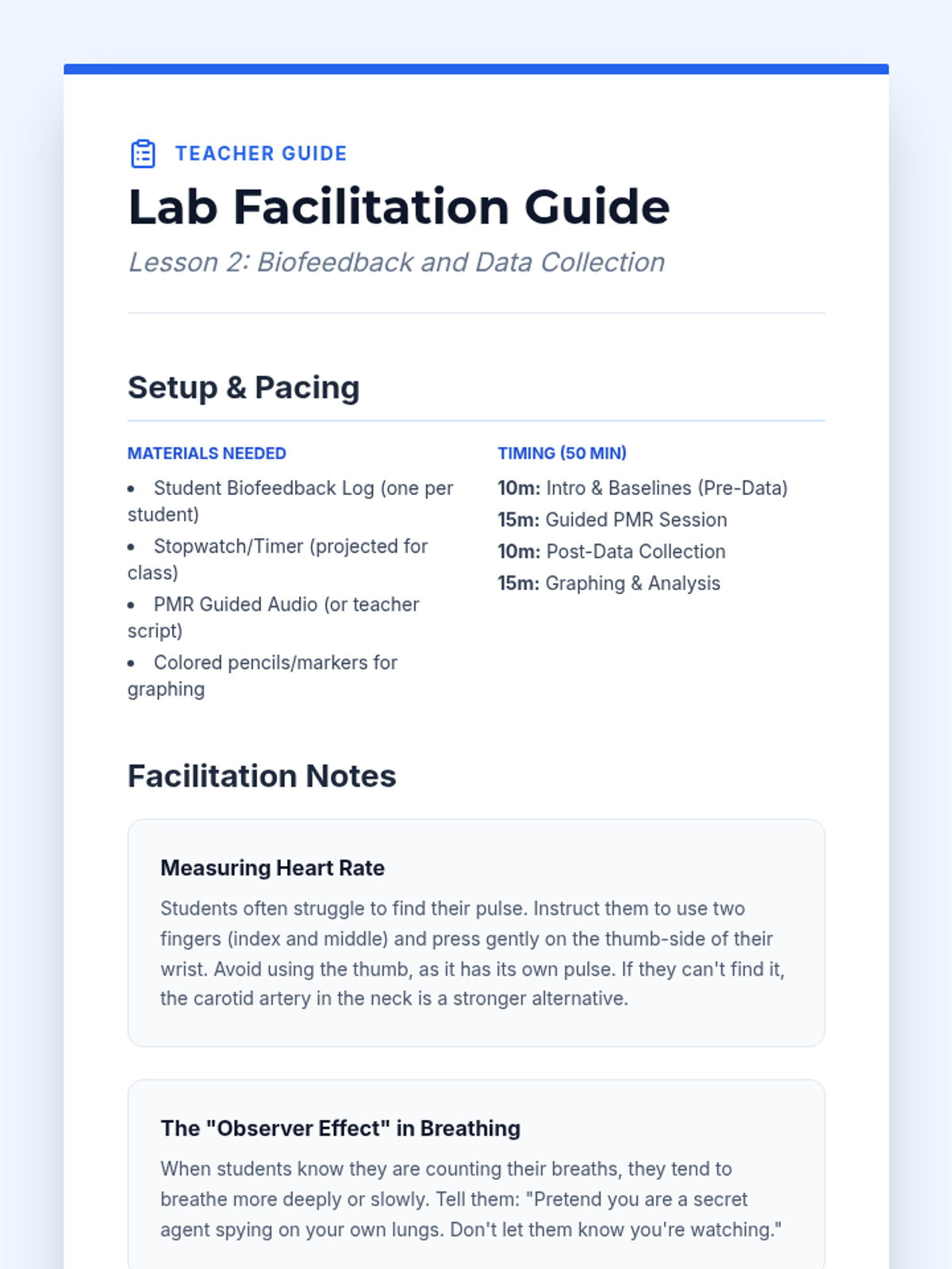 A 7th-grade inquiry-based sequence that investigates the physiological effects of relaxation on the nervous system. Students act as researchers, collecting data on their own vitals and sleep patterns while mastering Progressive Muscle Relaxation (PMR).
