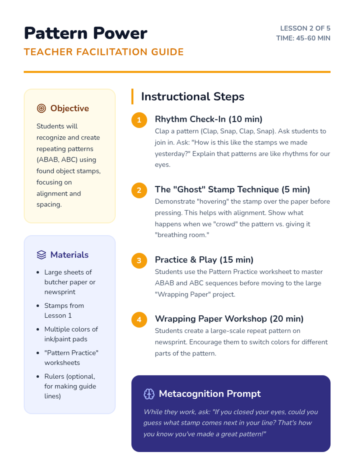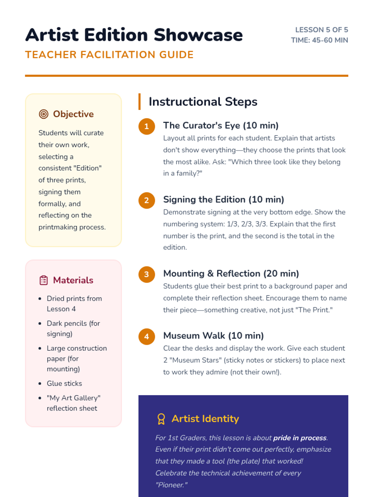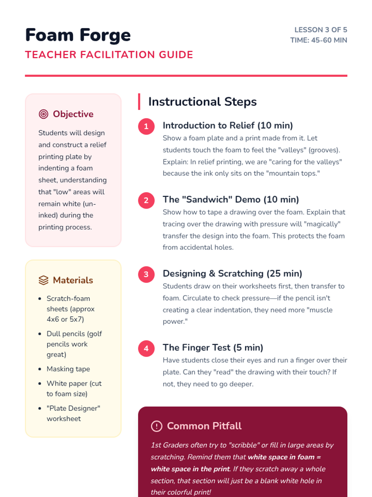 A 1st Grade sequence introducing relief printing, from found object stamping to creating original scratch-foam plate editions. Students explore texture, pattern, and the technical process of inking and pulling prints.