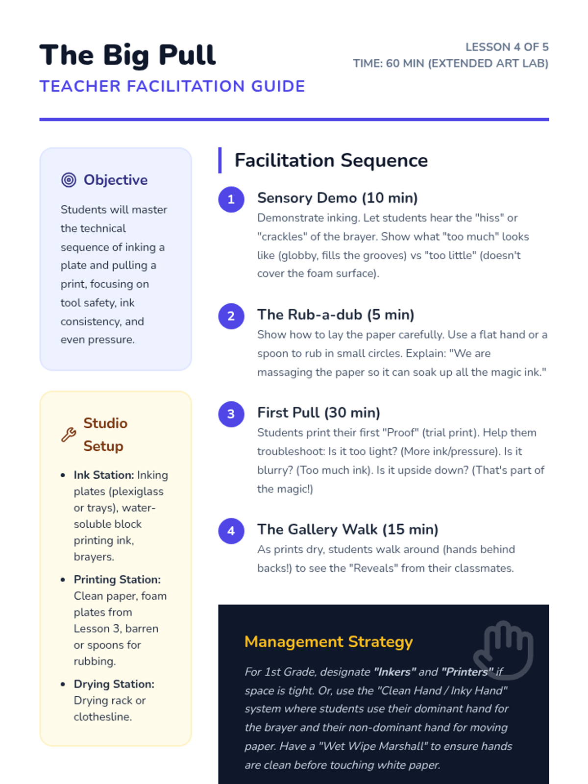 A 1st-grade sequence exploring tactile art through rubbings and collagraphy, teaching students how textures can be transferred into prints. Students hunt for textures, build 3D printing plates, and experiment with ink and pressure.