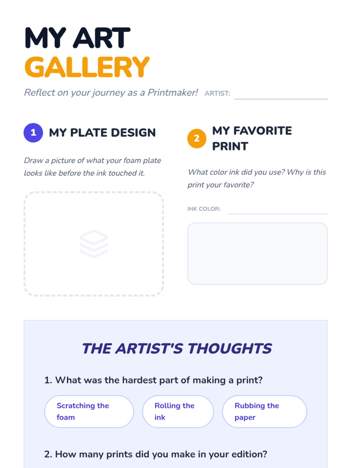 Students explore relief printing using soft foam plates, focusing on positive and negative space, inking techniques, and pattern creation. The sequence culminates in a professional-style edition of prints and a gallery walk critique.