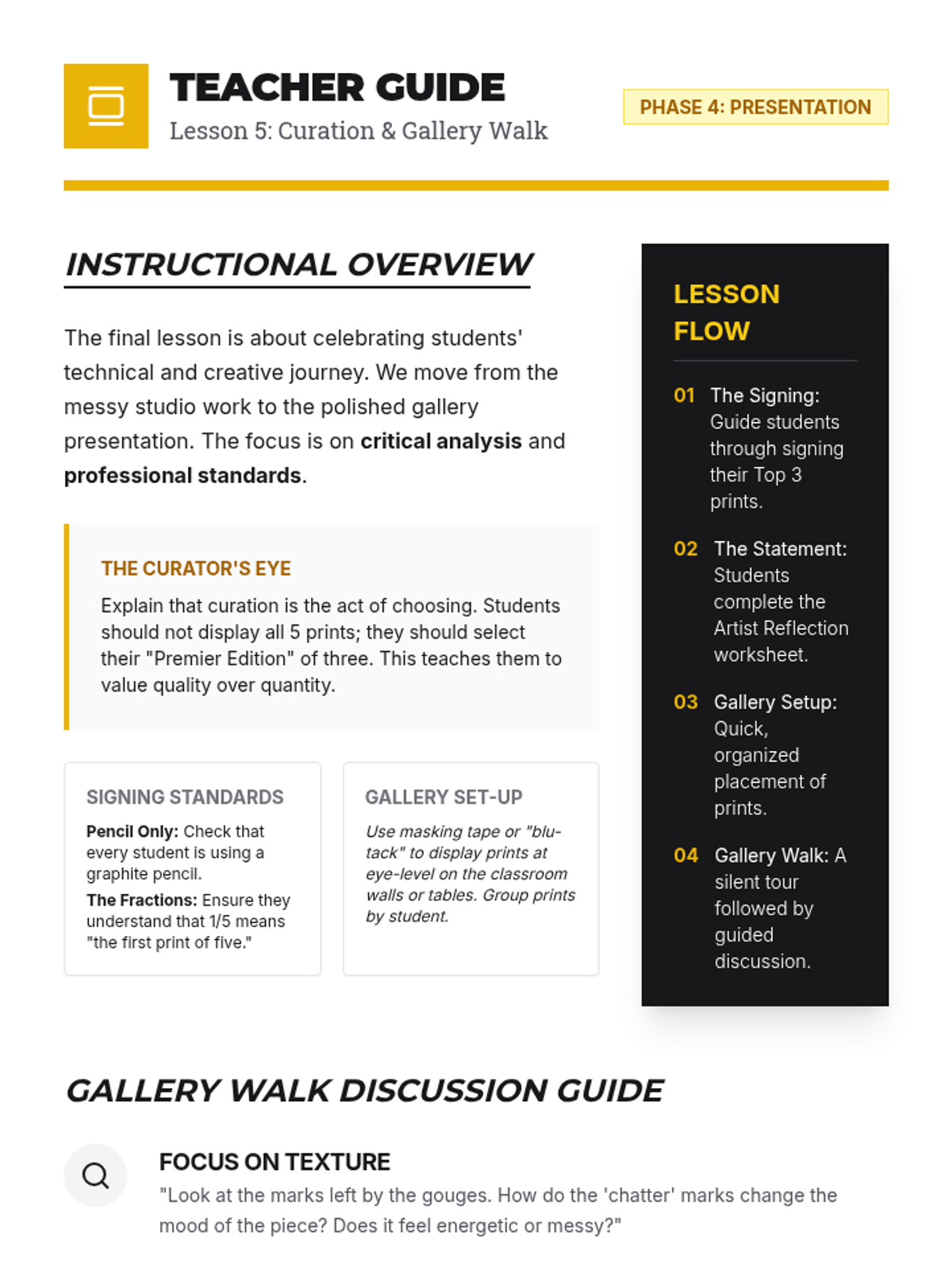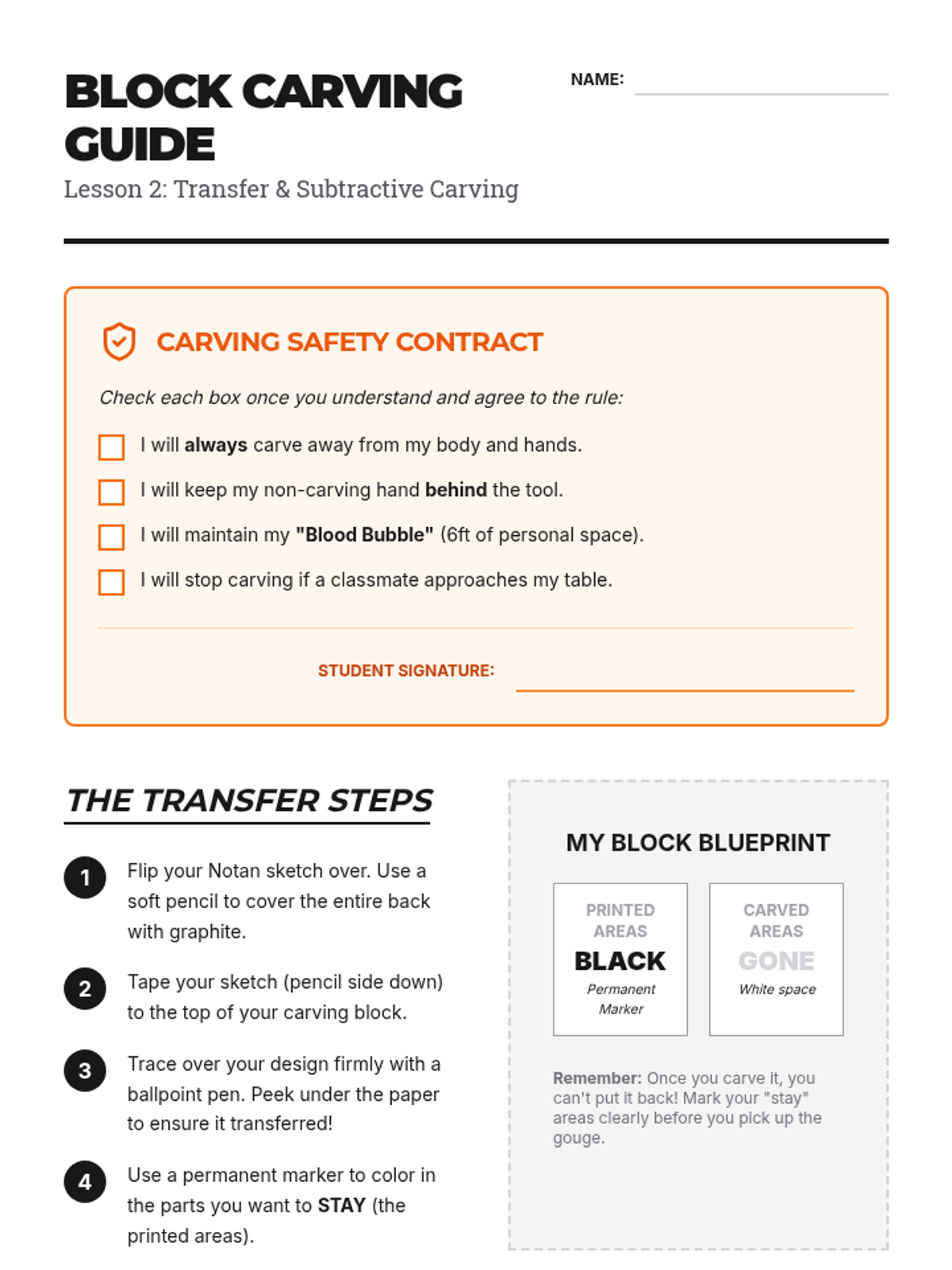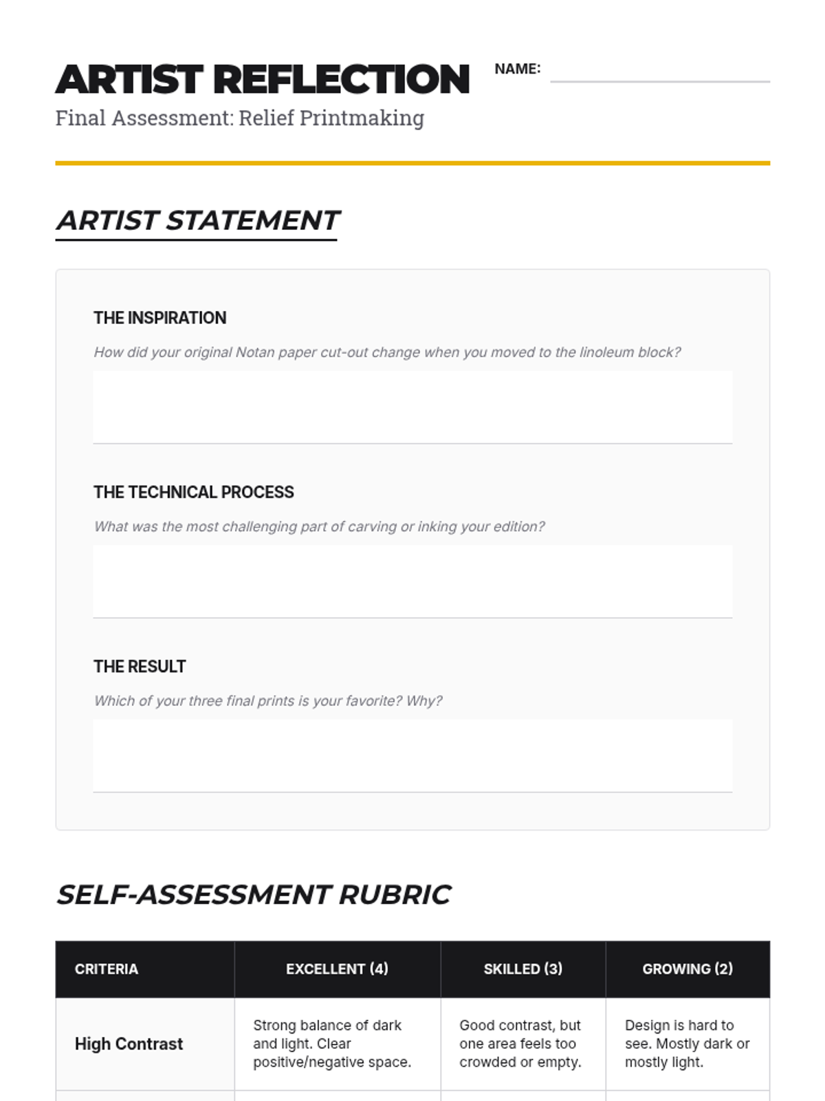 A comprehensive introduction to relief printmaking for 6th-grade students. This sequence covers design principles using Notan, safety protocols for carving, technical inking skills, professional editioning standards, and final gallery presentation.