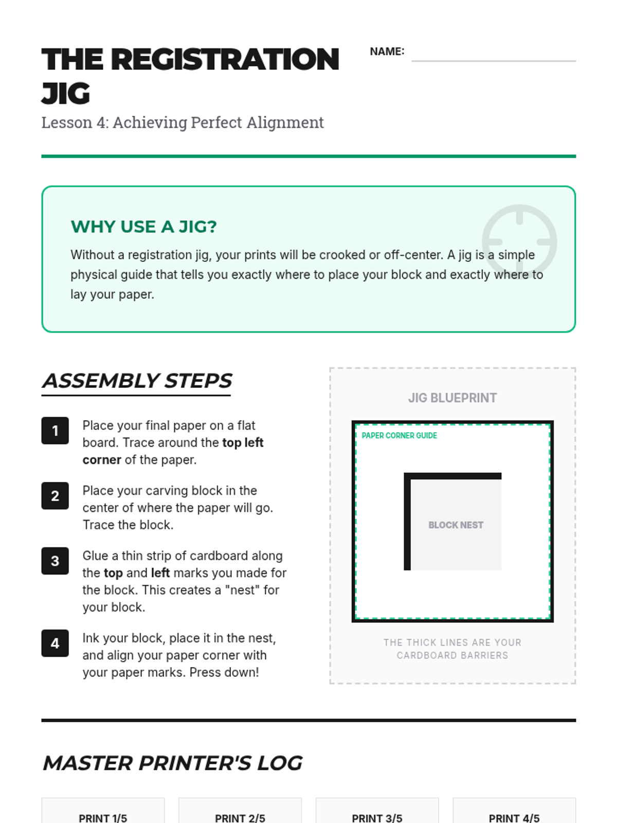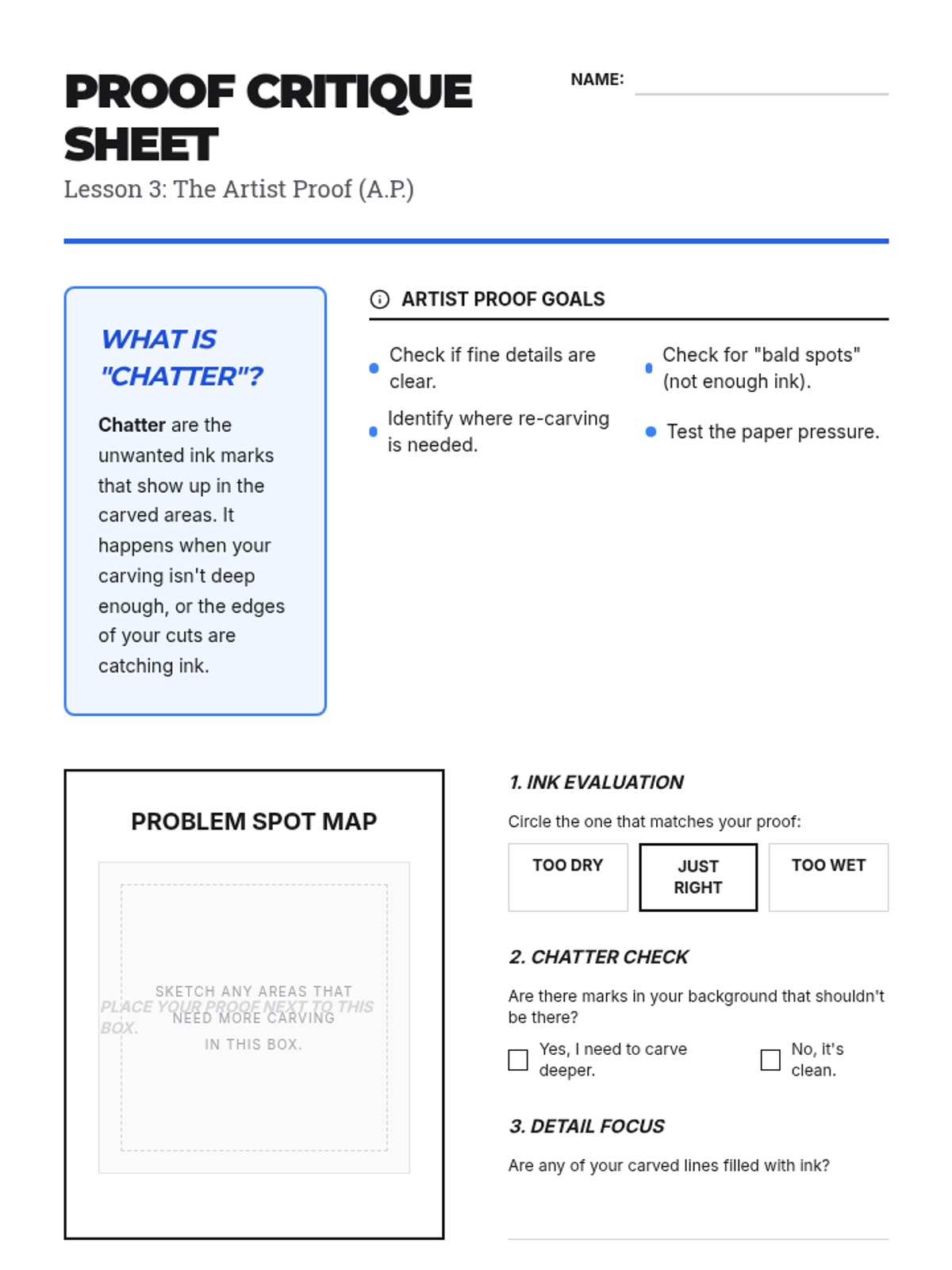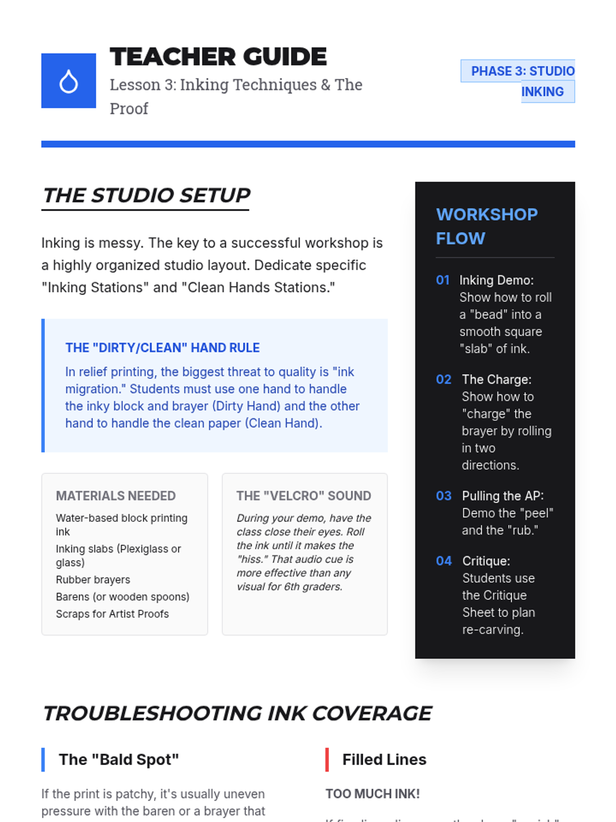 A comprehensive introduction to relief printmaking for 6th-grade students. This sequence covers design principles using Notan, safety protocols for carving, technical inking skills, professional editioning standards, and final gallery presentation.
