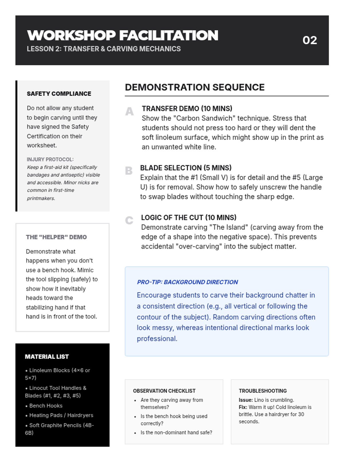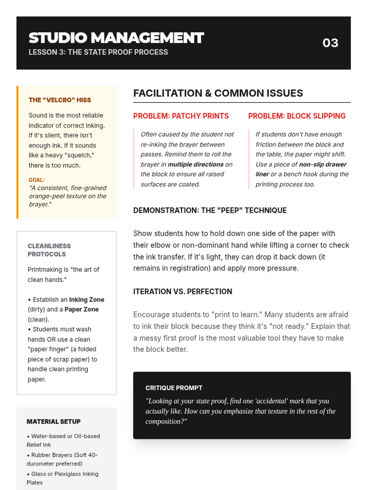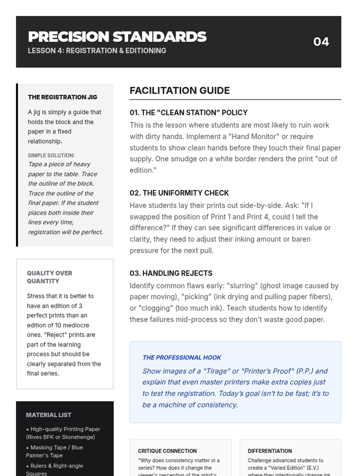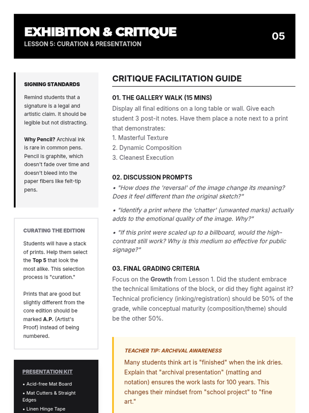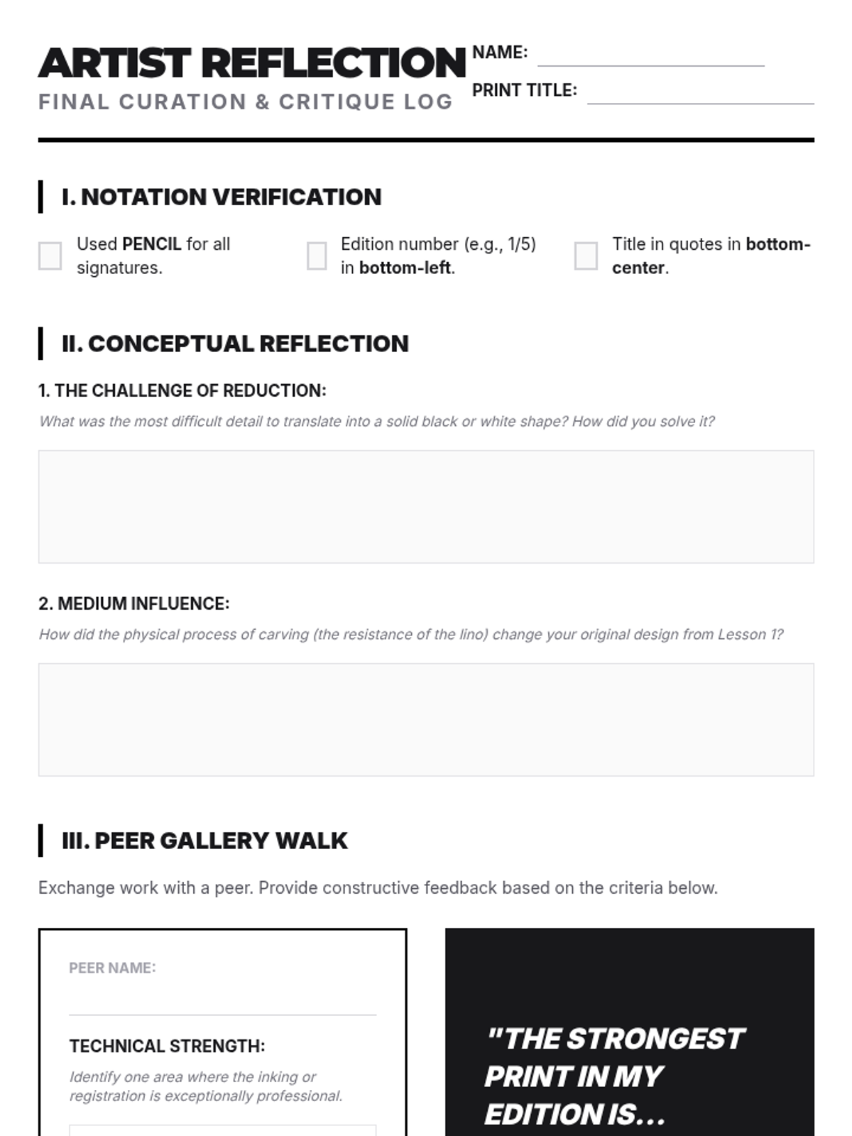 A comprehensive 11th-grade art sequence focusing on the technical and conceptual aspects of relief printmaking, from historical analysis to professional editioning.