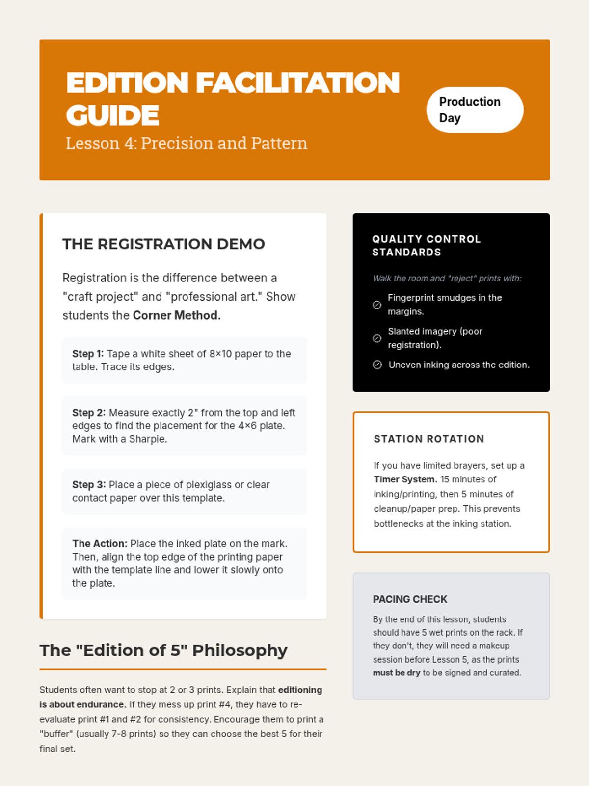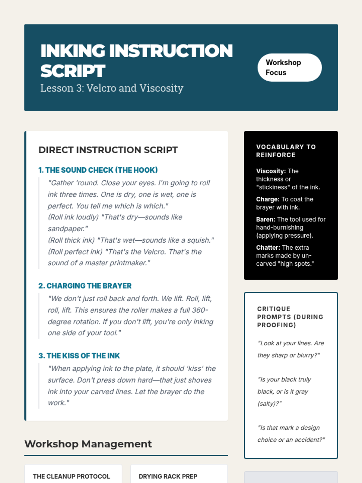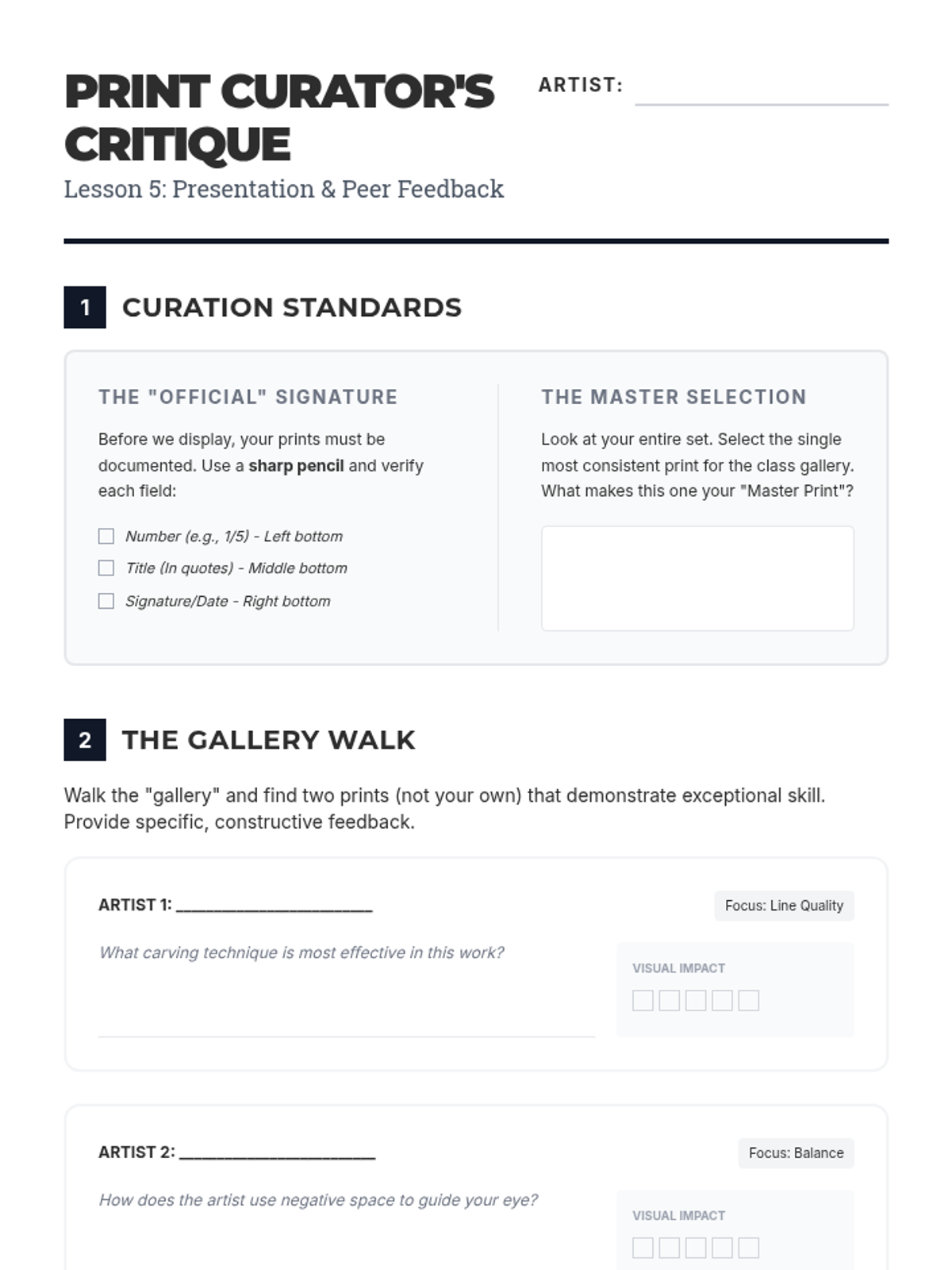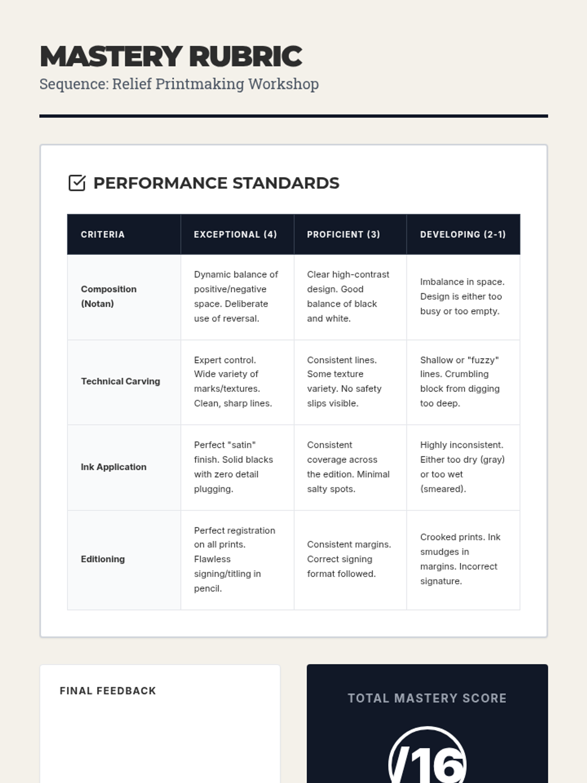 A comprehensive 7th-grade workshop sequence on relief printmaking, covering everything from conceptualizing positive/negative space to carving safety, ink application, and formal editioning. Students move from theory to technical mastery, culminating in a professional-style print critique.