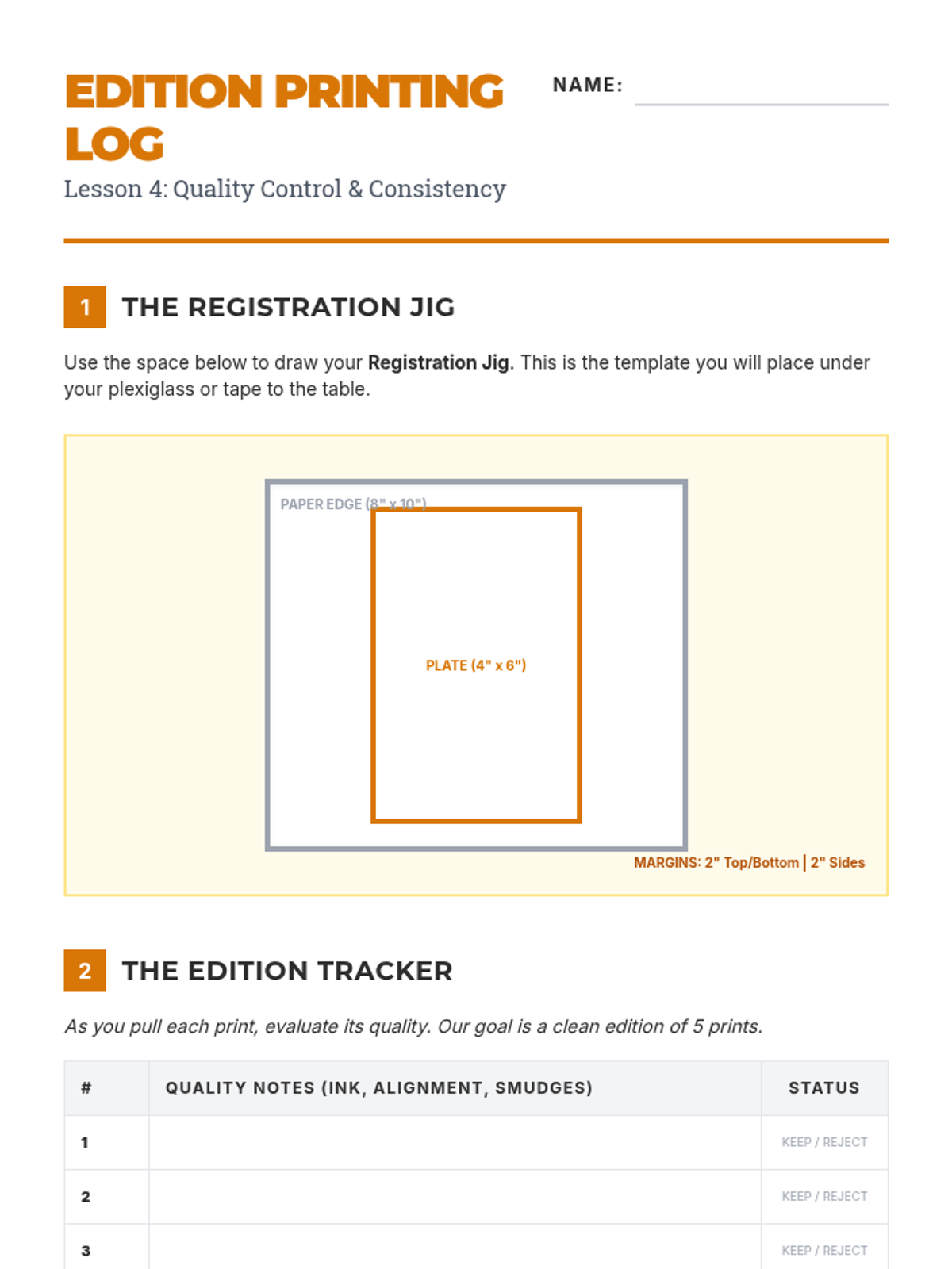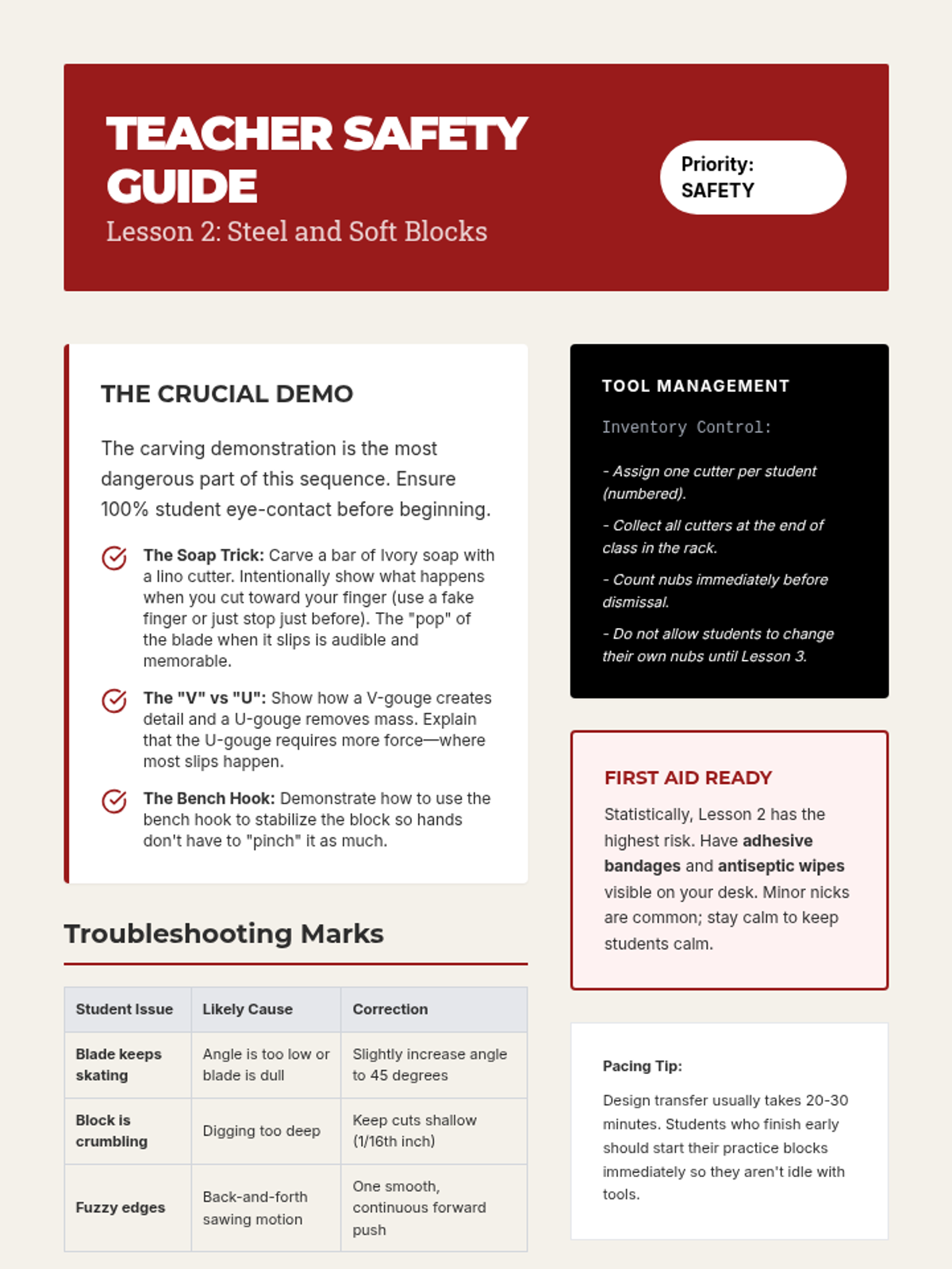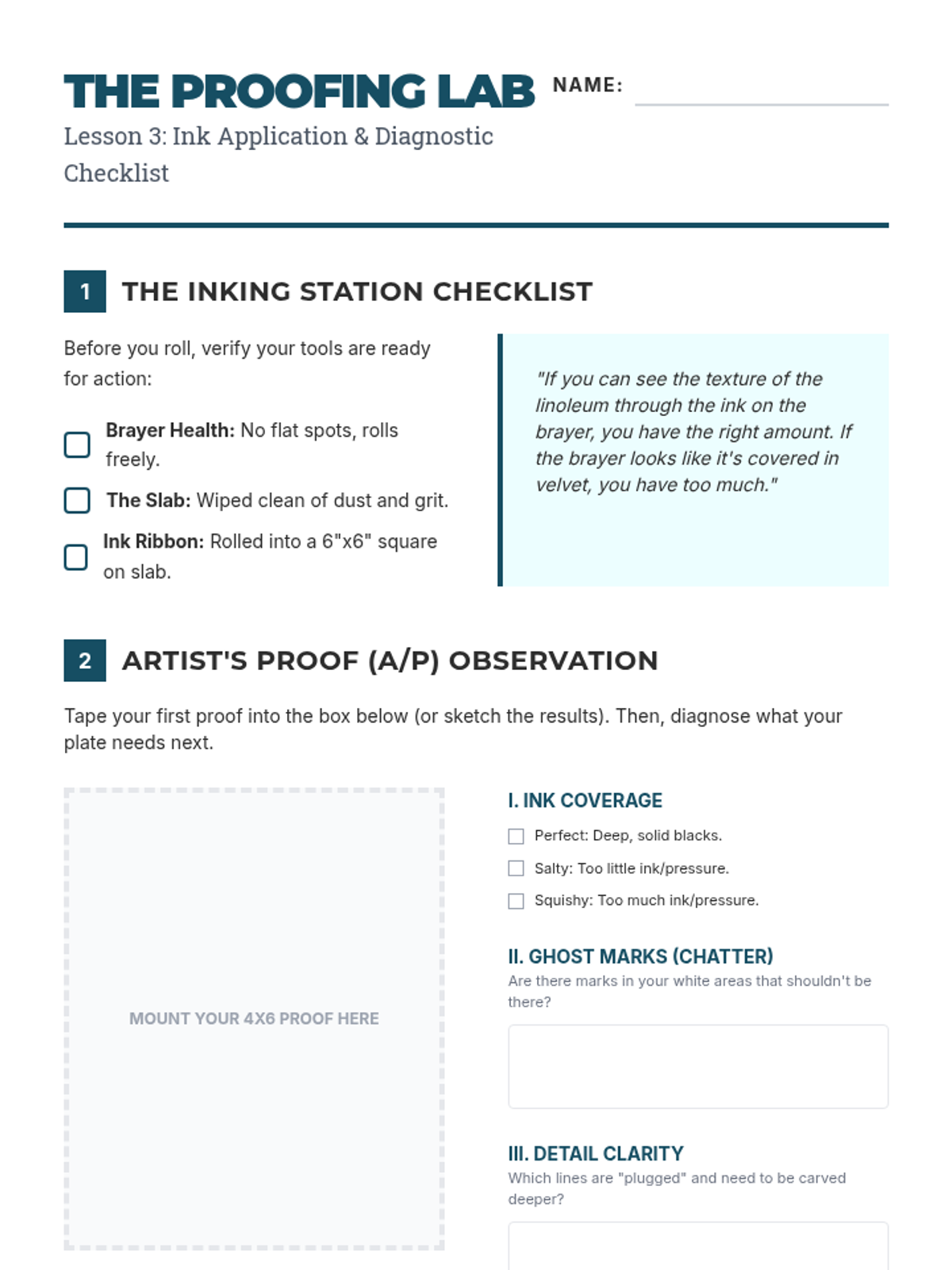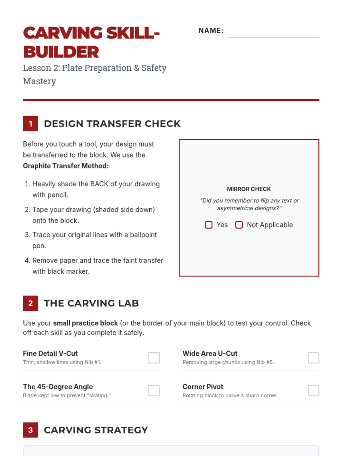 A comprehensive 7th-grade workshop sequence on relief printmaking, covering everything from conceptualizing positive/negative space to carving safety, ink application, and formal editioning. Students move from theory to technical mastery, culminating in a professional-style print critique.