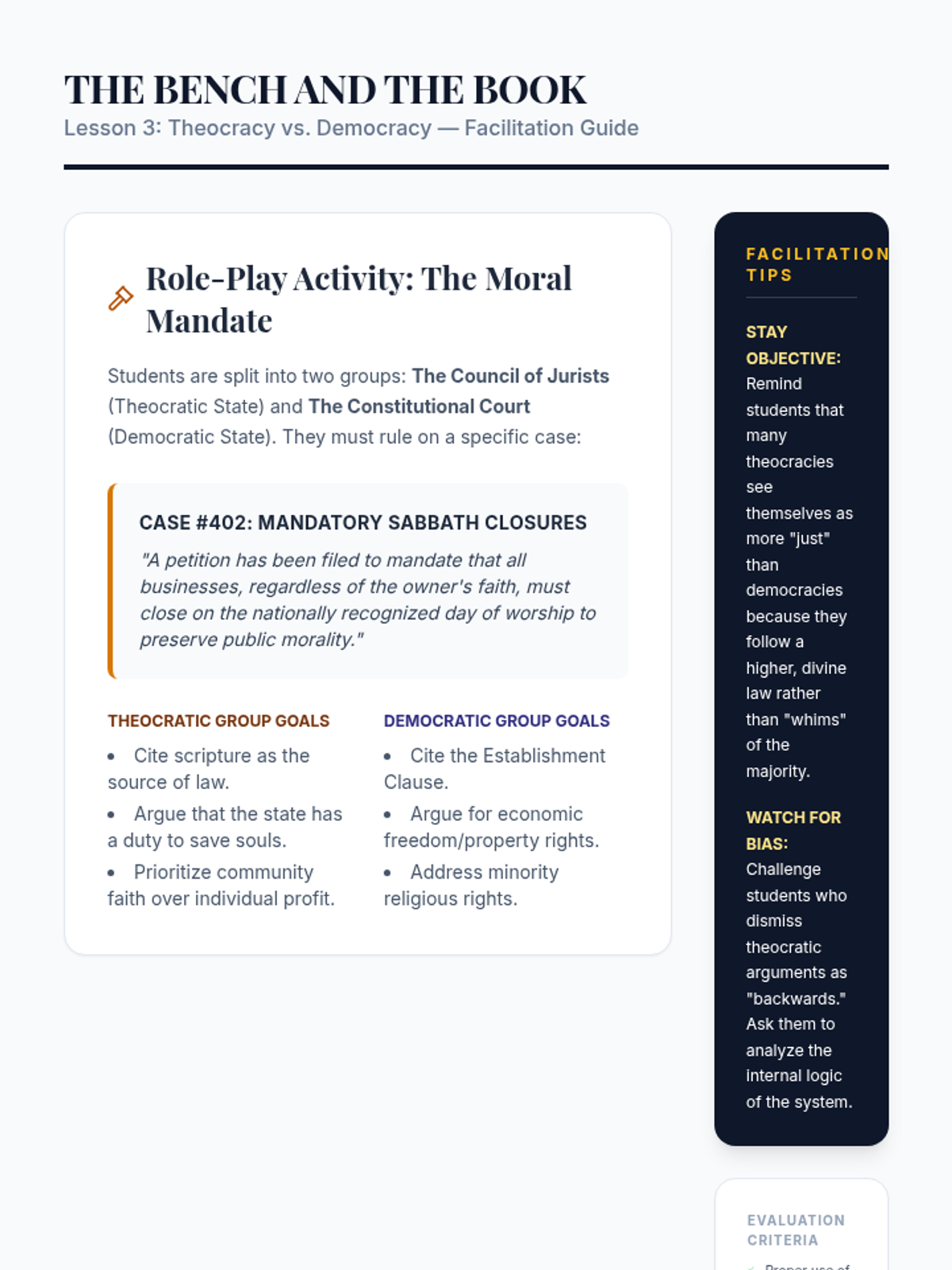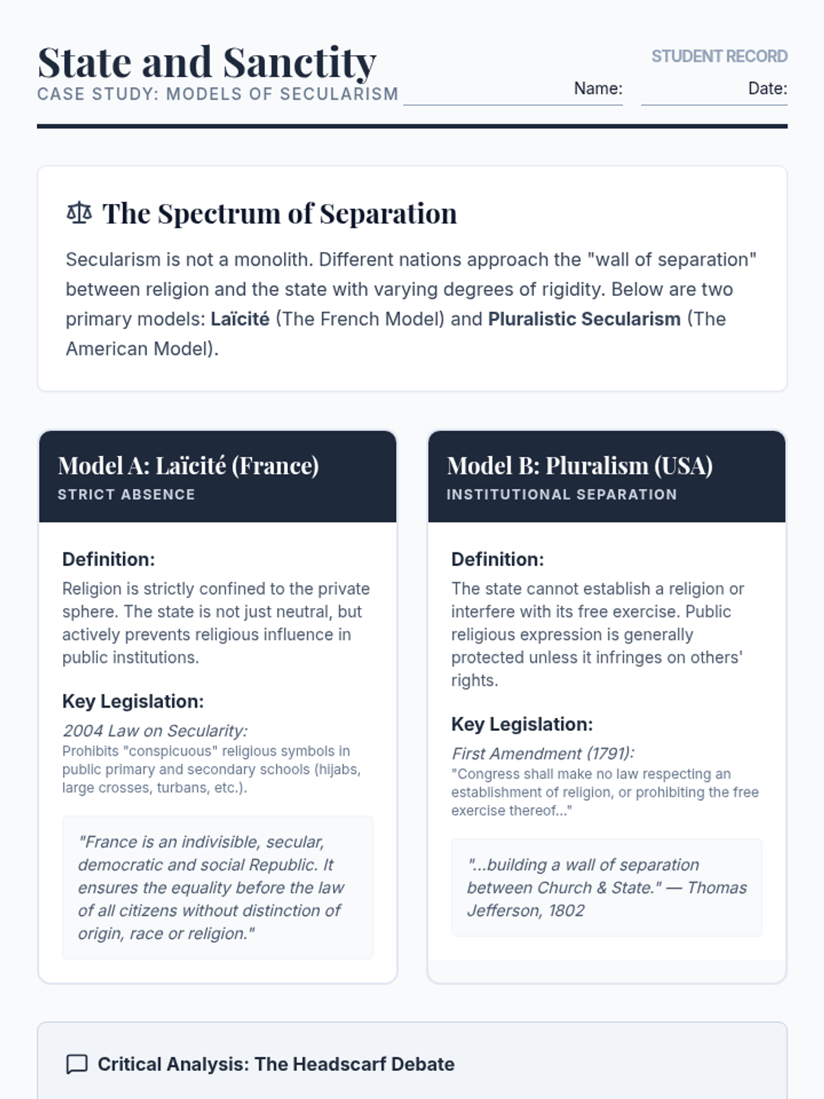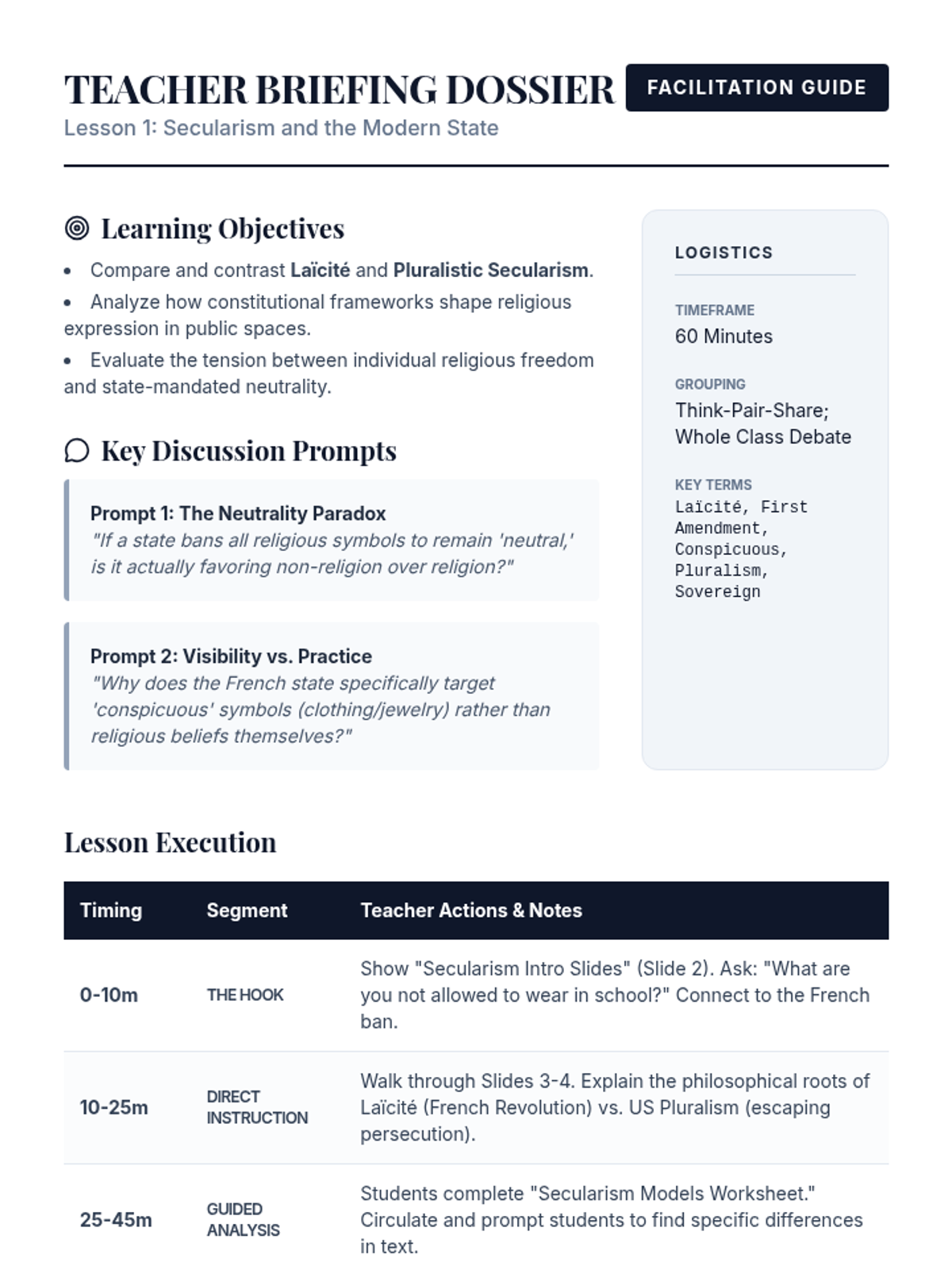 This 12th Grade Social Studies sequence explores the intersection of religion and global geopolitics. Students analyze secularism, religious fundamentalism, theocratic governance, and the role of faith in peacebuilding, culminating in a complex diplomatic simulation regarding Jerusalem's holy sites.