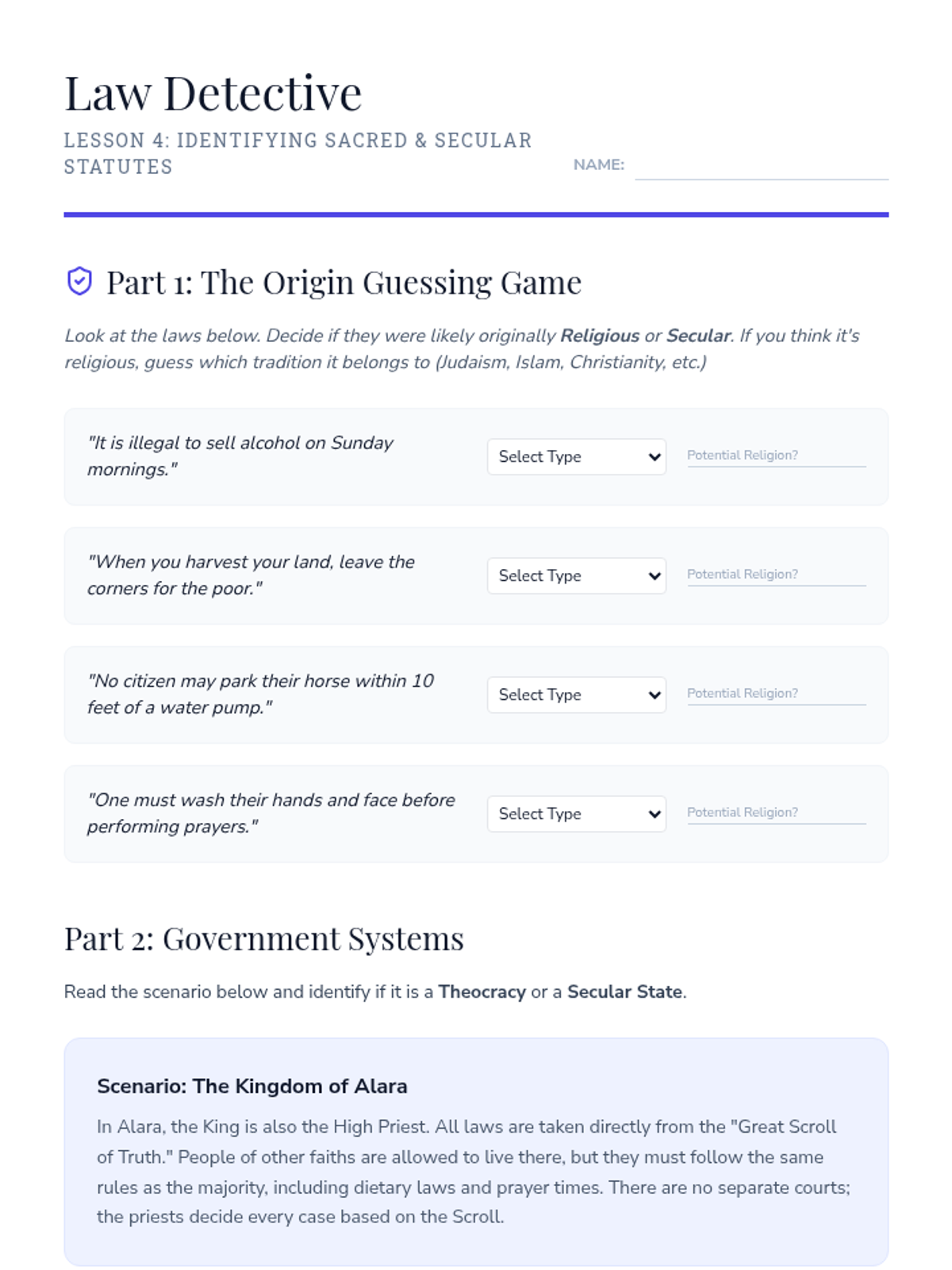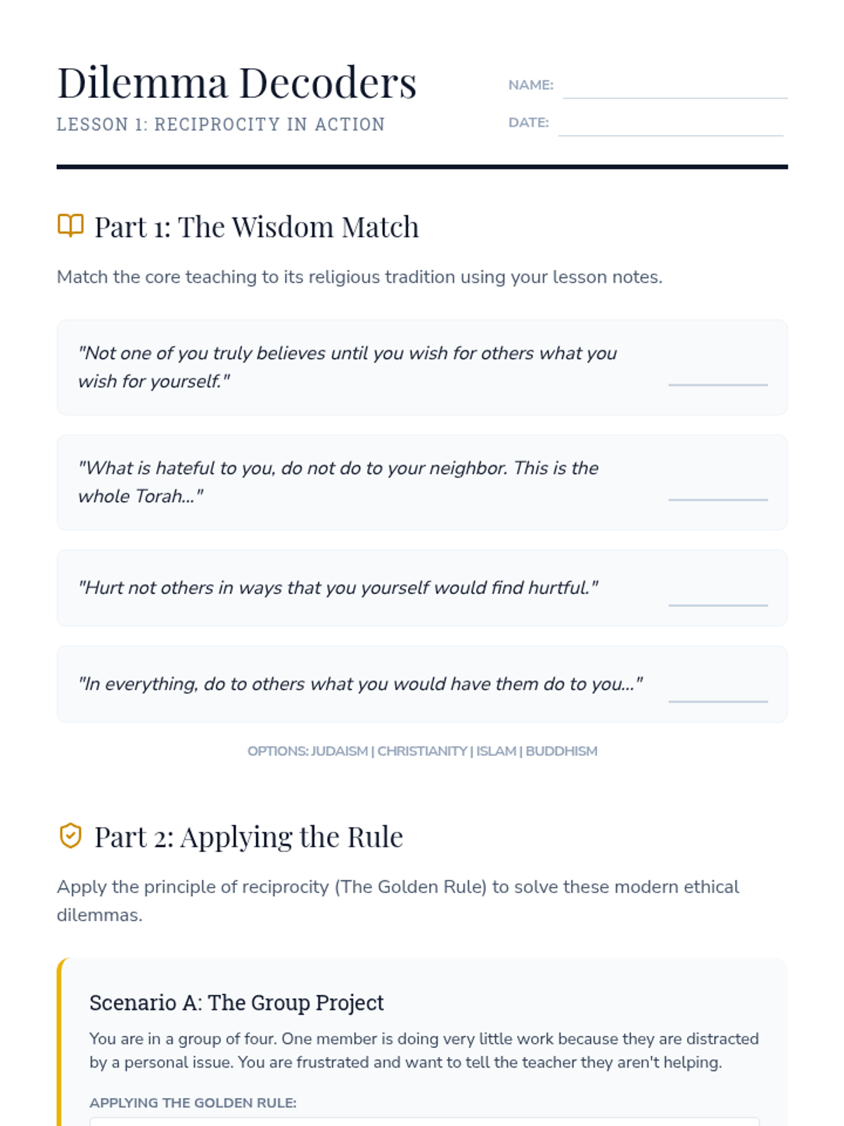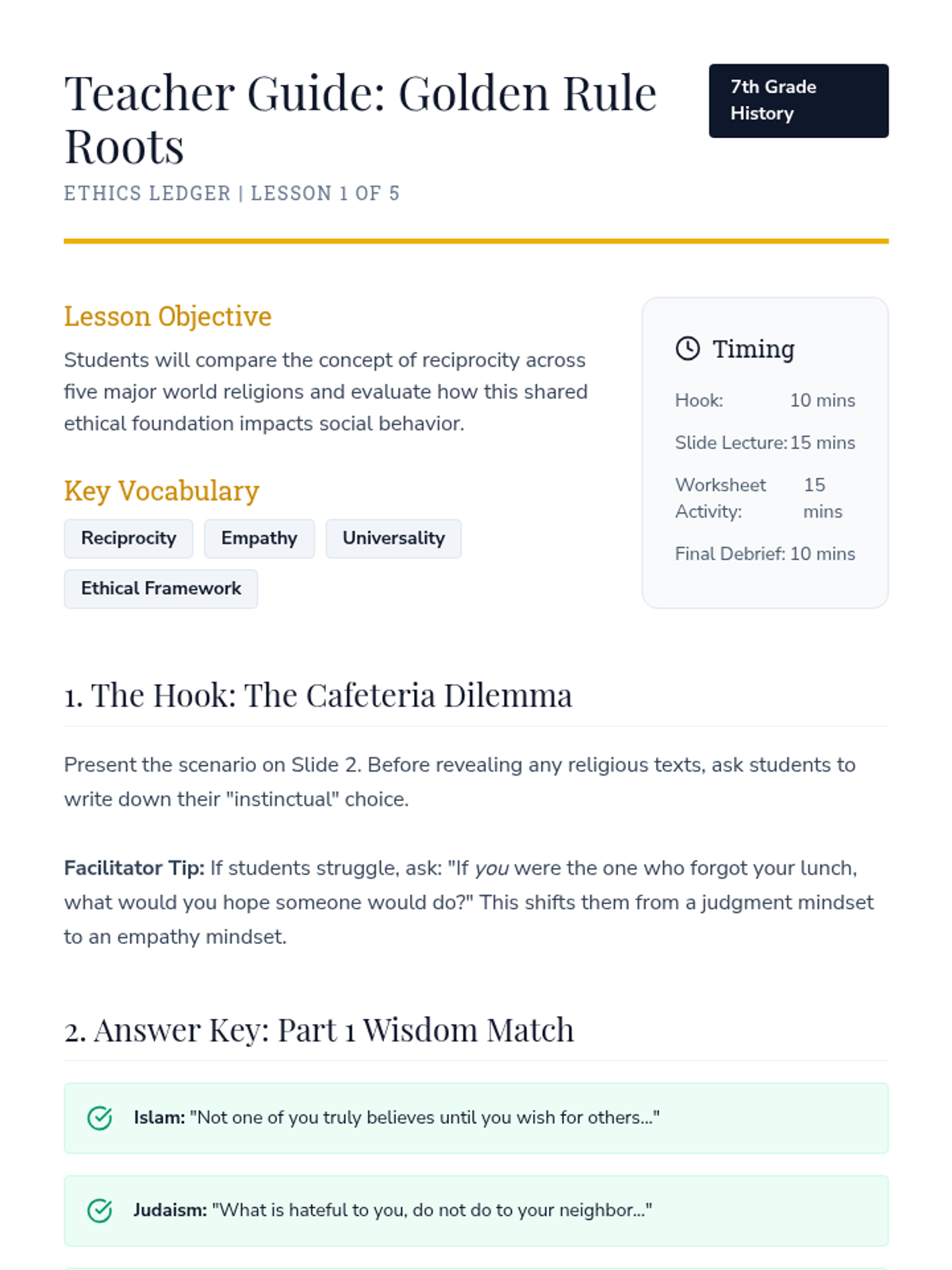 A 5-lesson sequence for 7th-grade students focused on the ethical frameworks of major world religions and their impact on society. Students evaluate how religious values shape laws, charity, conflict, and peace-building through discussion and case studies.
