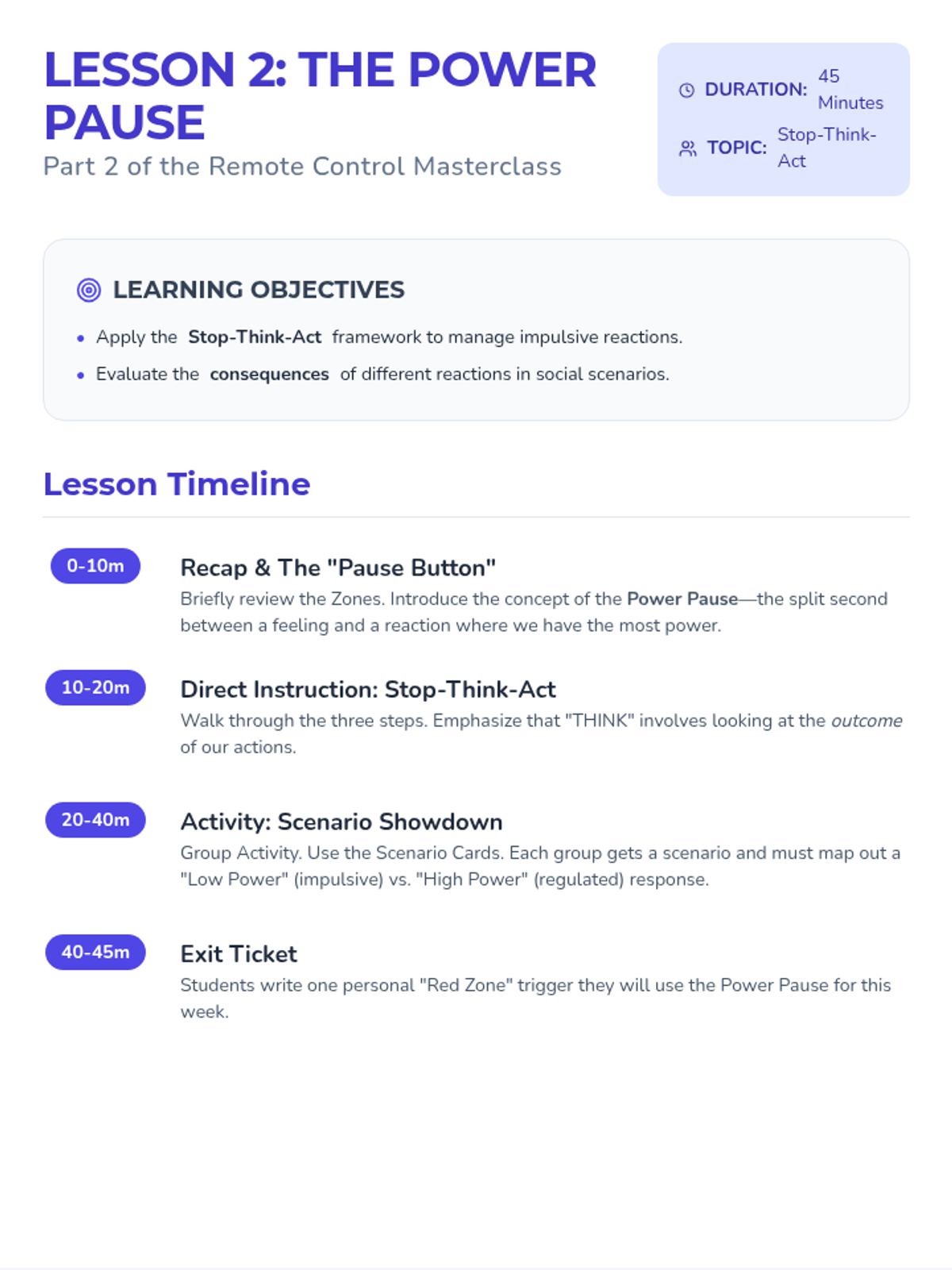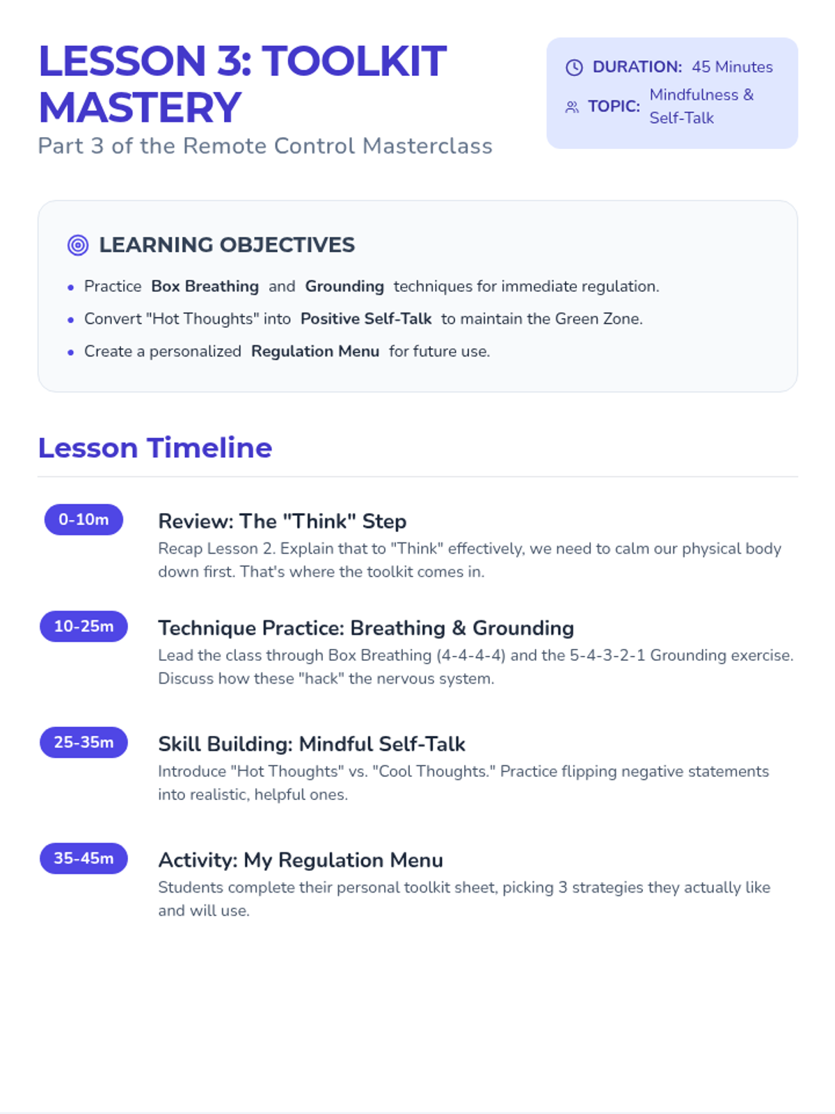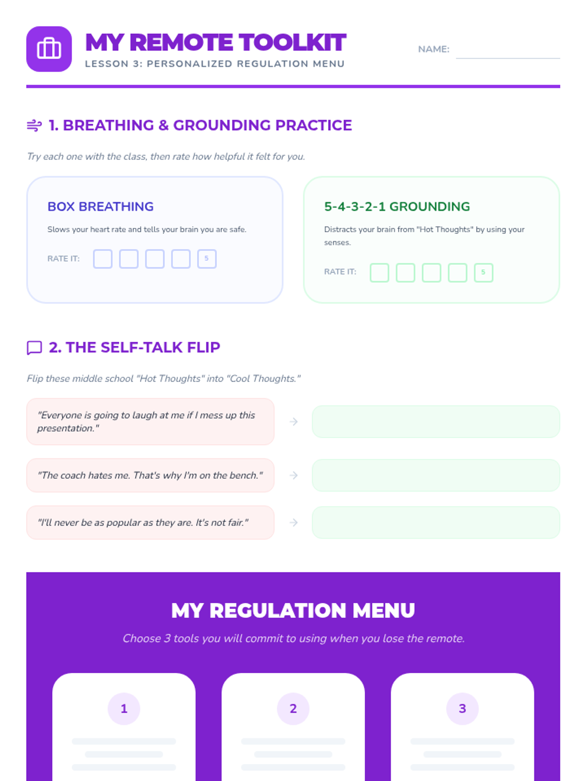 A 3-part sequence for middle schoolers on emotional regulation, covering the Zones of Regulation, the Stop-Think-Act framework, and personal mindfulness toolkits.