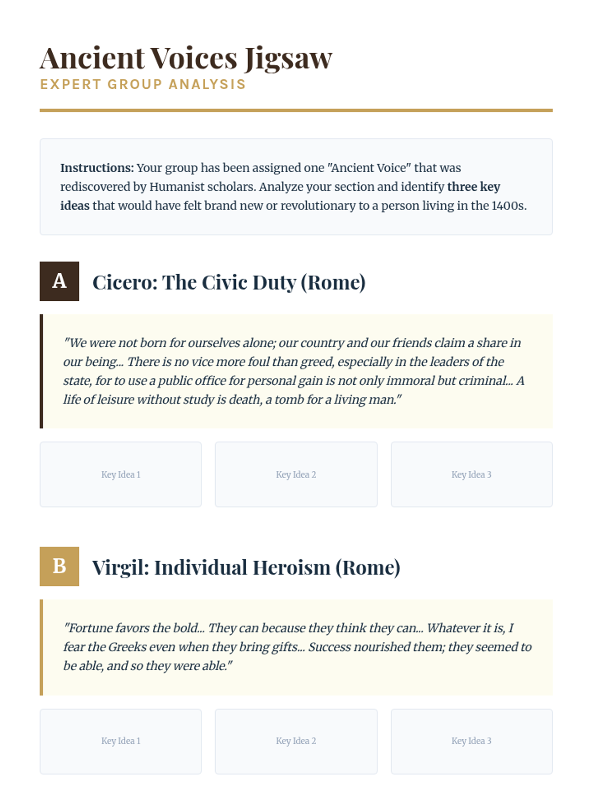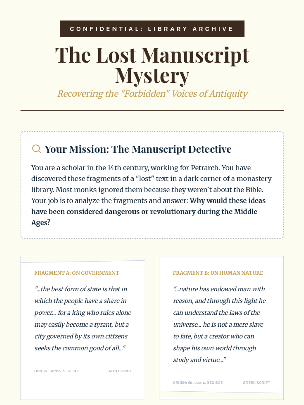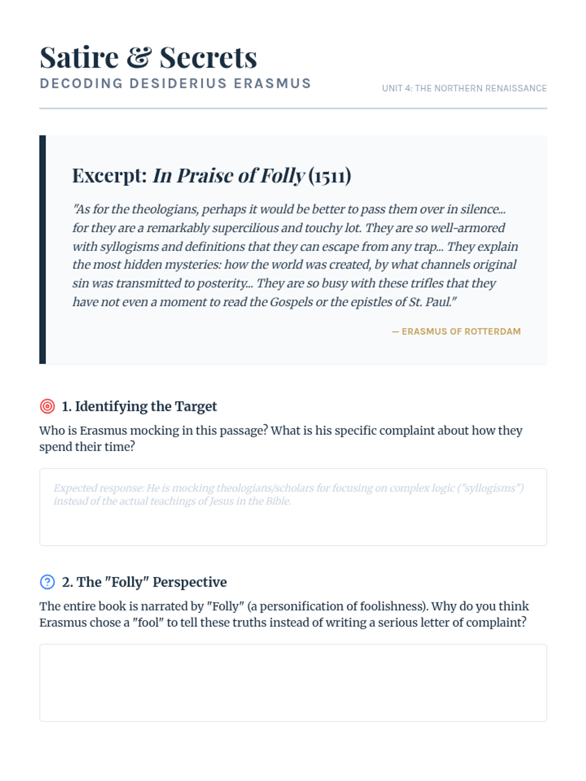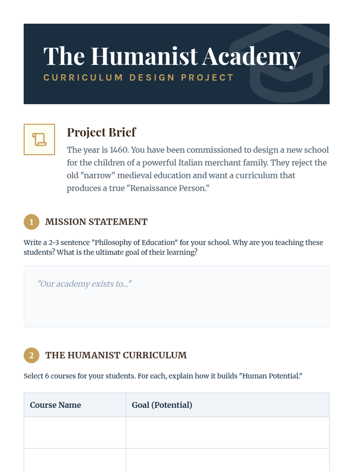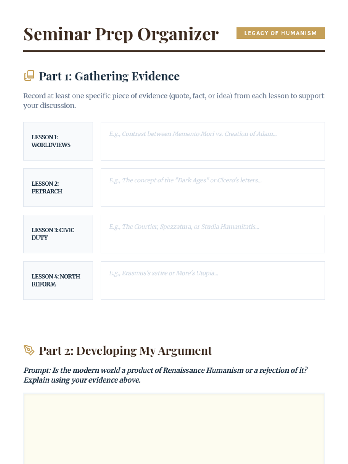 This sequence explores the intellectual transformation of Europe from the Middle Ages to the Renaissance, focusing on the emergence of humanism and its impact on culture, education, and religion. Students analyze primary sources from Petrarch, Erasmus, and Castiglione to understand how shifting views on human potential reshaped society.