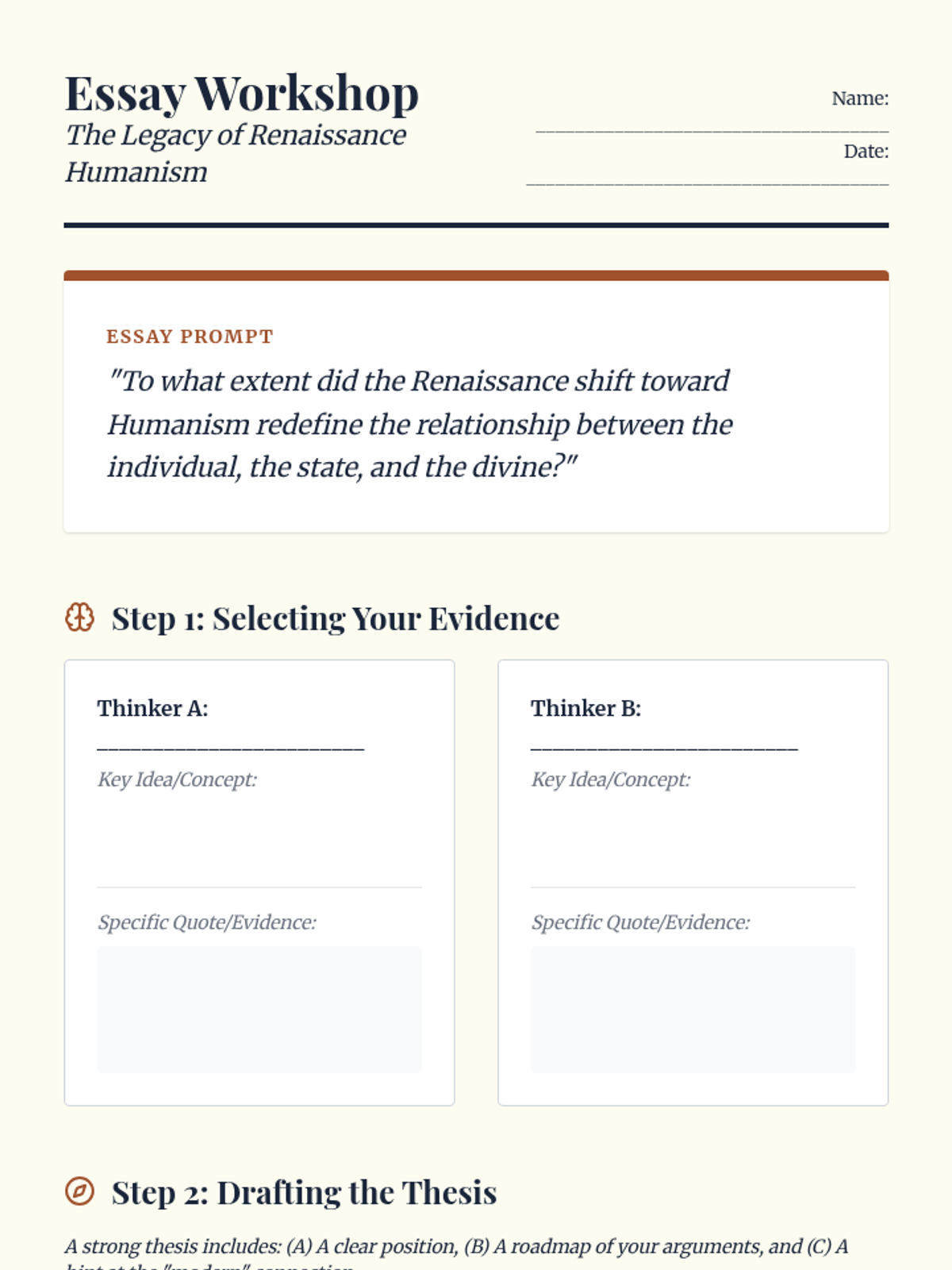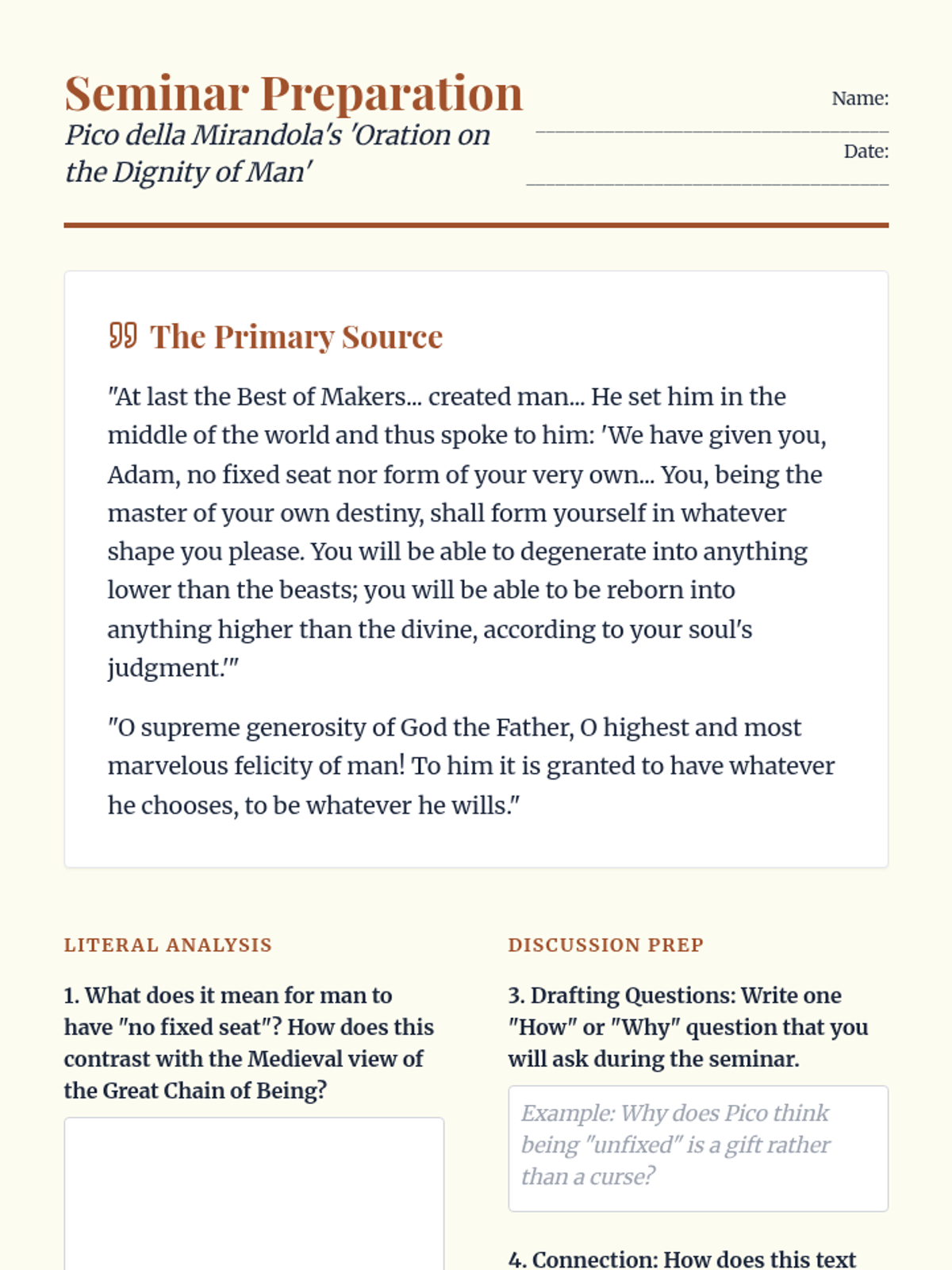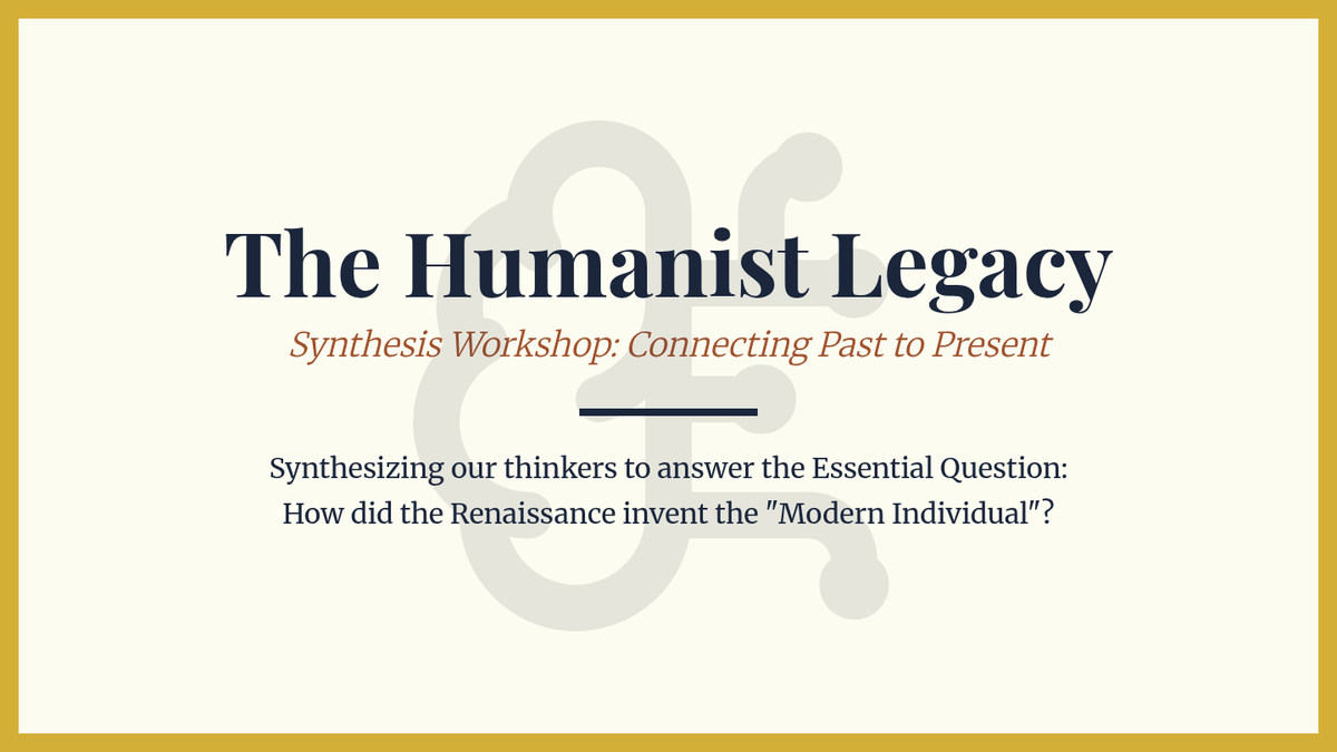 This high school history sequence explores the intellectual transformation from Medieval Scholasticism to Renaissance Humanism. Students analyze primary sources from key thinkers like Petrarch, Pico della Mirandola, and Machiavelli to understand the shift toward individualism, secular inquiry, and political realism.