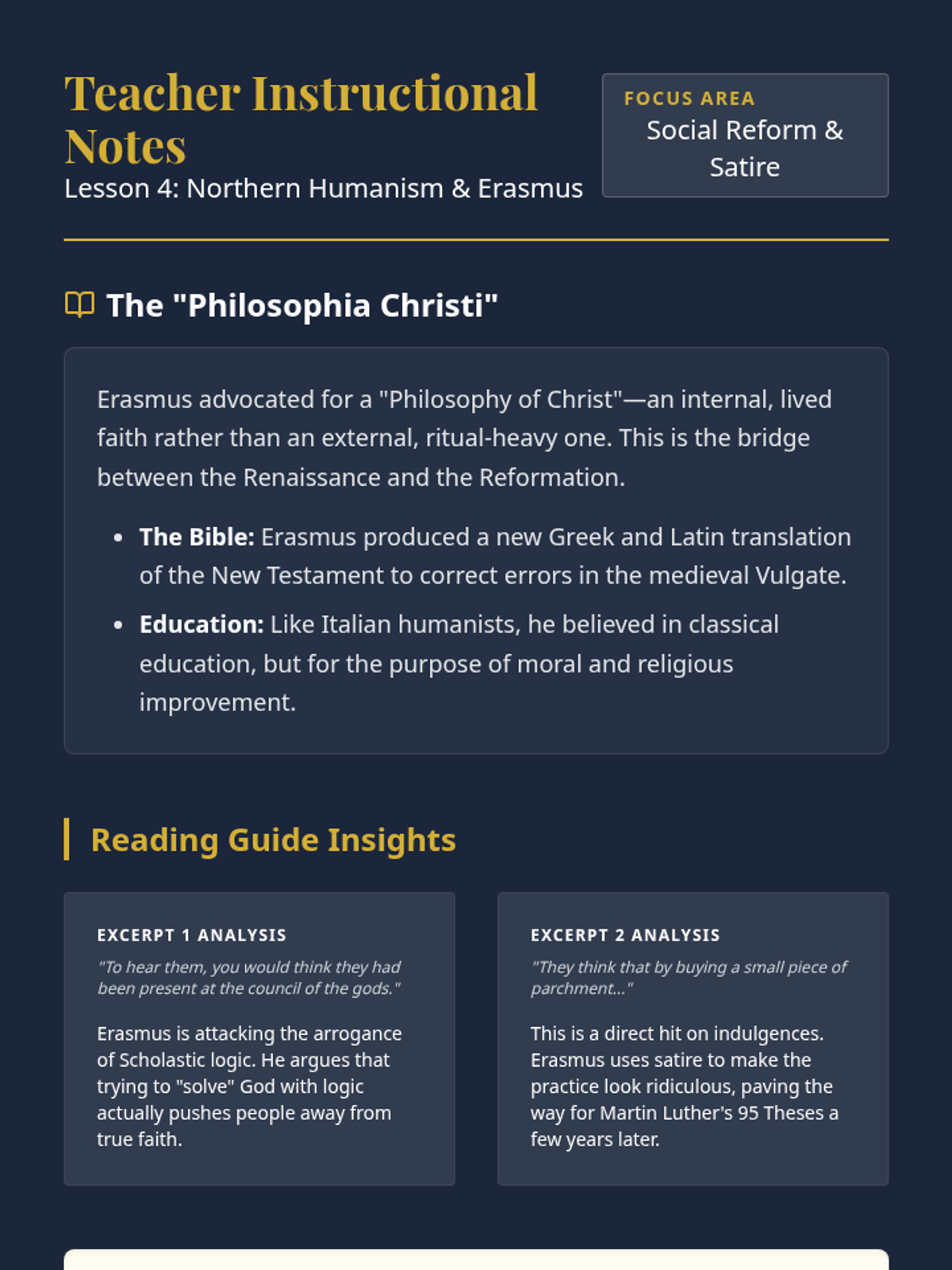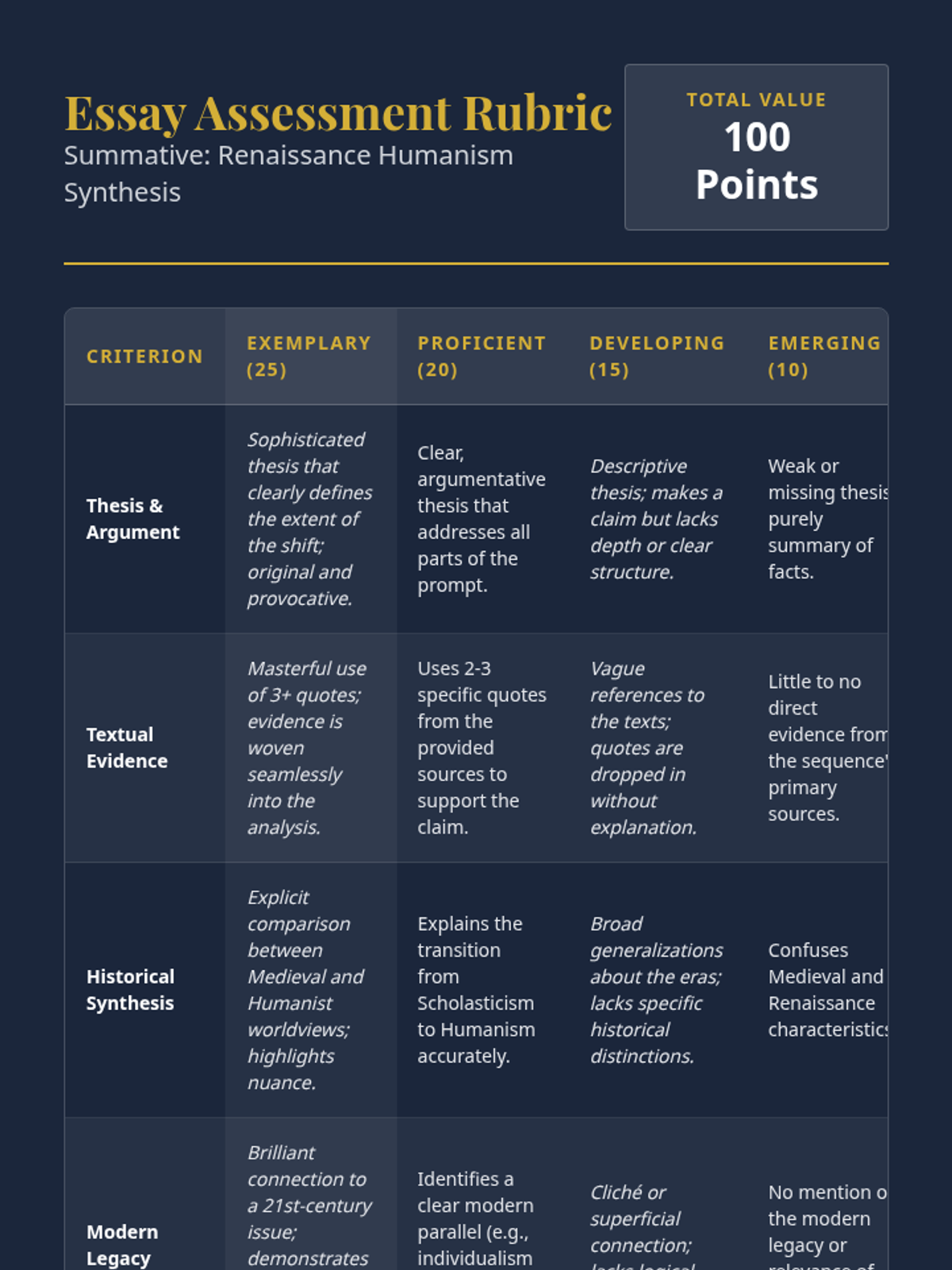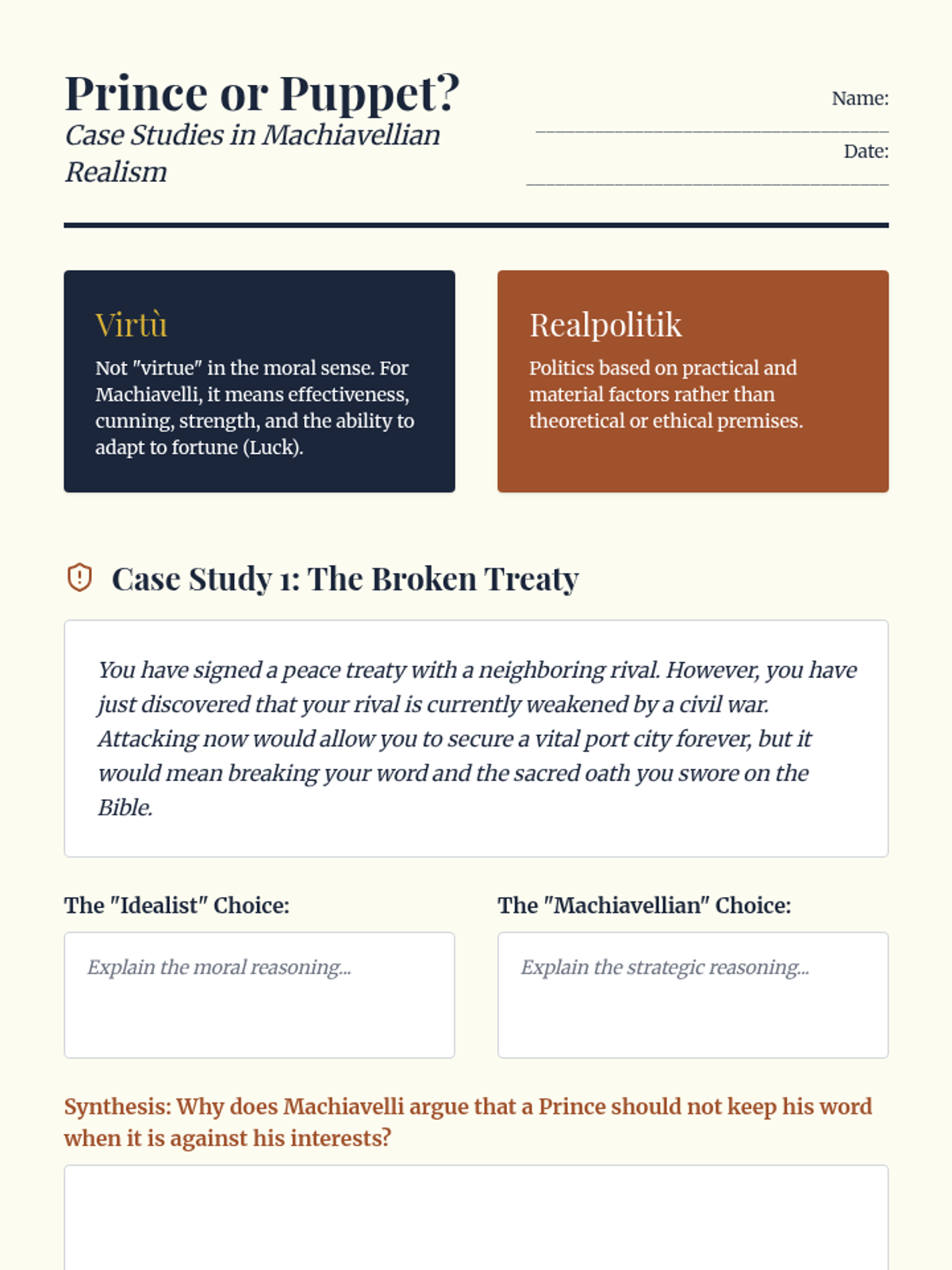 This high school history sequence explores the intellectual transformation from Medieval Scholasticism to Renaissance Humanism. Students analyze primary sources from key thinkers like Petrarch, Pico della Mirandola, and Machiavelli to understand the shift toward individualism, secular inquiry, and political realism.