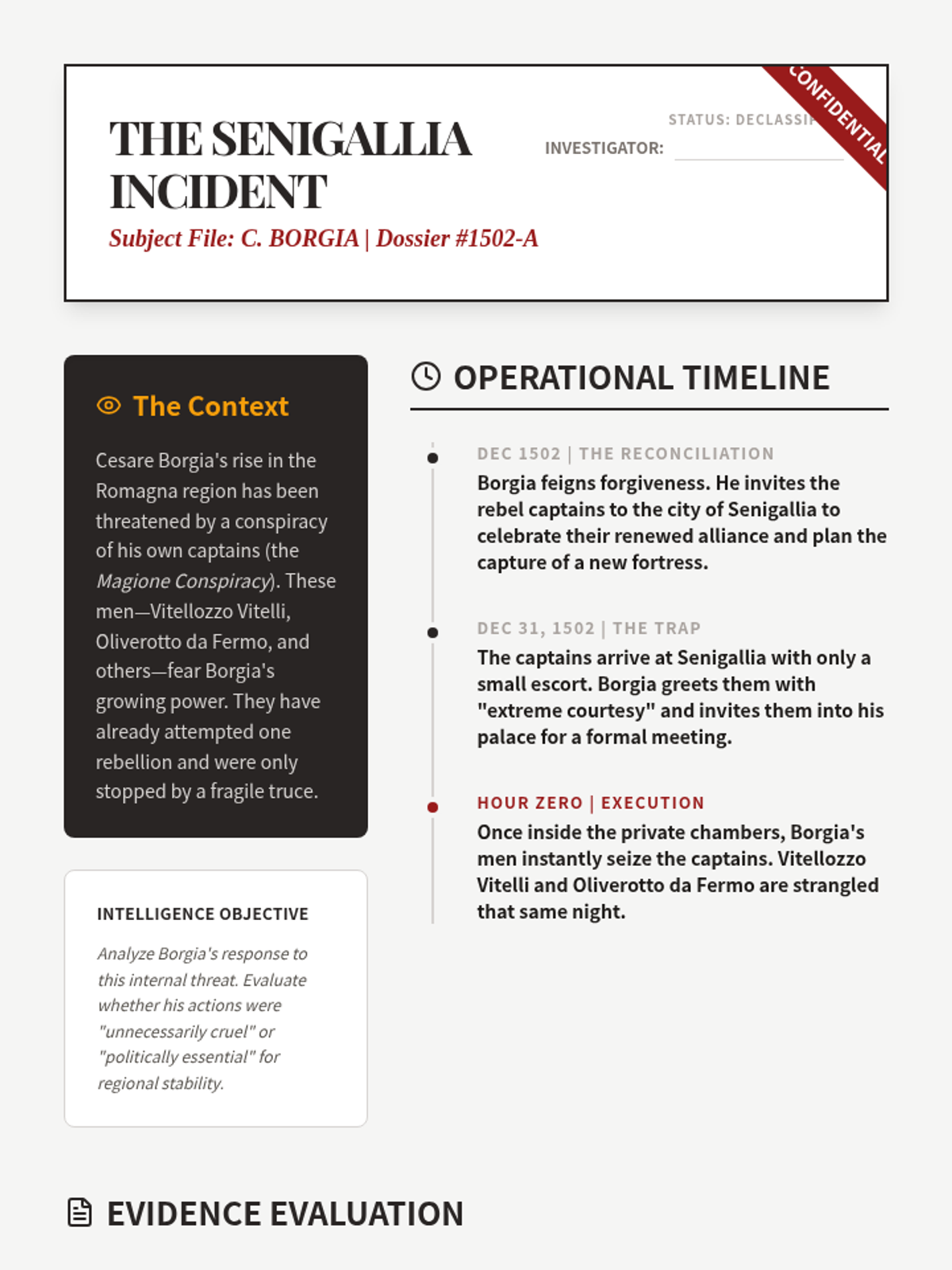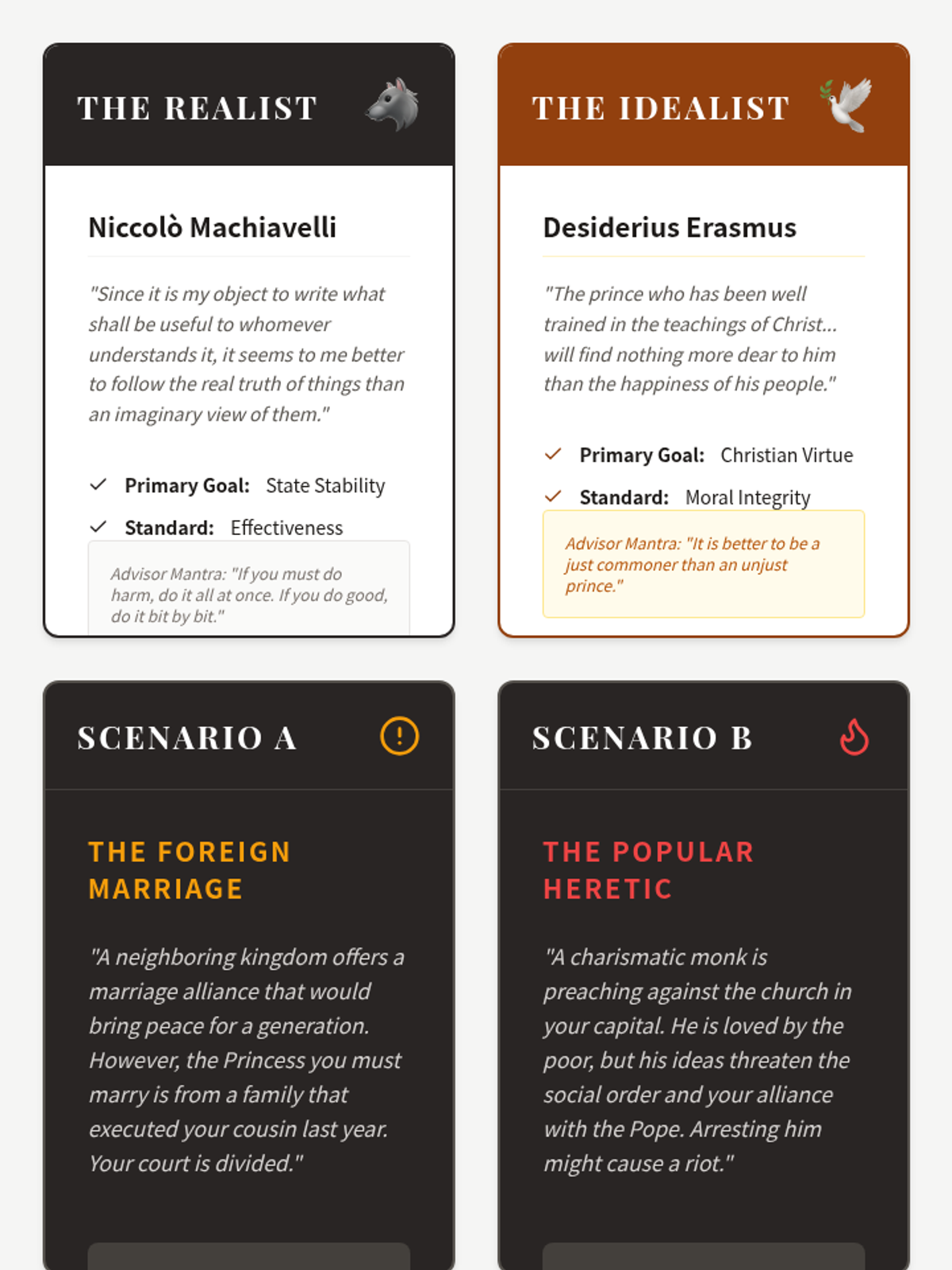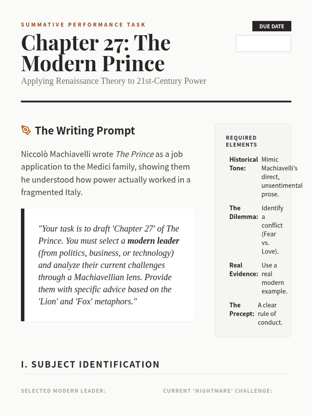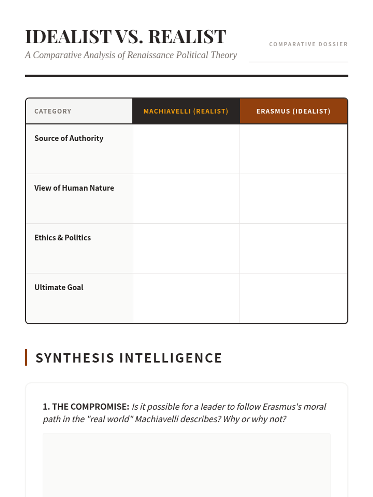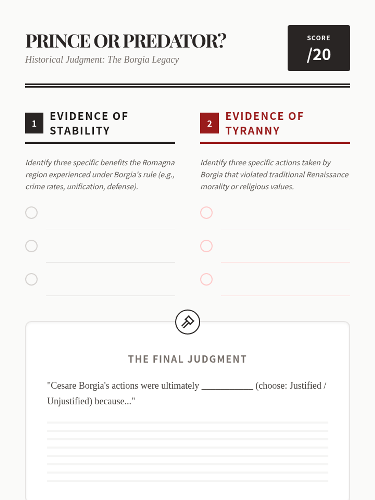 A deep dive into the political landscape of Renaissance Italy, focusing on Niccolò Machiavelli's 'The Prince' and the tension between moral idealism and political realism. Students analyze the fragmentation of Italian city-states, evaluate the leadership of Cesare Borgia, and compare Machiavellian tactics with Christian humanist perspectives to determine the compatibility of morality and power.