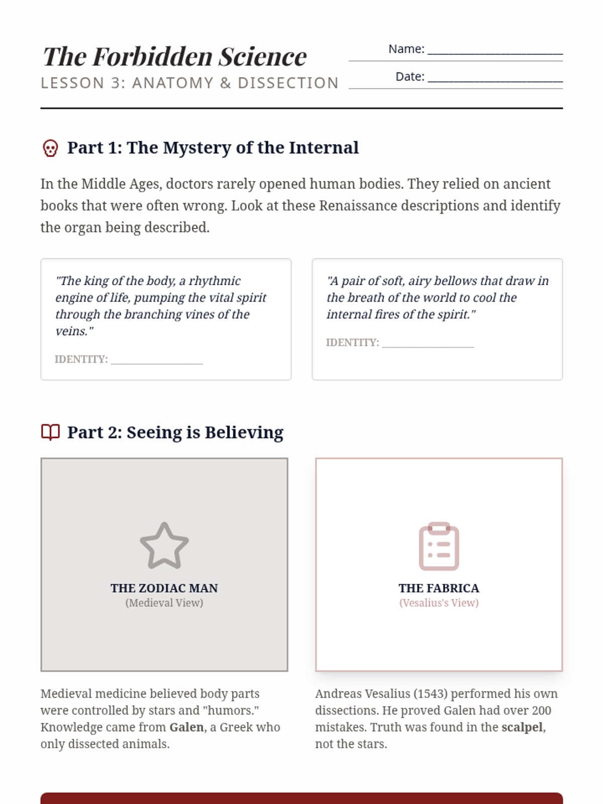 This sequence explores the shift from medieval reliance on tradition to the Renaissance focus on observation and experimentation. Students investigate key figures like Da Vinci, Vesalius, and Galileo, culminating in a project on the era's lasting scientific legacy.