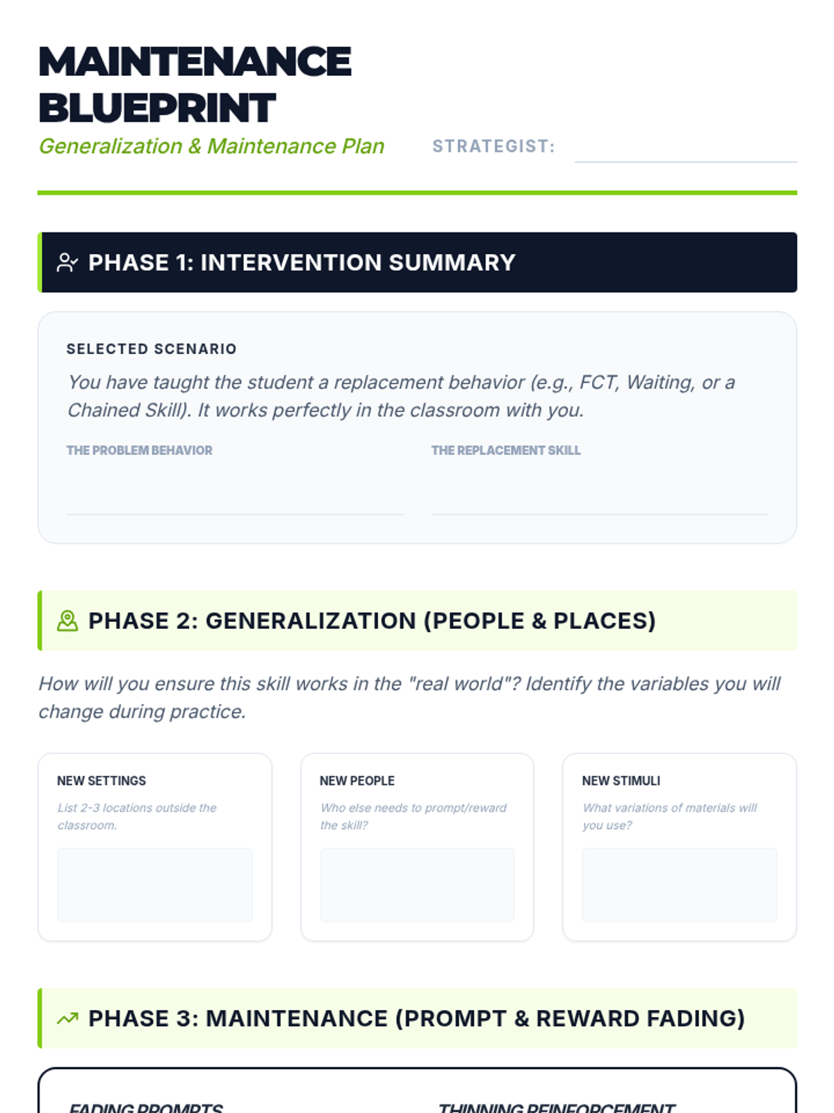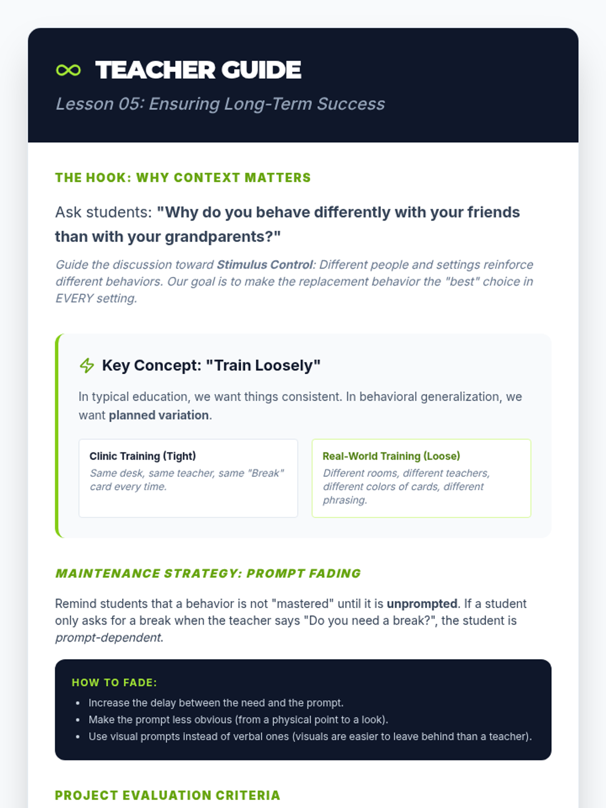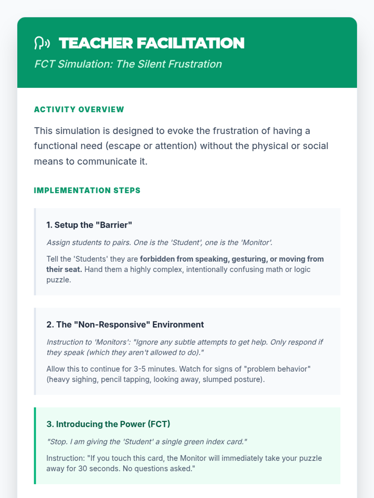 A comprehensive sequence for 12th-grade students on selecting and teaching replacement behaviors that serve the same function as maladaptive behaviors. Students learn to apply behavioral principles like the Matching Law, Functional Communication Training (FCT), and shaping to empower individuals with more effective ways to meet their needs.
