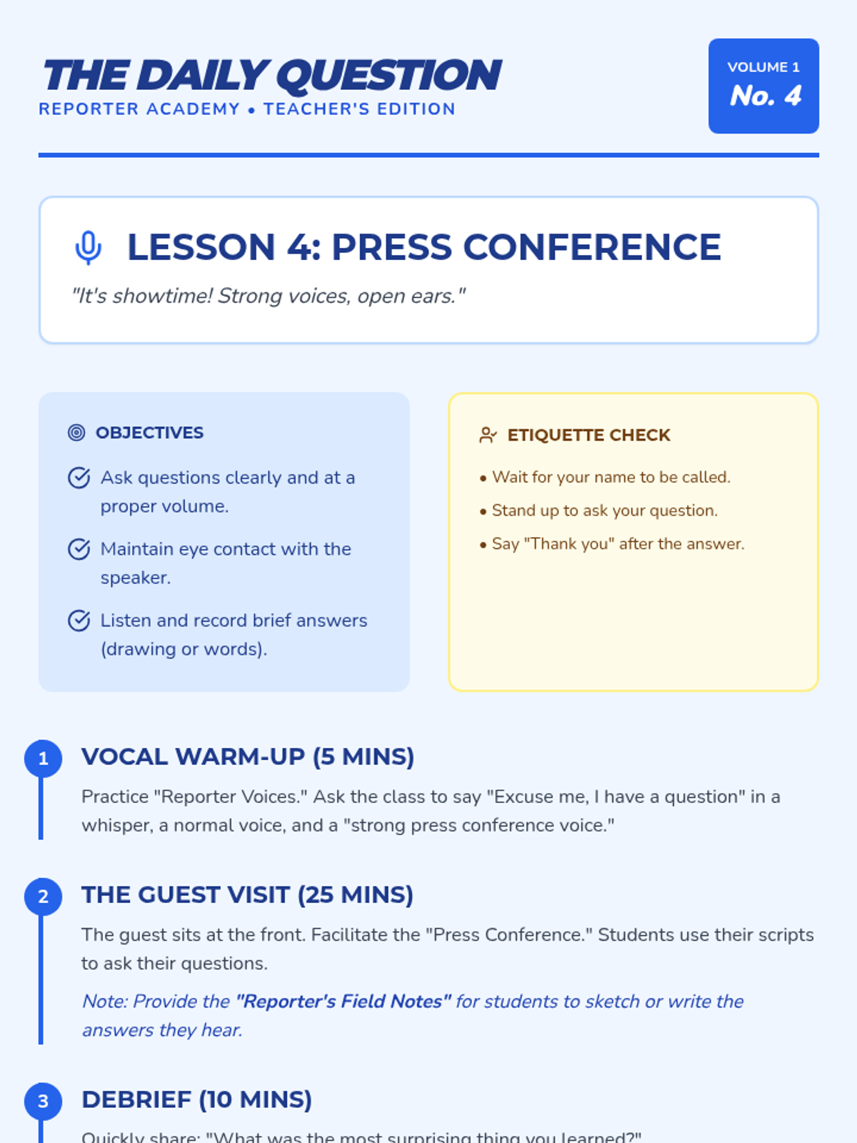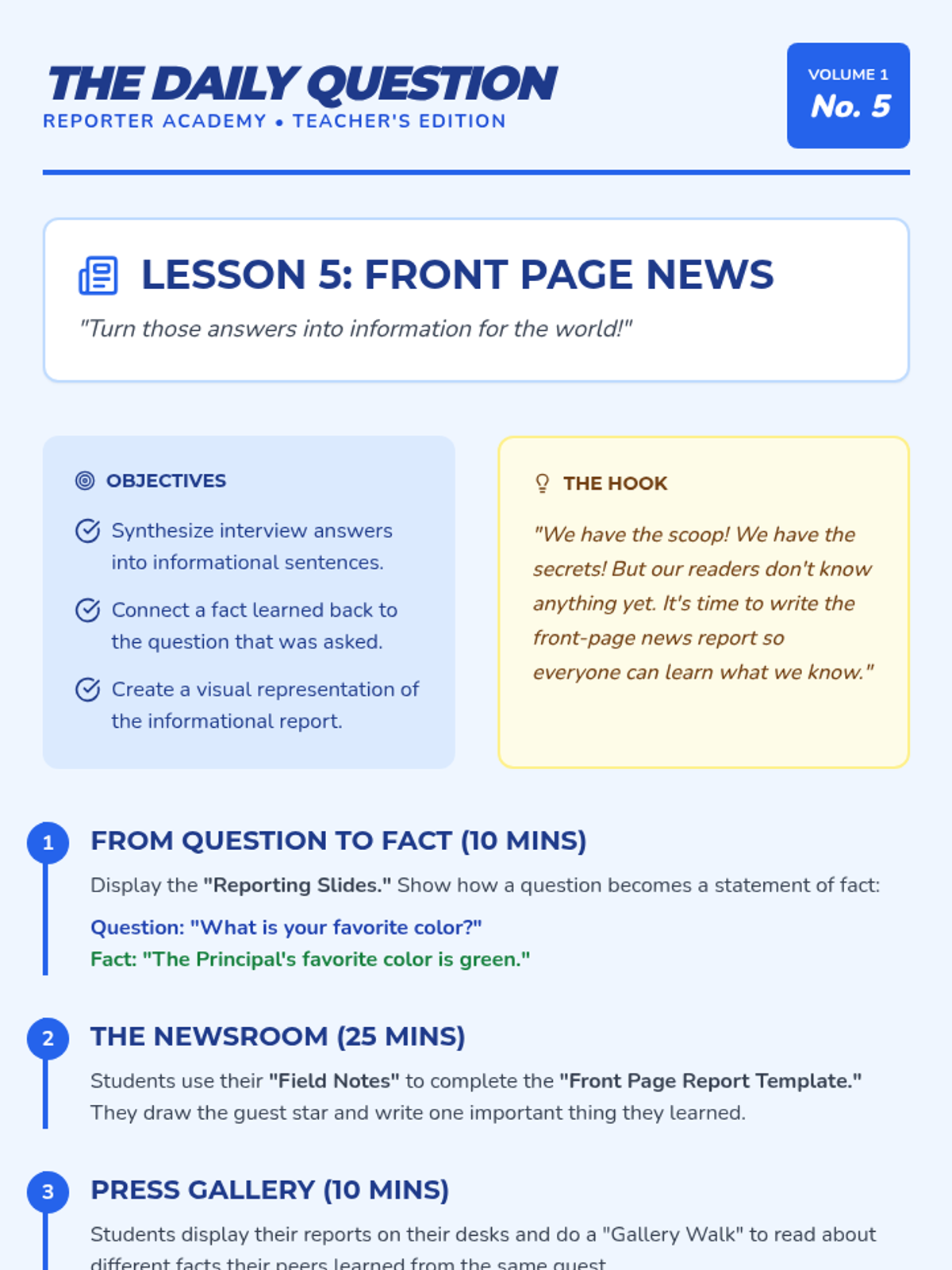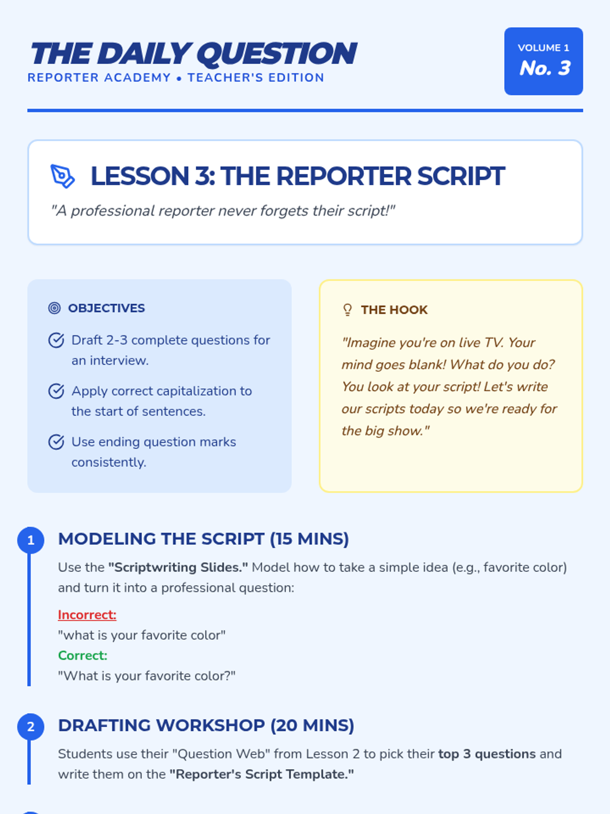 Students transform into roving reporters as they master the art of the question. From distinguishing between statements and questions to conducting a live interview, this sequence bridges oral language with written composition for 1st-grade learners.