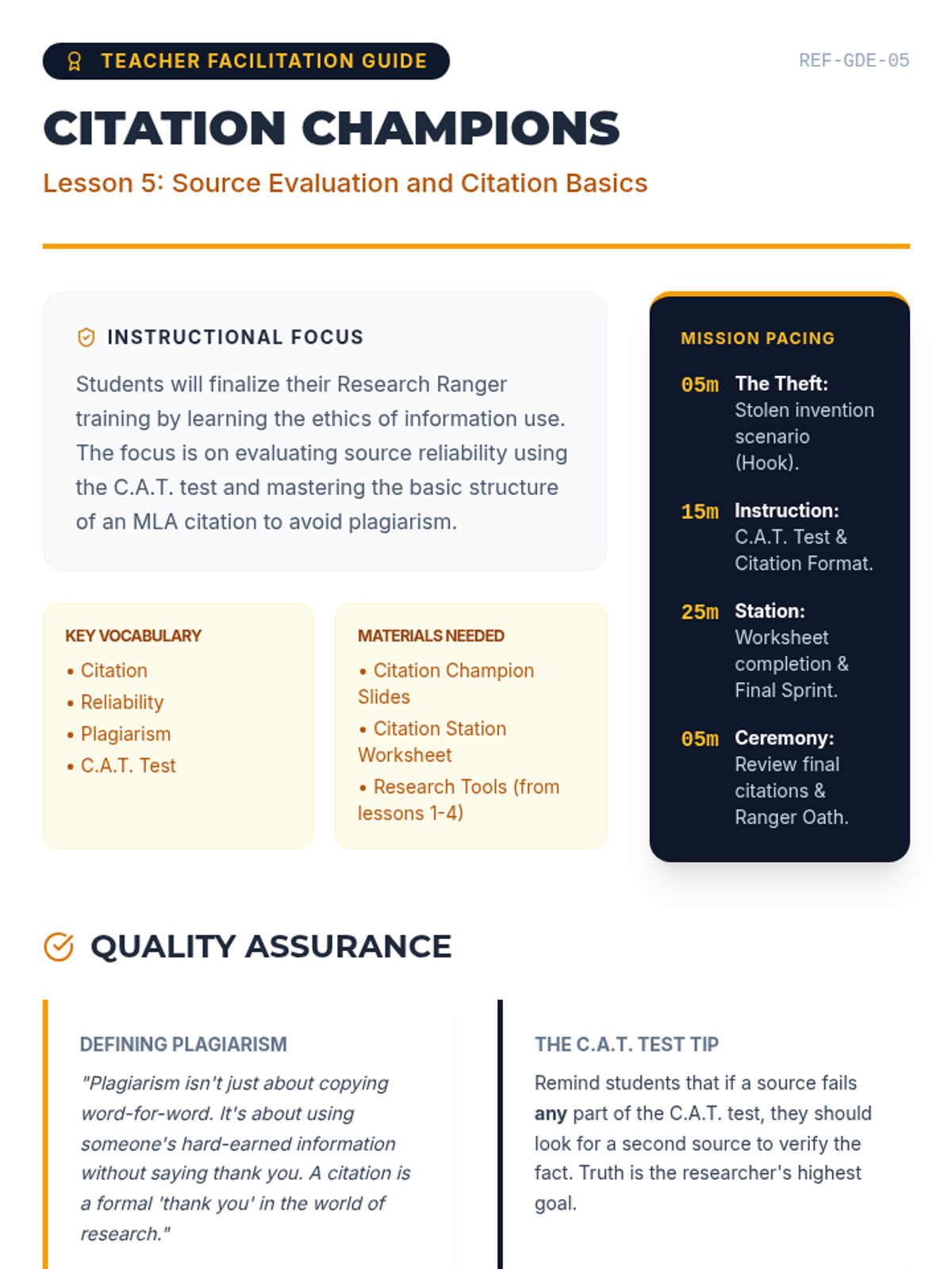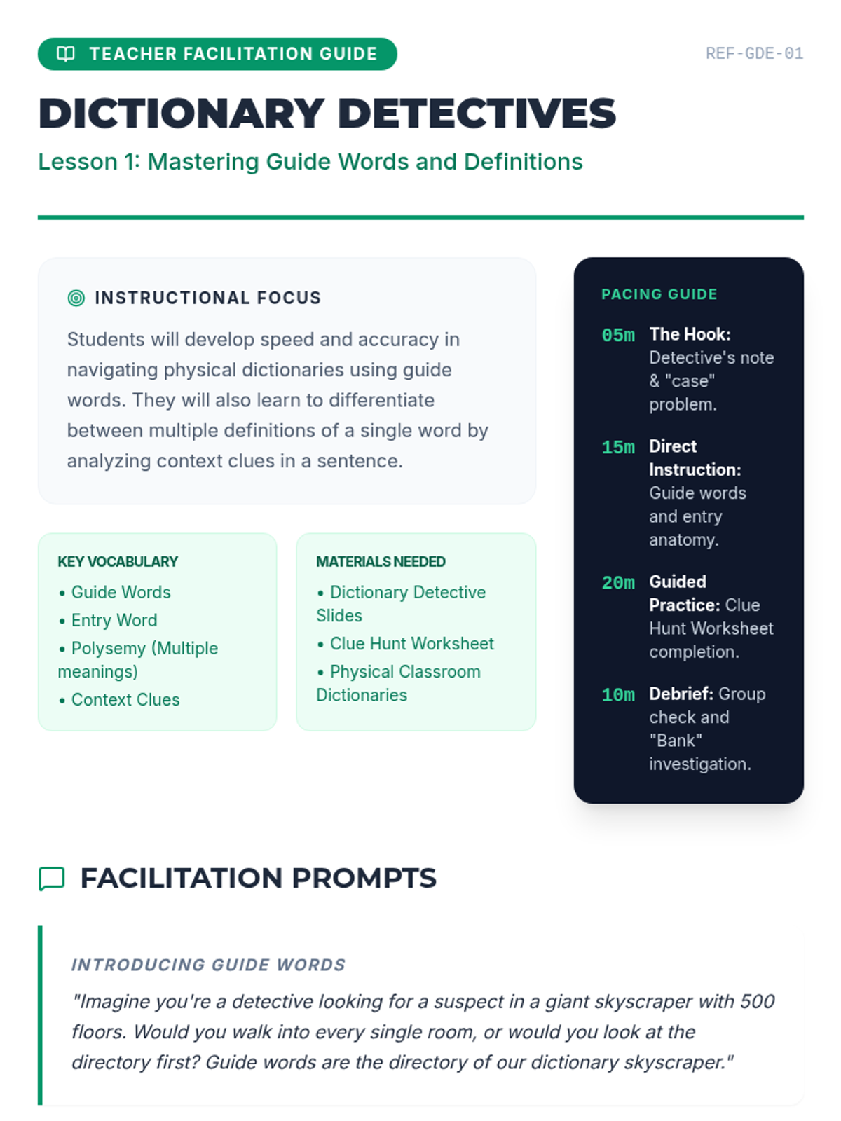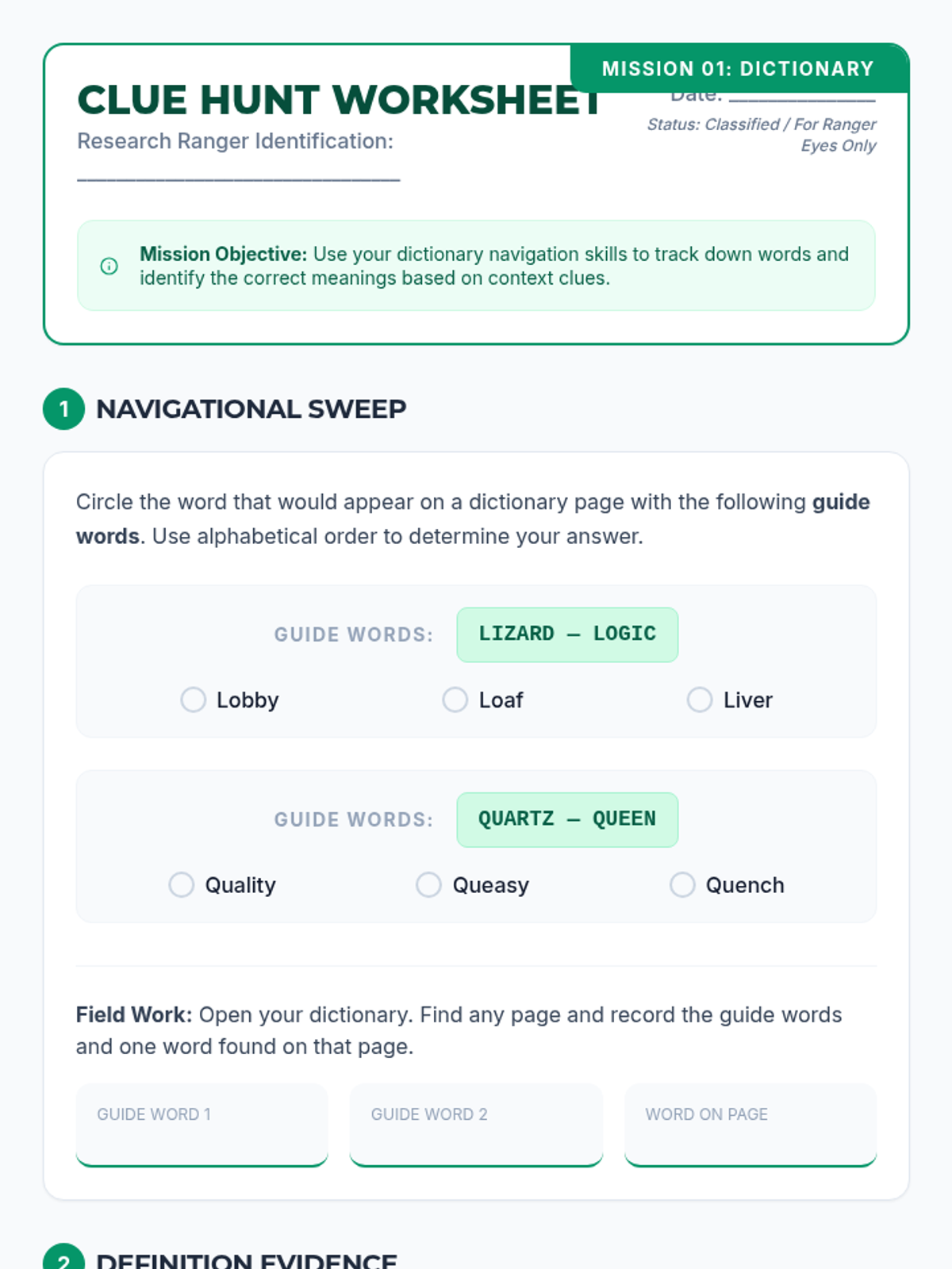 A comprehensive sequence for fifth-grade students to master reference tools, including dictionaries, thesauruses, encyclopedias, and digital databases. Students learn to navigate guide words, select precise synonyms, use indexes, and cite sources accurately.