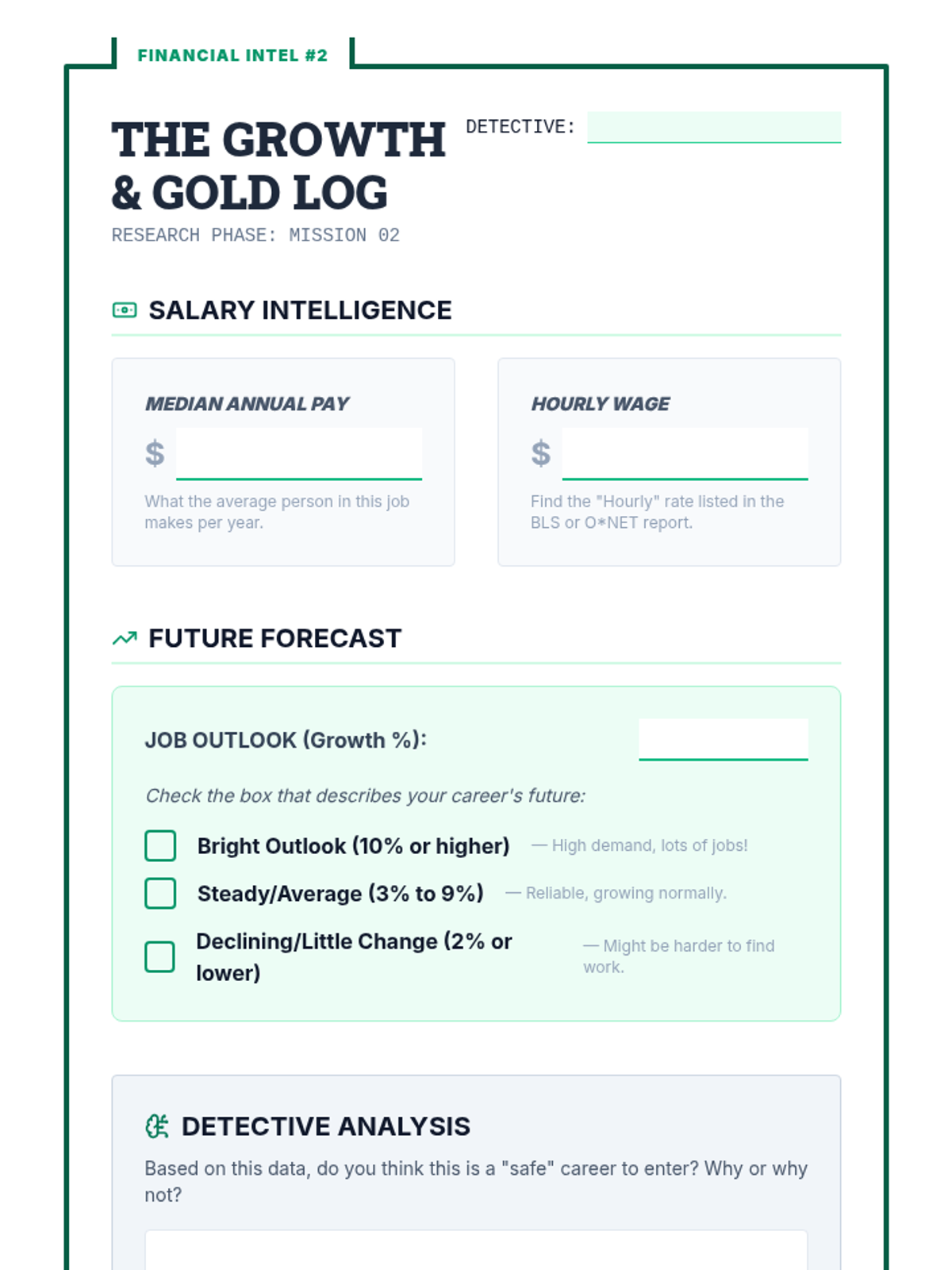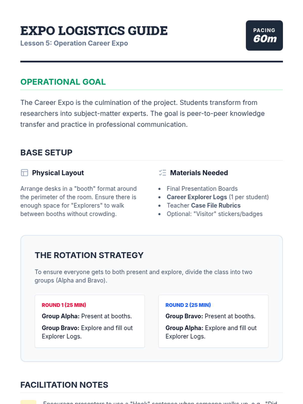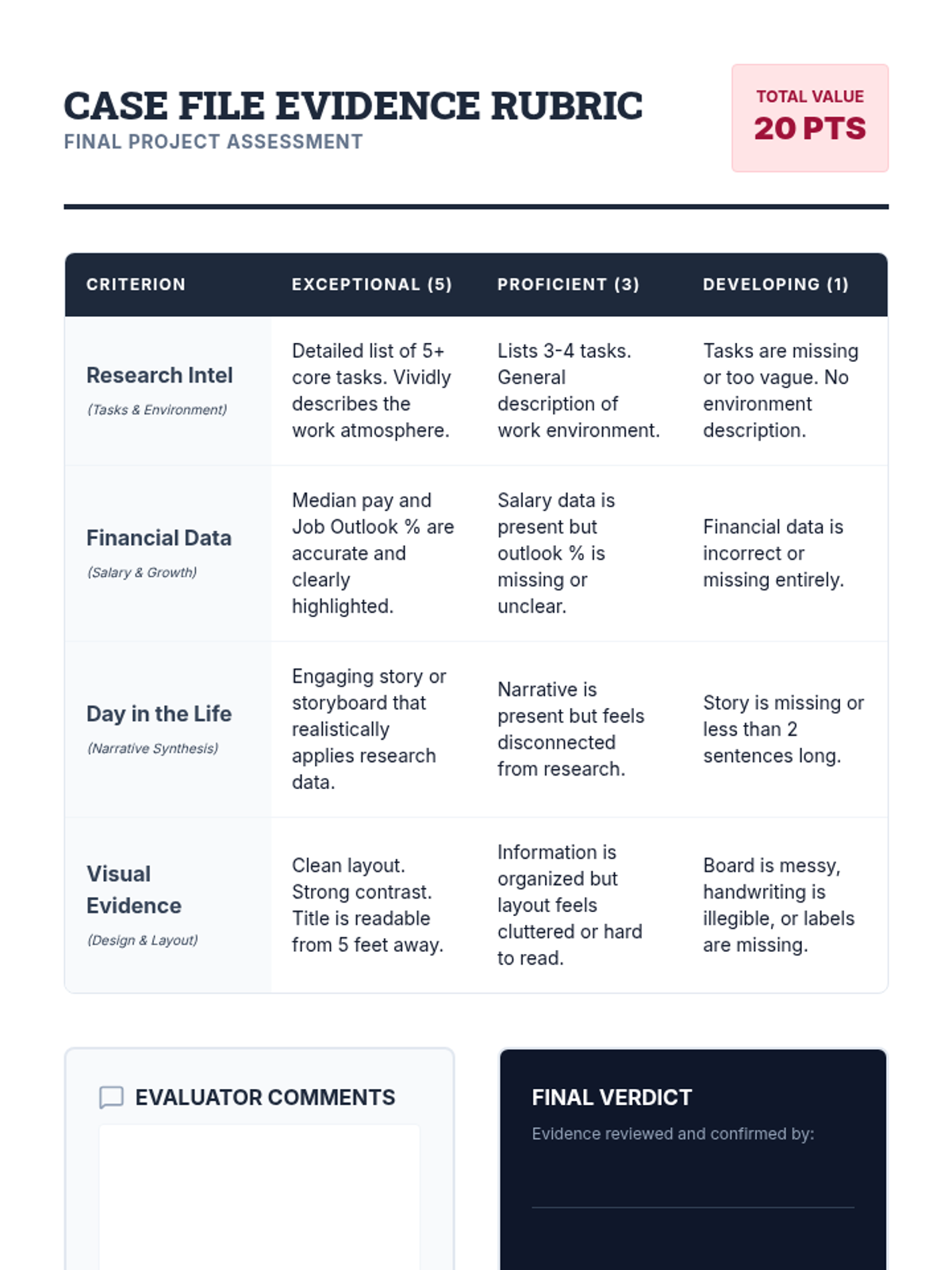 A project-based sequence where 6th-grade students act as 'Career Detectives' to research, analyze, and present a deep-dive investigation into a chosen profession, culminating in a Classroom Career Expo.