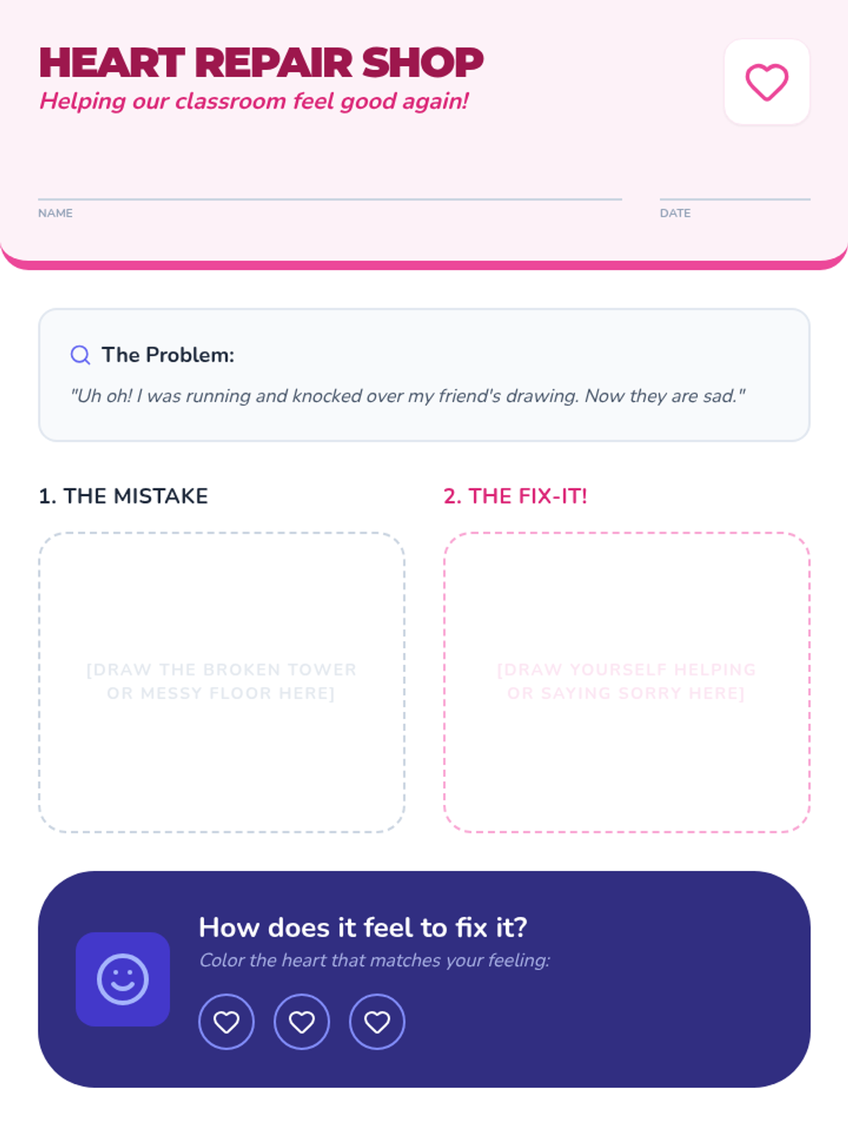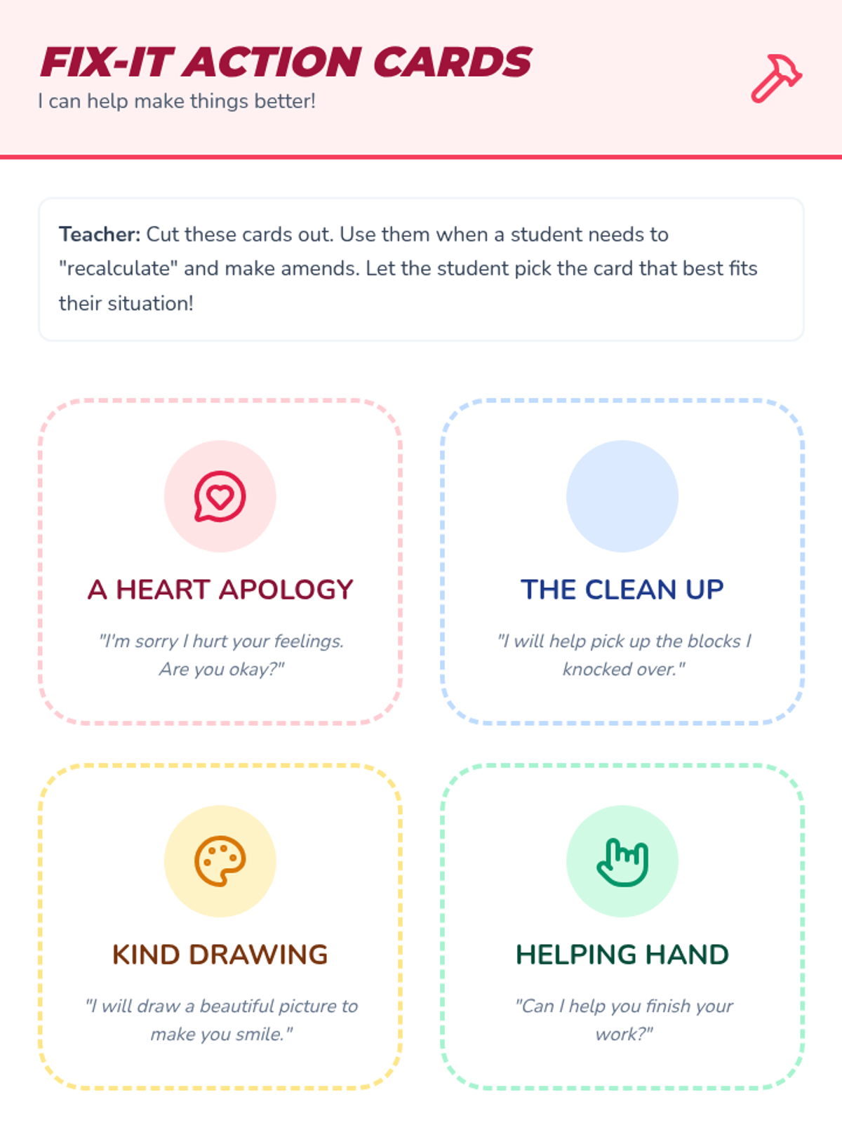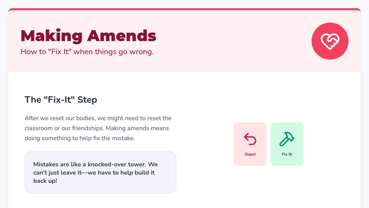This sequence helps Kindergarten students understand that behavior tracking is a tool for growth. It focuses on resilience, accepting feedback, using reset strategies, and restorative actions to get back on track after a mistake.