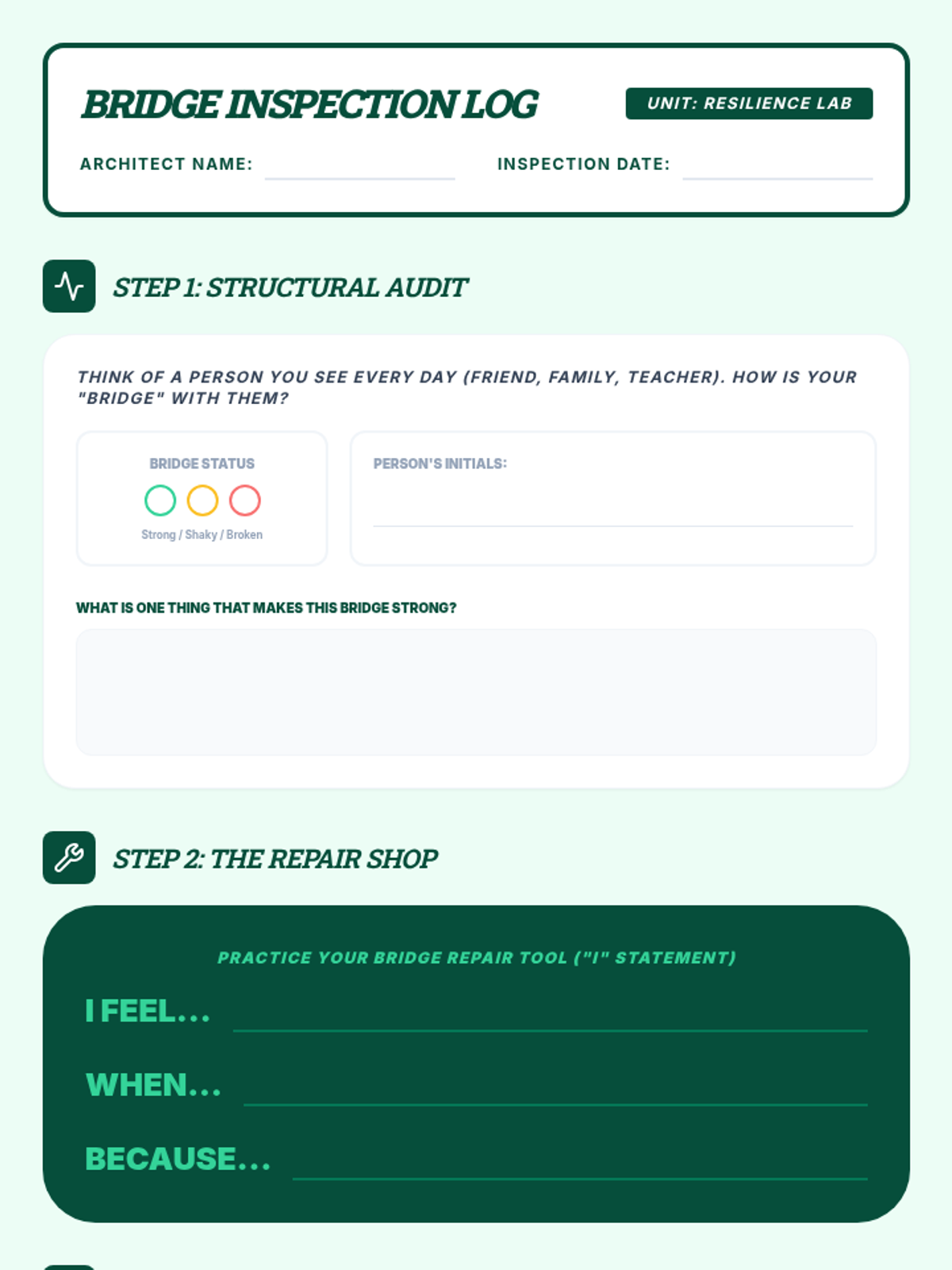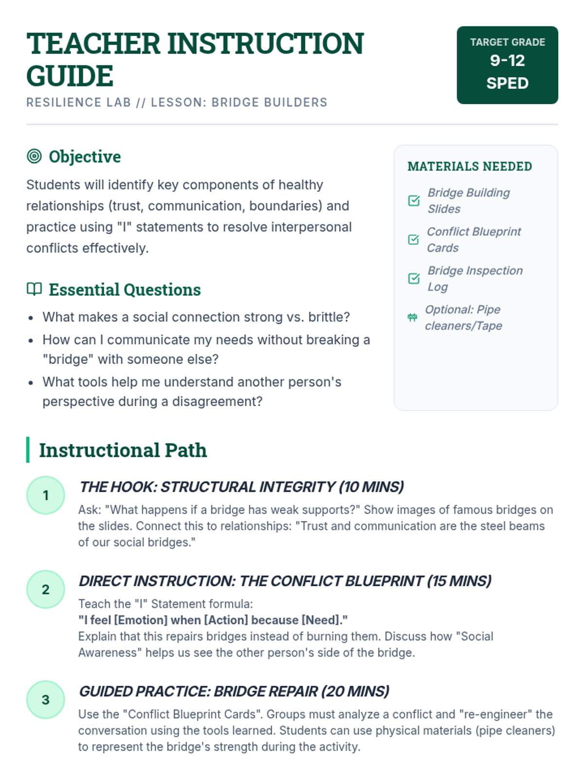 A social-emotional learning sequence for high school special education students focused on building resilience through self-awareness, self-management, and relationship skills. students engage with blueprint-themed activities to engineer emotional strength and responsible decision-making.