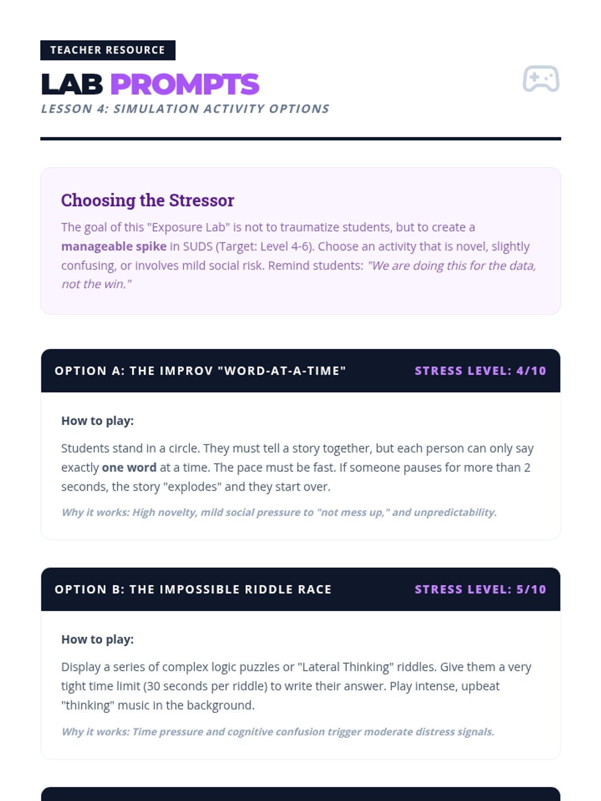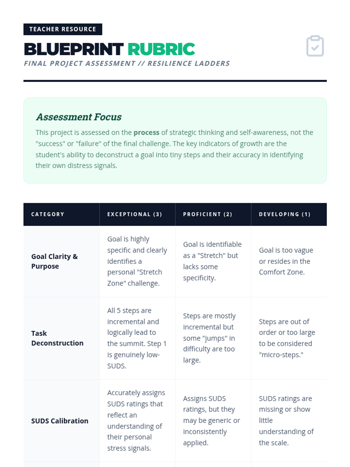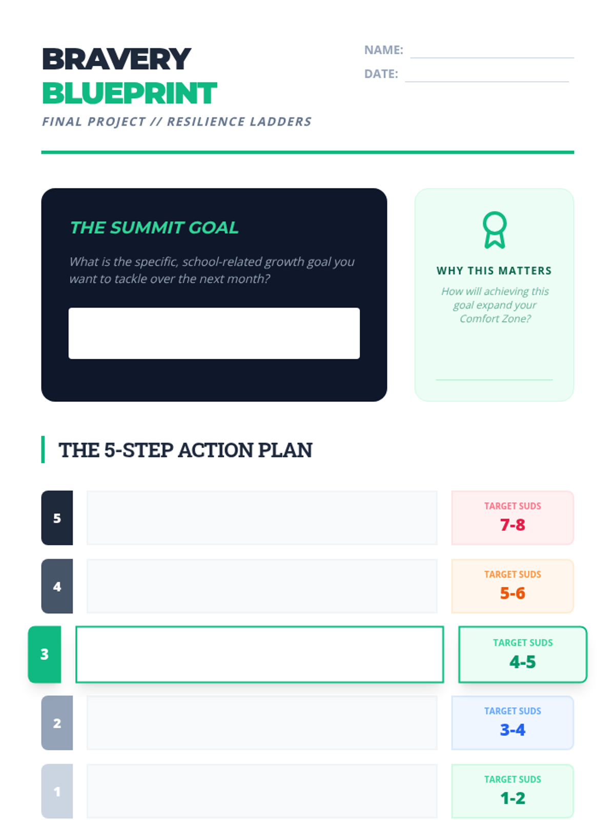 A 5-lesson sequence designed for 8th-grade students to learn the principles of exposure hierarchies for anxiety through a school-focused resilience framework. Students learn to identify their comfort zones, calibrate their internal stress signals, and design step-by-step challenges to expand their confidence.