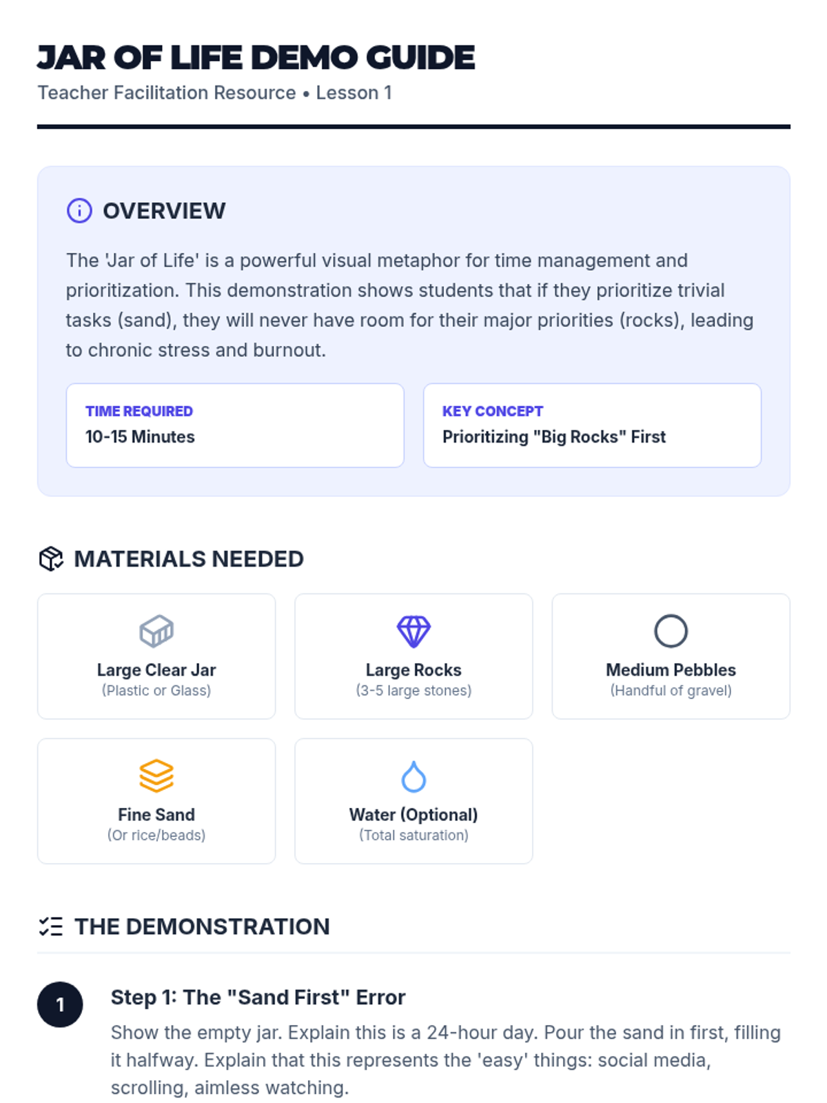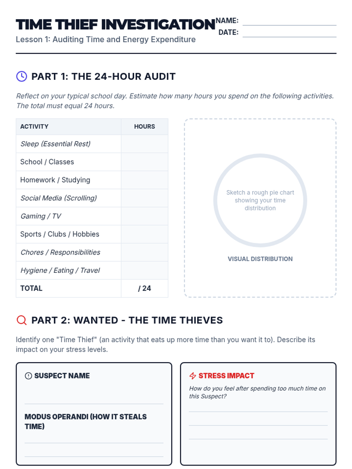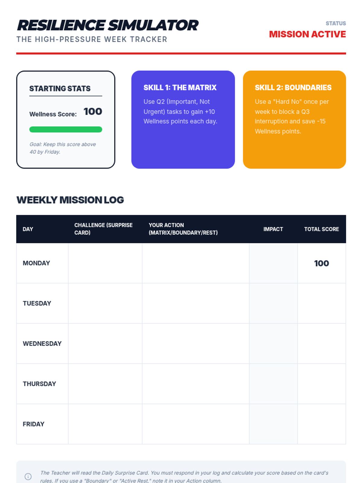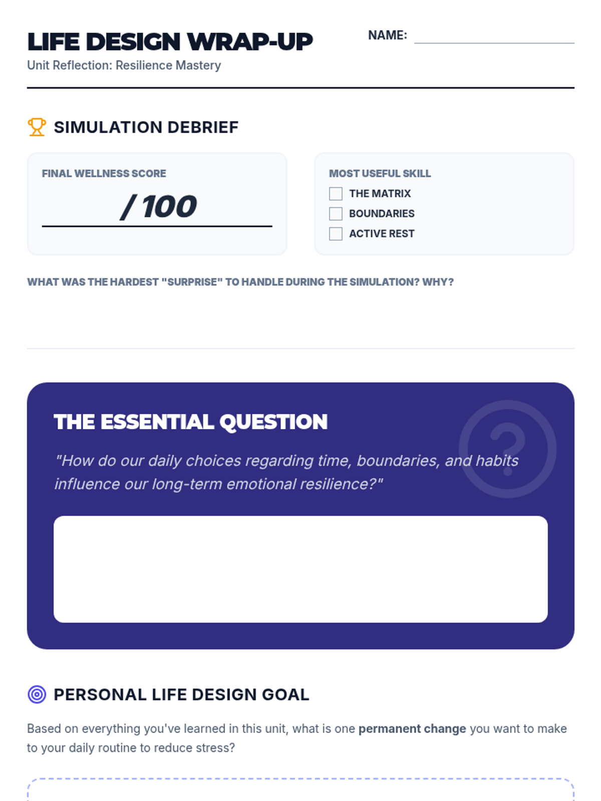 A 5-lesson unit for 8th graders focusing on preventative mental health. Students learn to manage stress through time auditing, prioritization frameworks (Eisenhower Matrix), boundary setting, and understanding the physiological pillars of resilience.