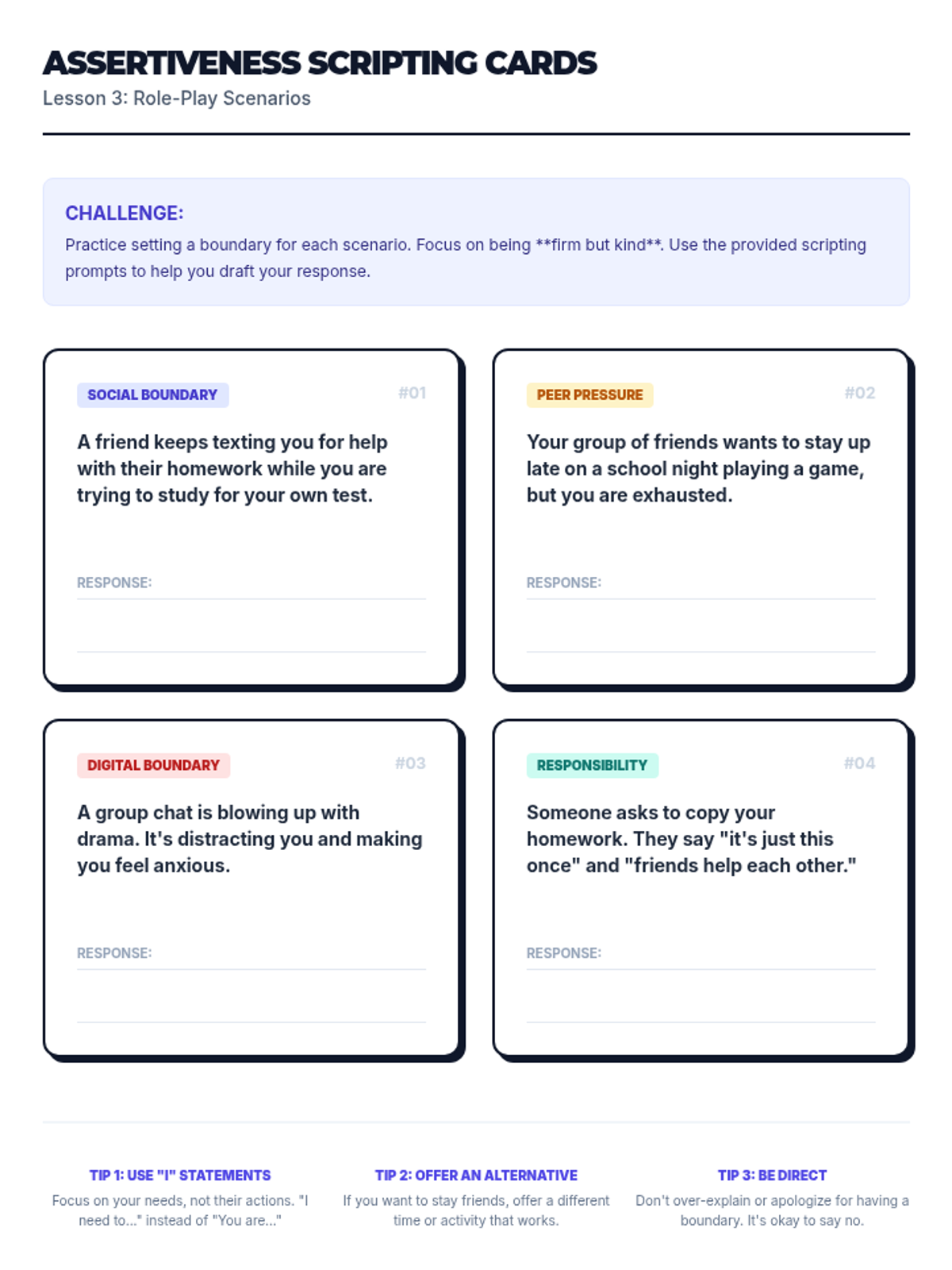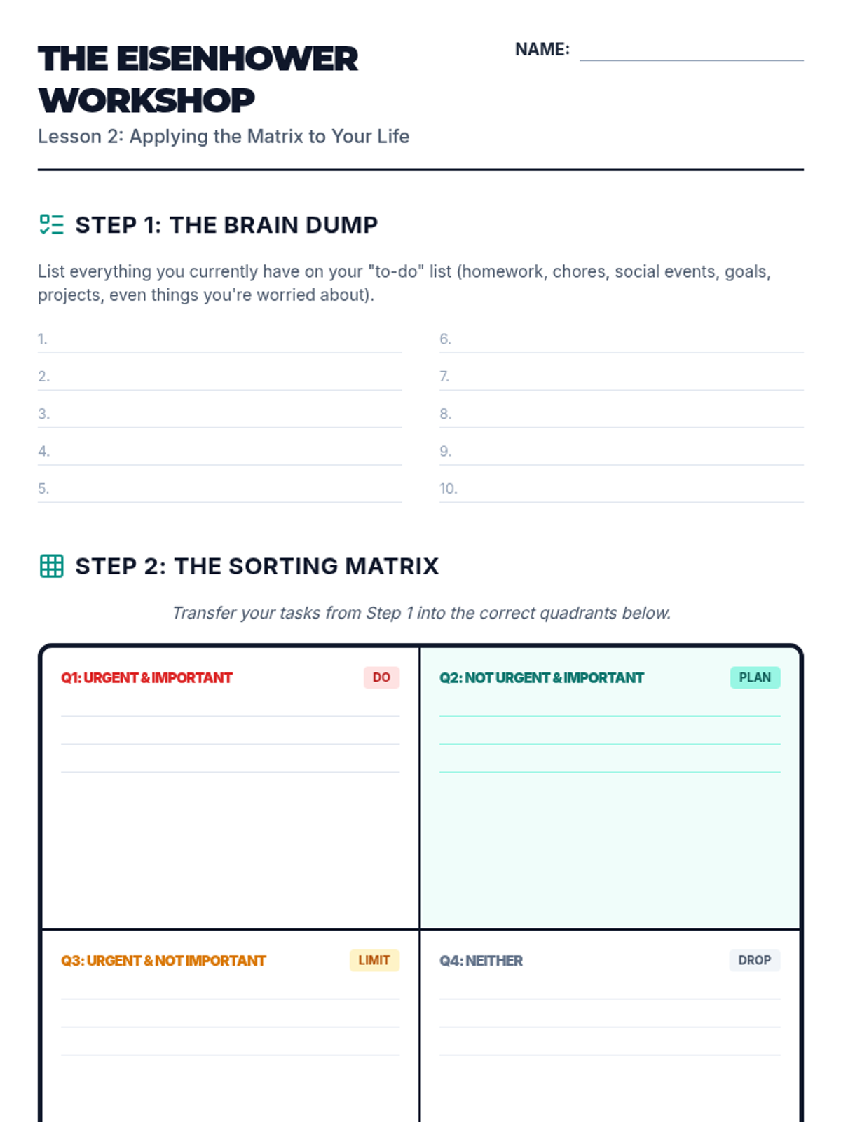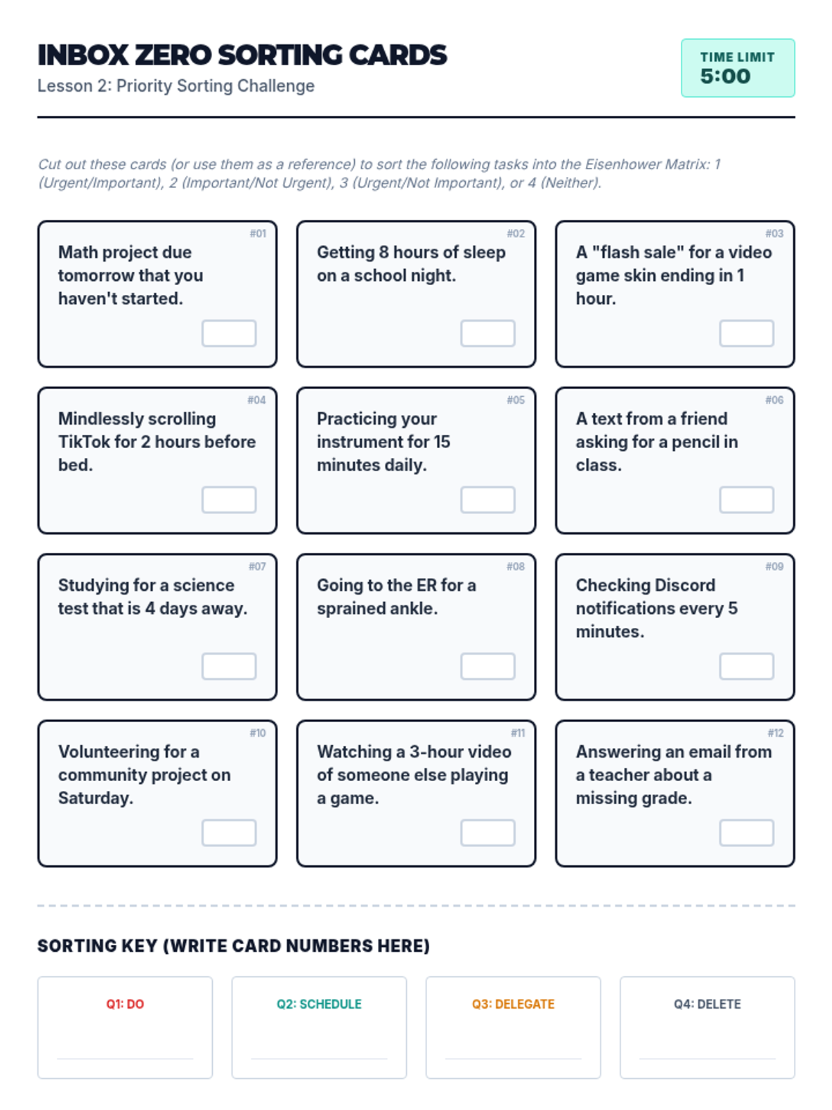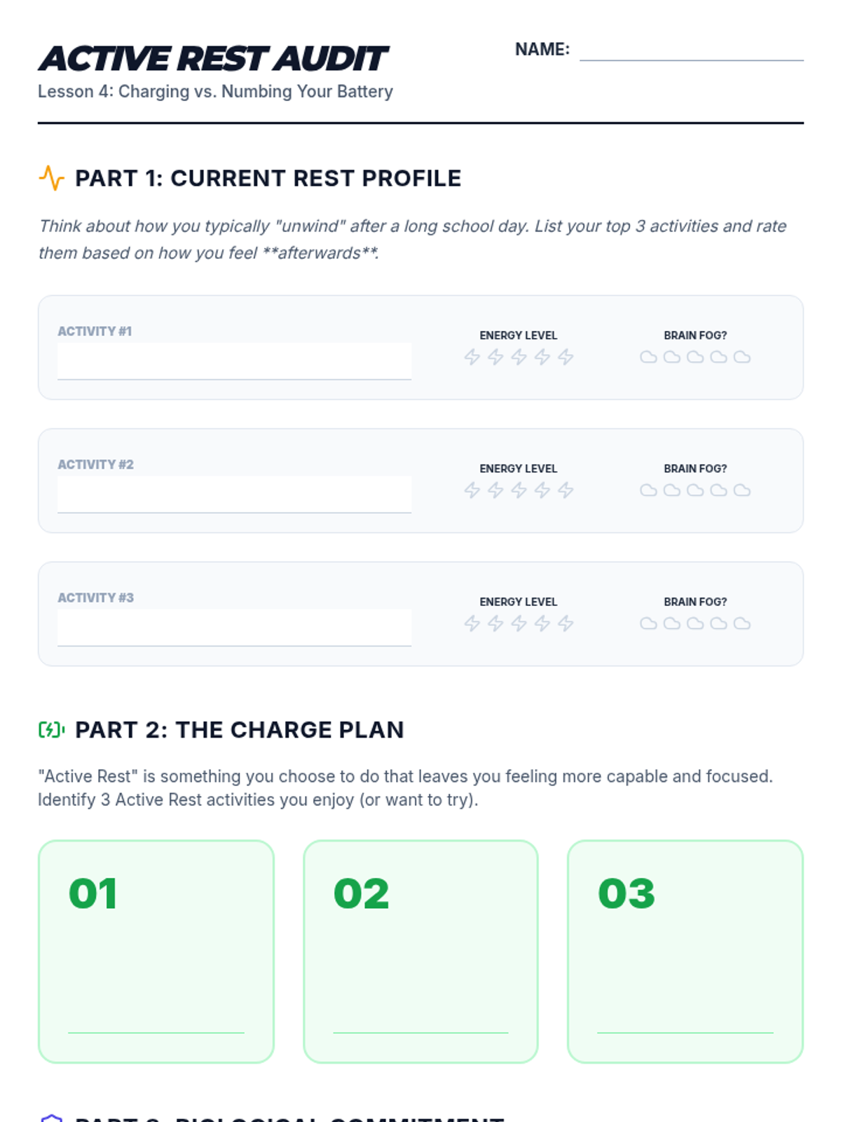 A 5-lesson unit for 8th graders focusing on preventative mental health. Students learn to manage stress through time auditing, prioritization frameworks (Eisenhower Matrix), boundary setting, and understanding the physiological pillars of resilience.