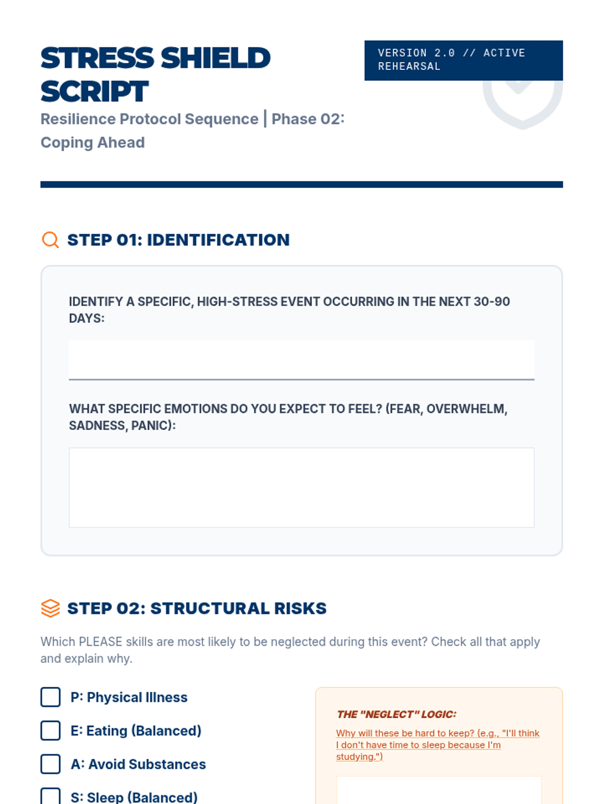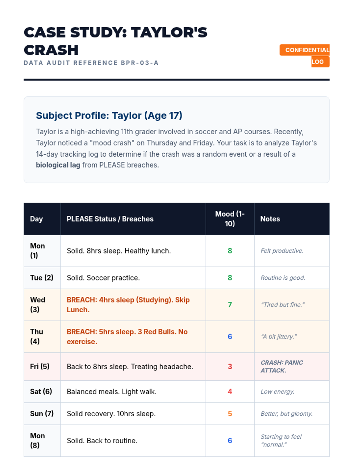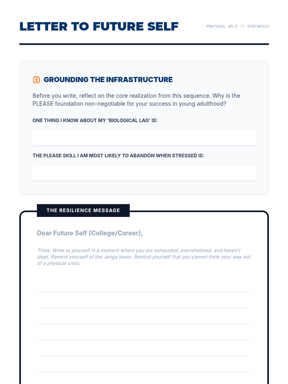 A comprehensive 5-lesson sequence for 11th-grade students focused on mastering the PLEASE skills (DBT therapeutic approach) to reduce emotional vulnerability. Students move from self-assessment to crisis planning, data analysis, and peer consultancy, culminating in a professional 'Resilience Portfolio' designed for their transition to young adulthood.