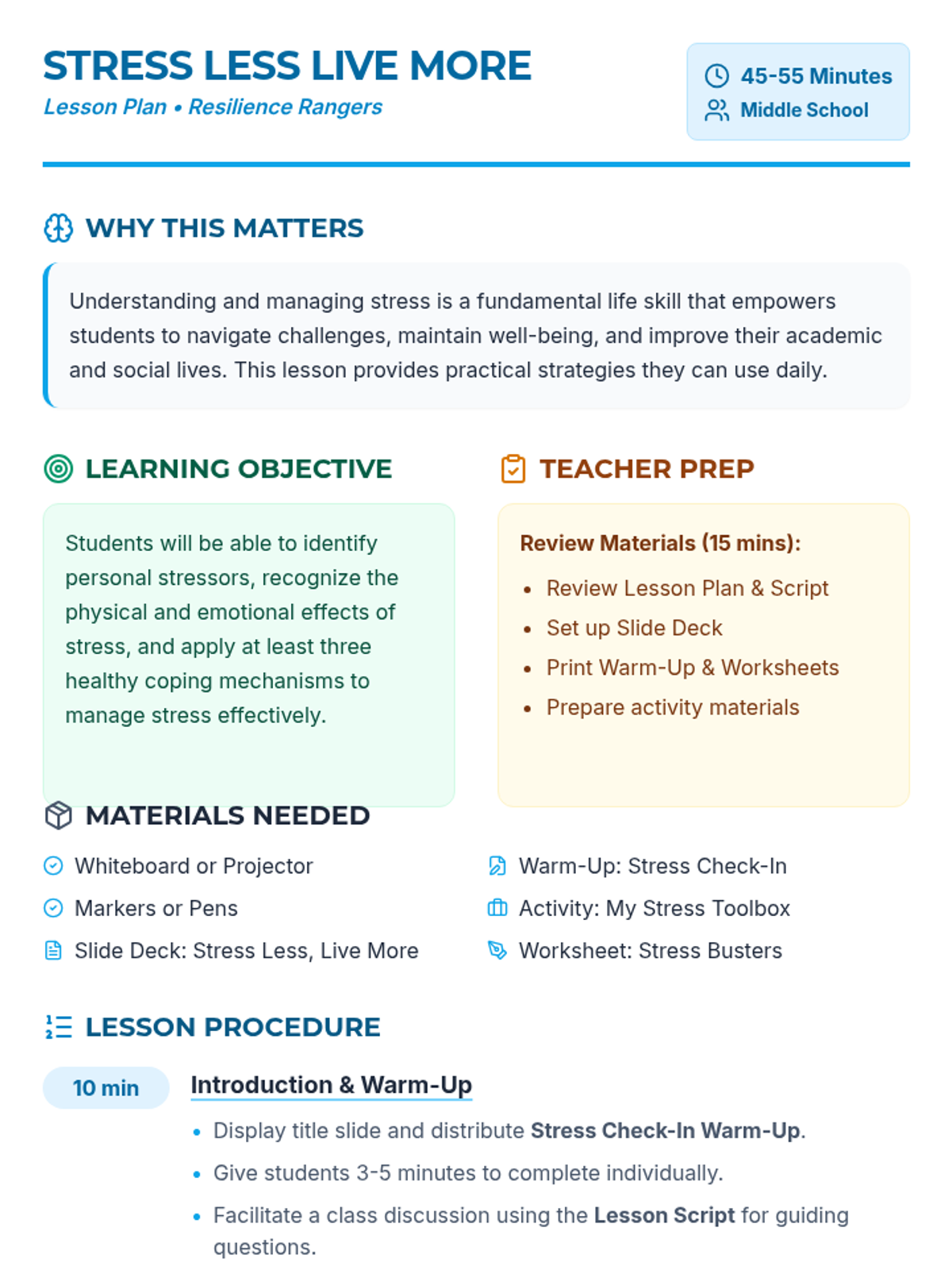 A 12-session emotional intelligence and literacy program designed for K-6 students. Using a 'Trailblazer' theme, Pathfinders develop self-awareness, confidence, and critical decision-making skills to replace impulsive reactions with thoughtful choices. Includes safety scenarios and practical tools for managing exam stress.
