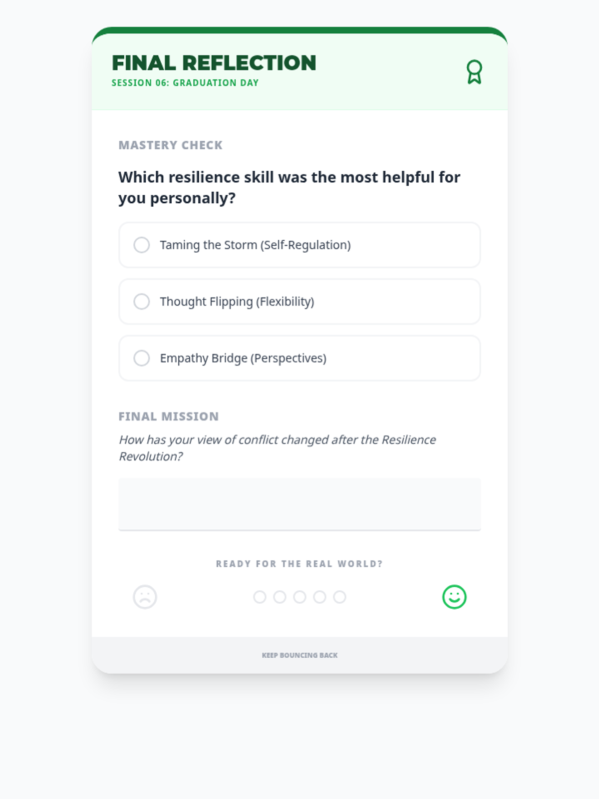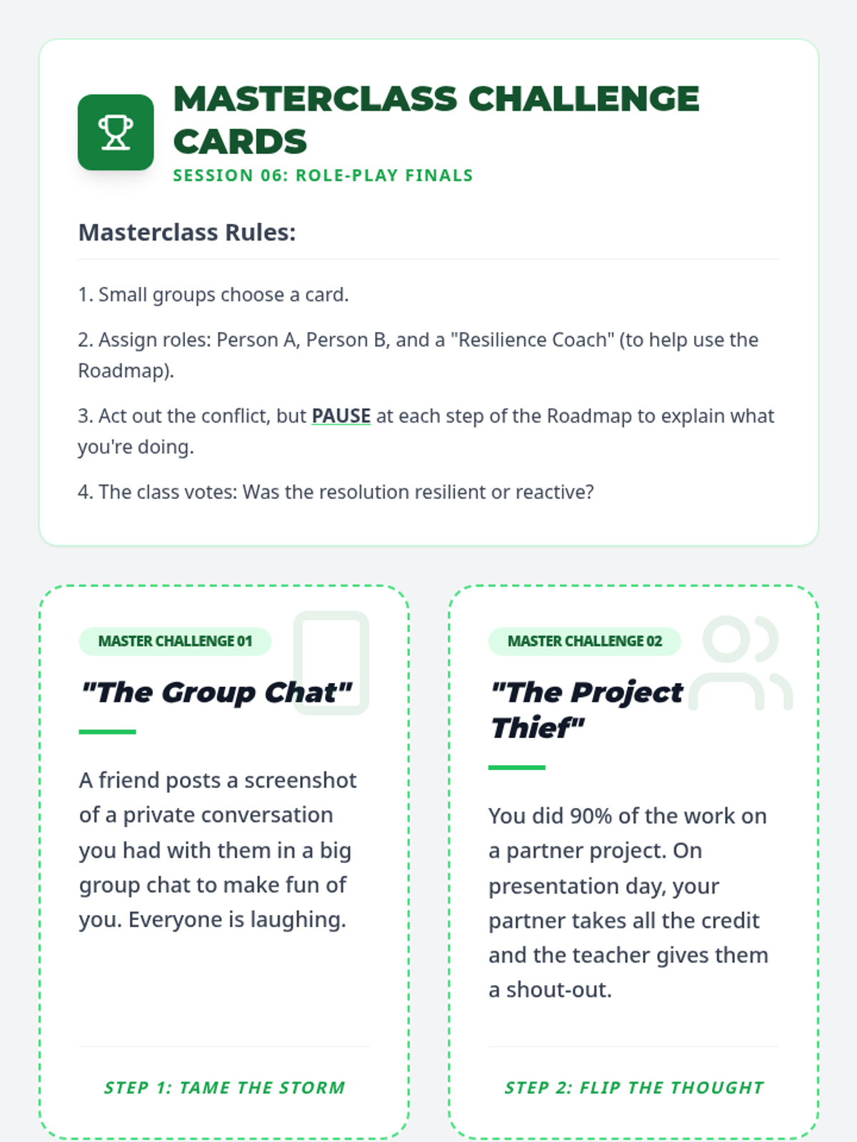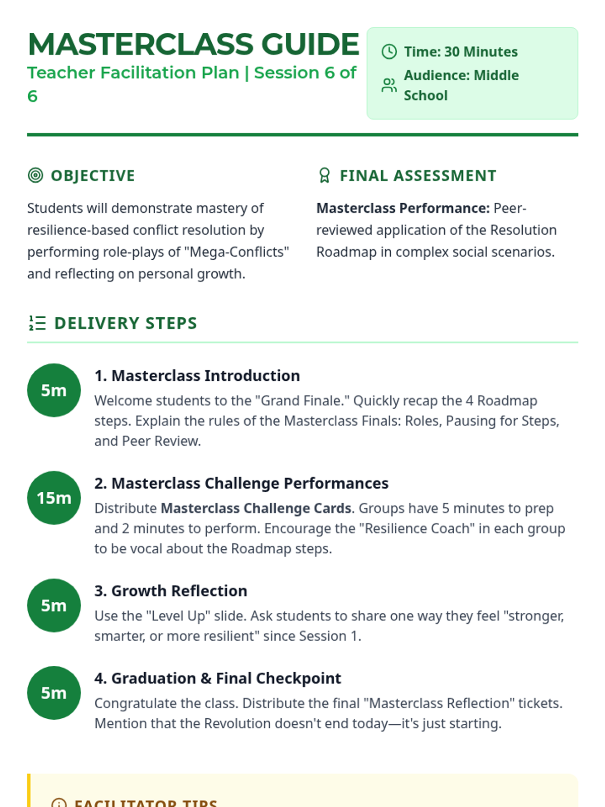 A comprehensive 6-session sequence for middle schoolers focusing on developing resilience as a core tool for effective conflict resolution. Students learn to manage emotions, think flexibly, and resolve interpersonal challenges constructively.
