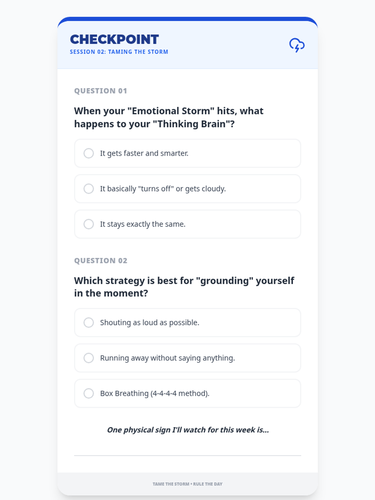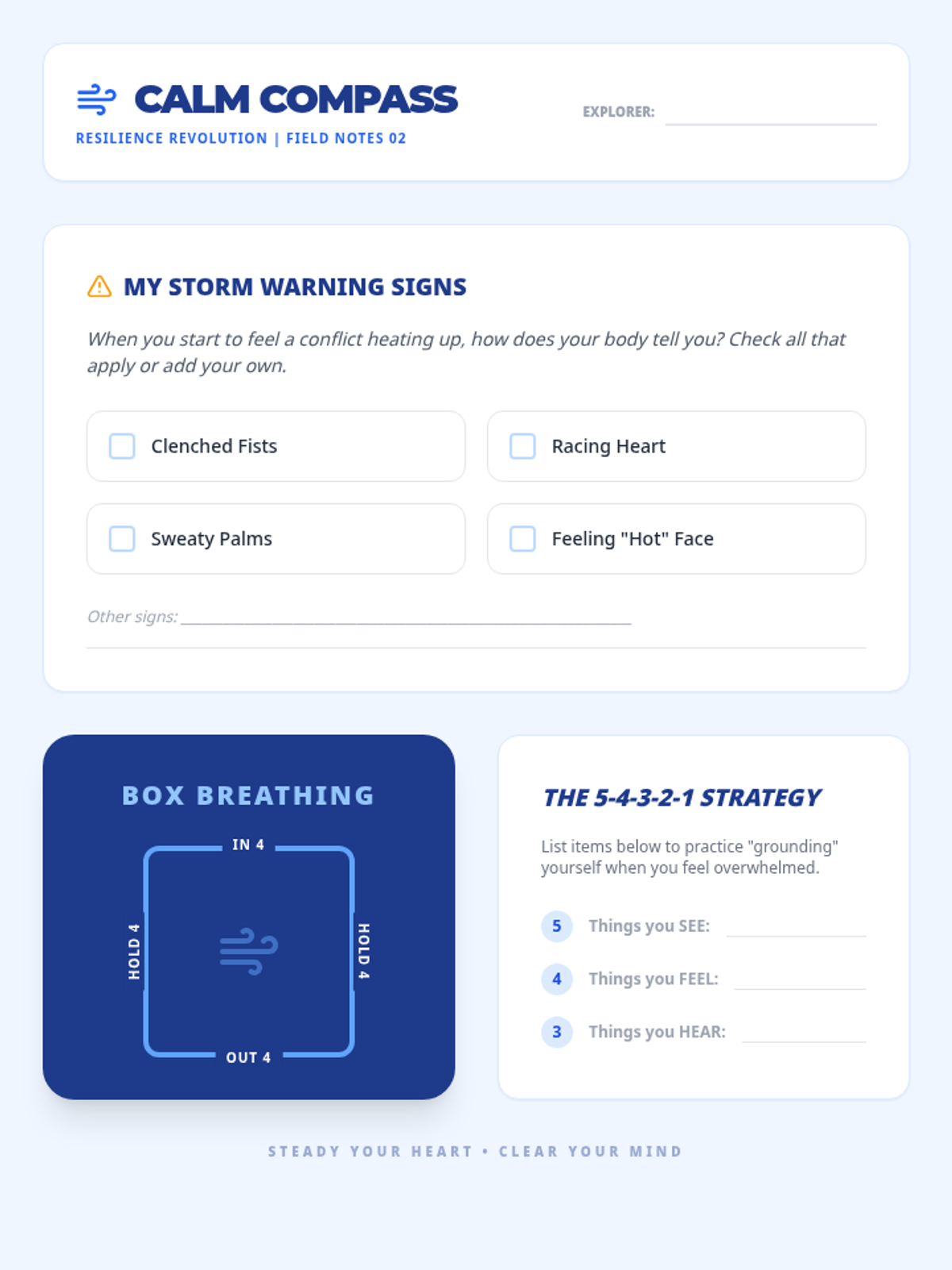 A series of three interactive counseling sessions for middle and high school students, focusing on self-discovery, emotional regulation, and future planning. Using a 'Blueprint' aesthetic, students engage in hands-on activities to map out their internal identities, manage external stressors, and construct actionable goals.
