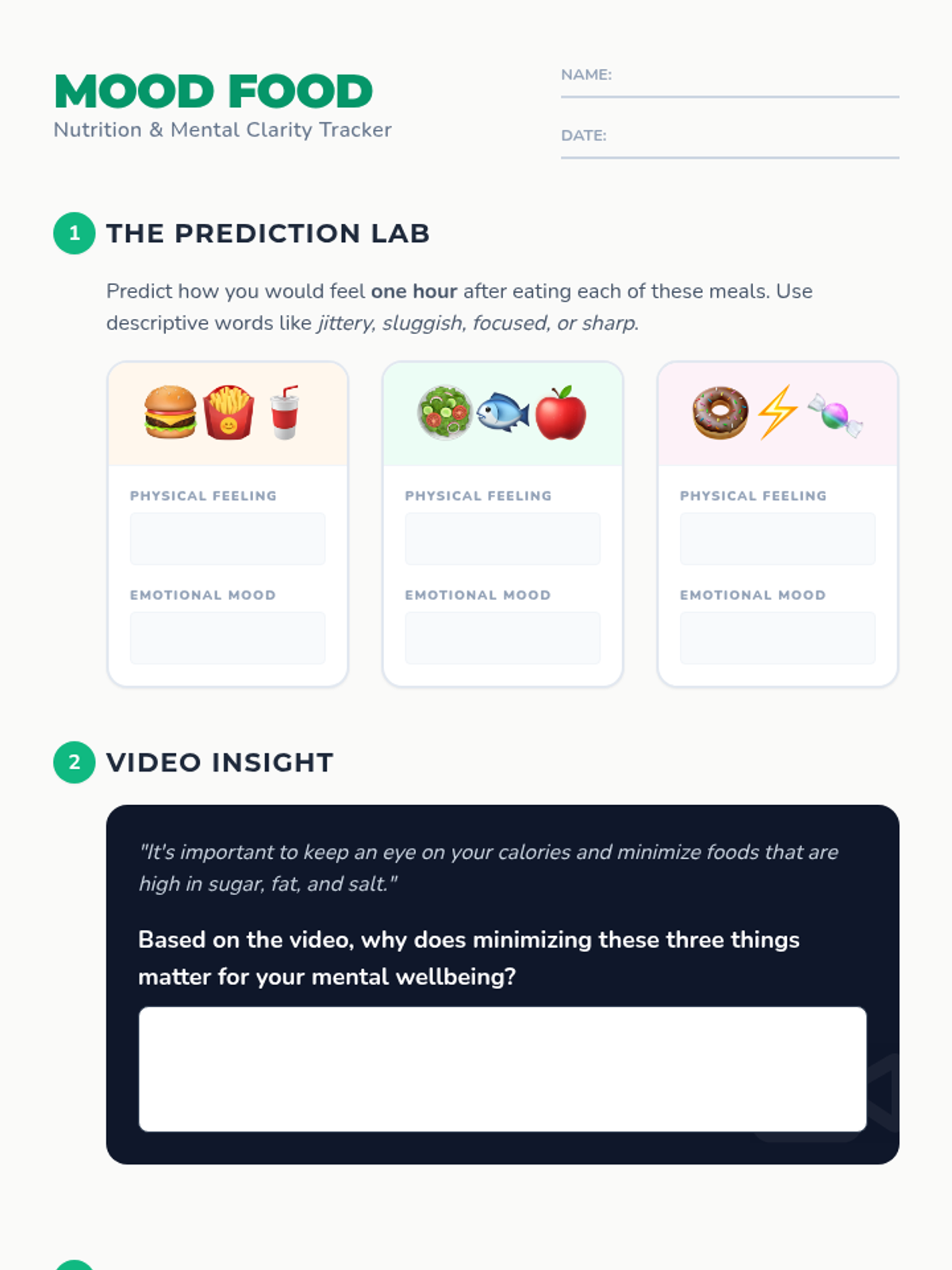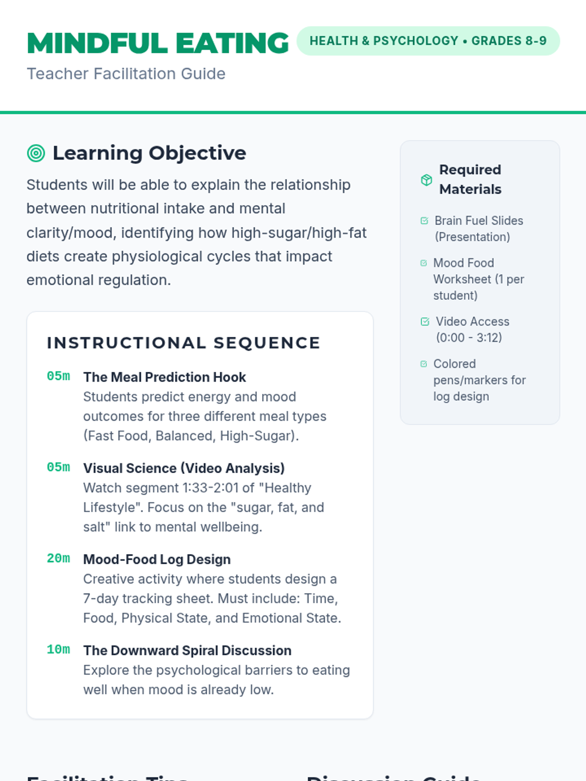 A lesson sequence exploring the biological and psychological links between diet and mental wellbeing, focusing on how different foods impact mood, energy levels, and long-term mental clarity.
