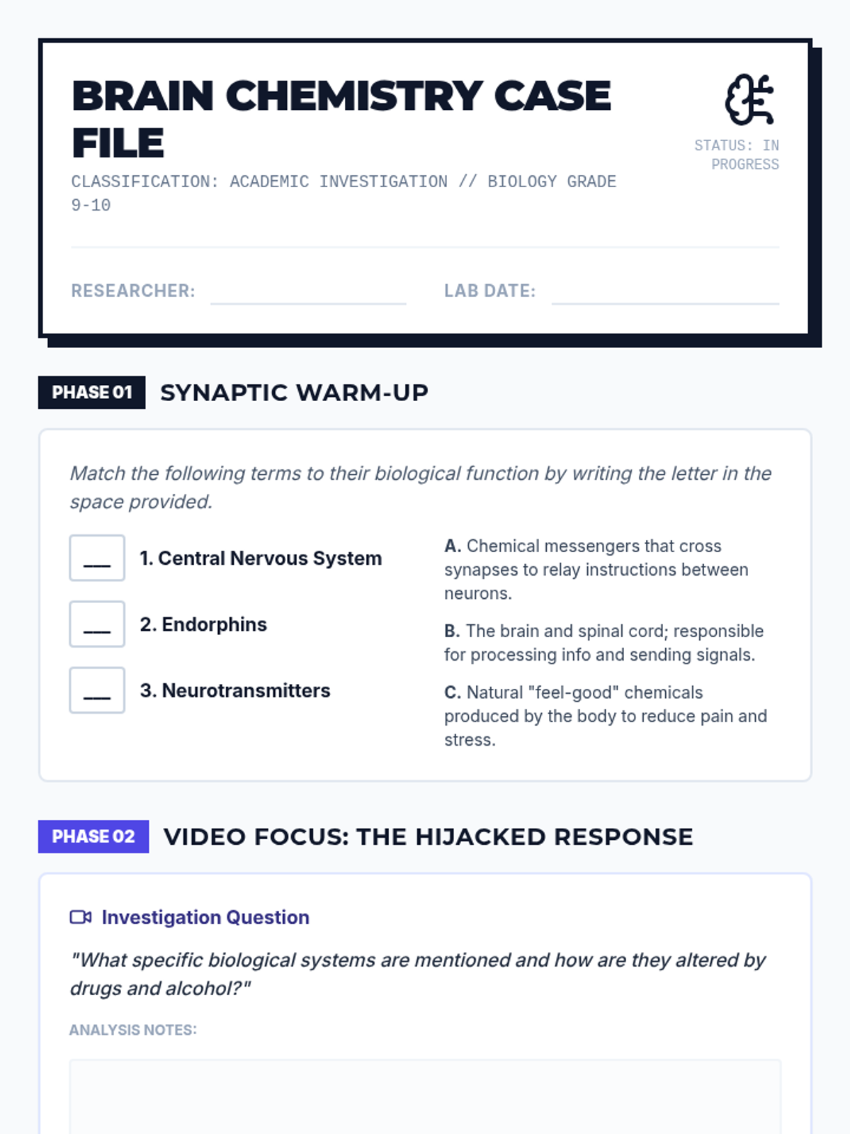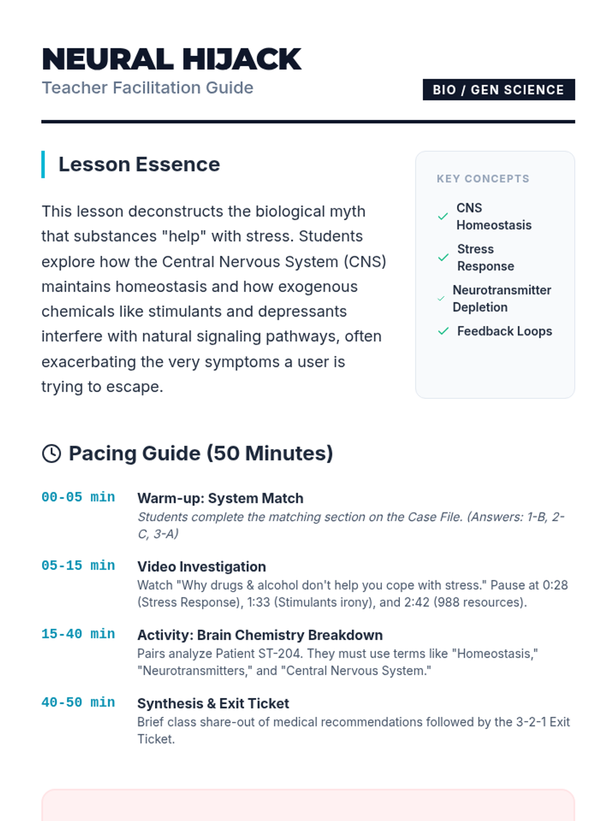This lesson sequence explores the physiological impact of stress and substance use on the central nervous system, focusing on how exogenous chemicals disrupt homeostasis. Students analyze a medical case study to apply their understanding of stimulants and biological feedback loops.