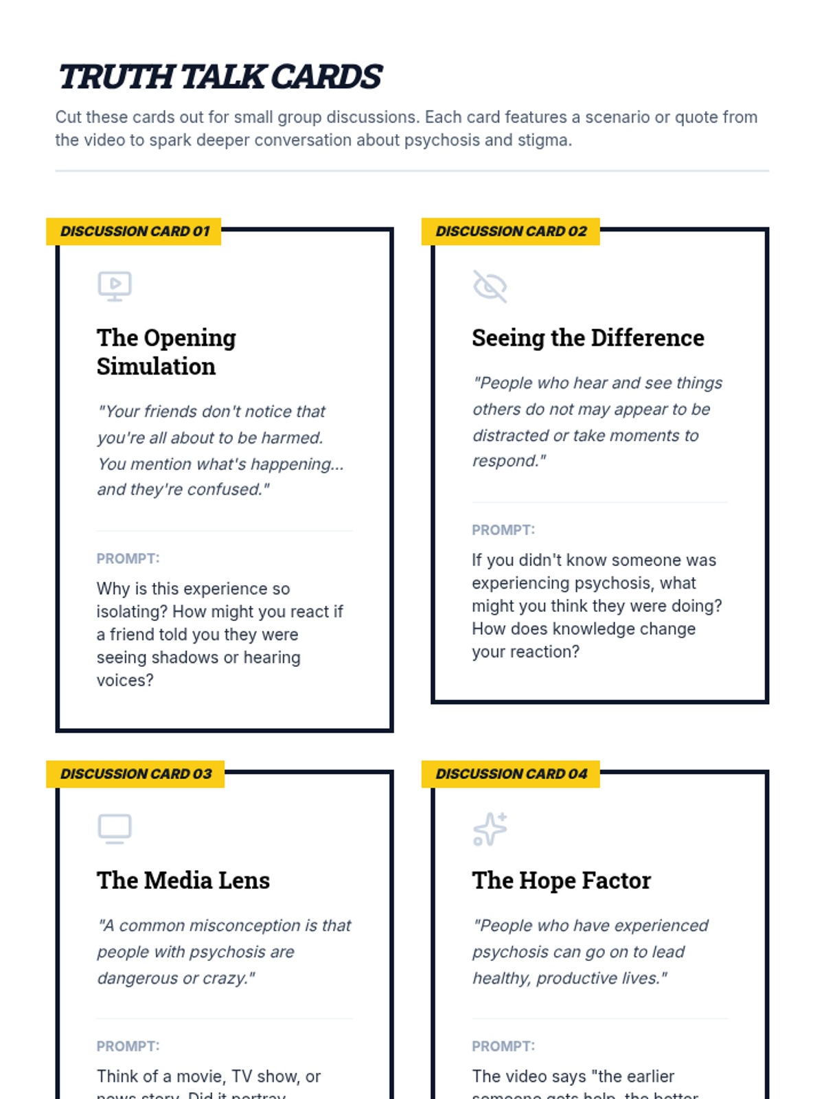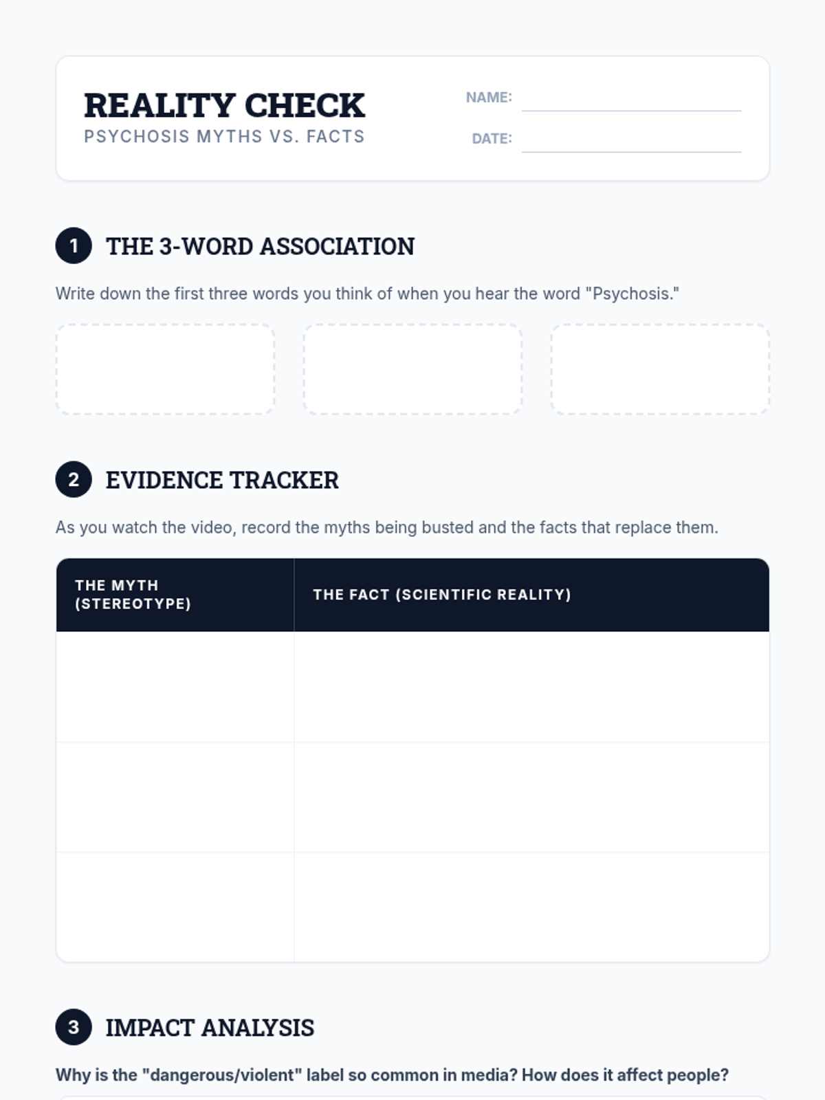 A high school health lesson focused on debunking common myths about psychosis, understanding its clinical definition and symptoms, and exploring the impact of social stigma on recovery.