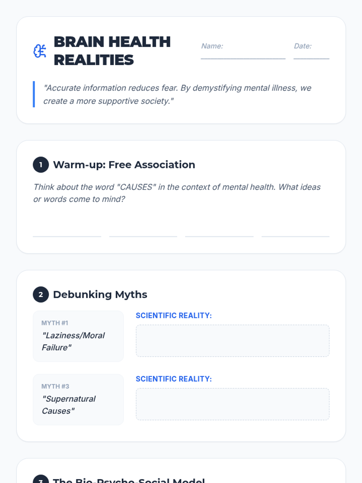 A comprehensive unit focused on debunking mental health myths and establishing a scientific understanding of mental illness through the Bio-Psycho-Social model.