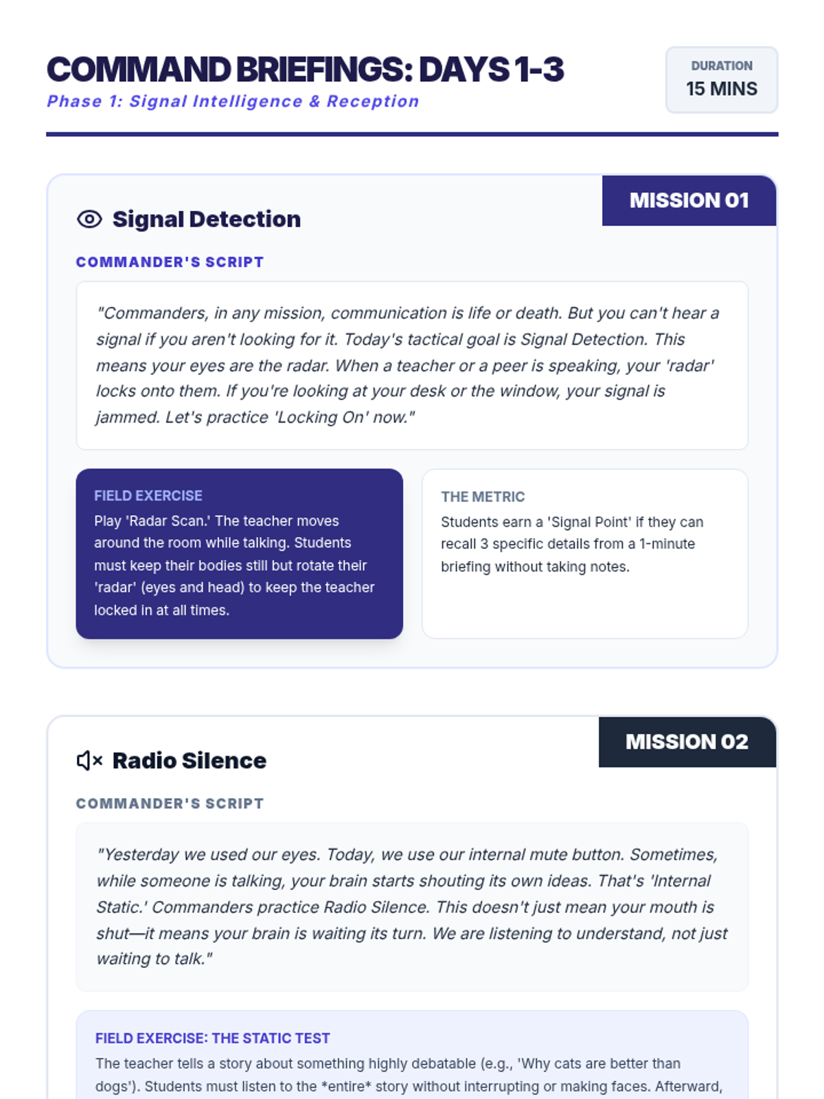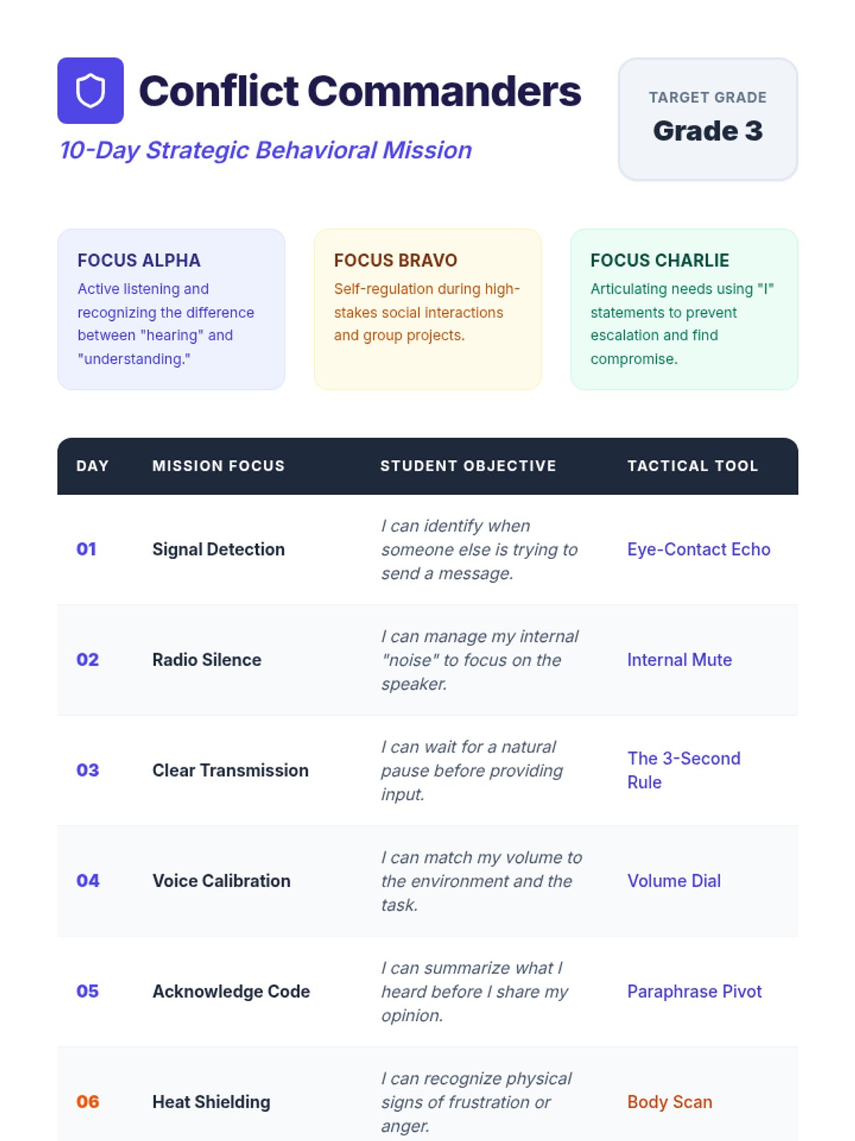 A comprehensive K-5 sequence for developing respectful communication, conflict resolution, and self-regulation skills through multi-day guided missions.