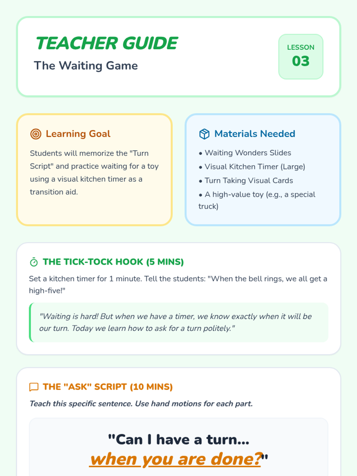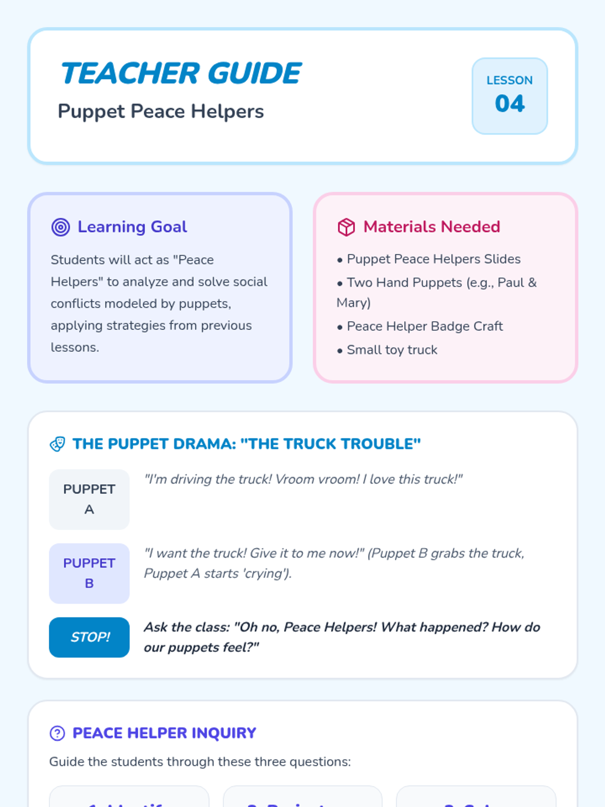 A Pre-K sequence focused on teaching social-emotional skills through puppet play, role-play, and visual aids. Students learn the foundational skills of sharing, trading, de-escalating physical impulses, and making amends with peers.