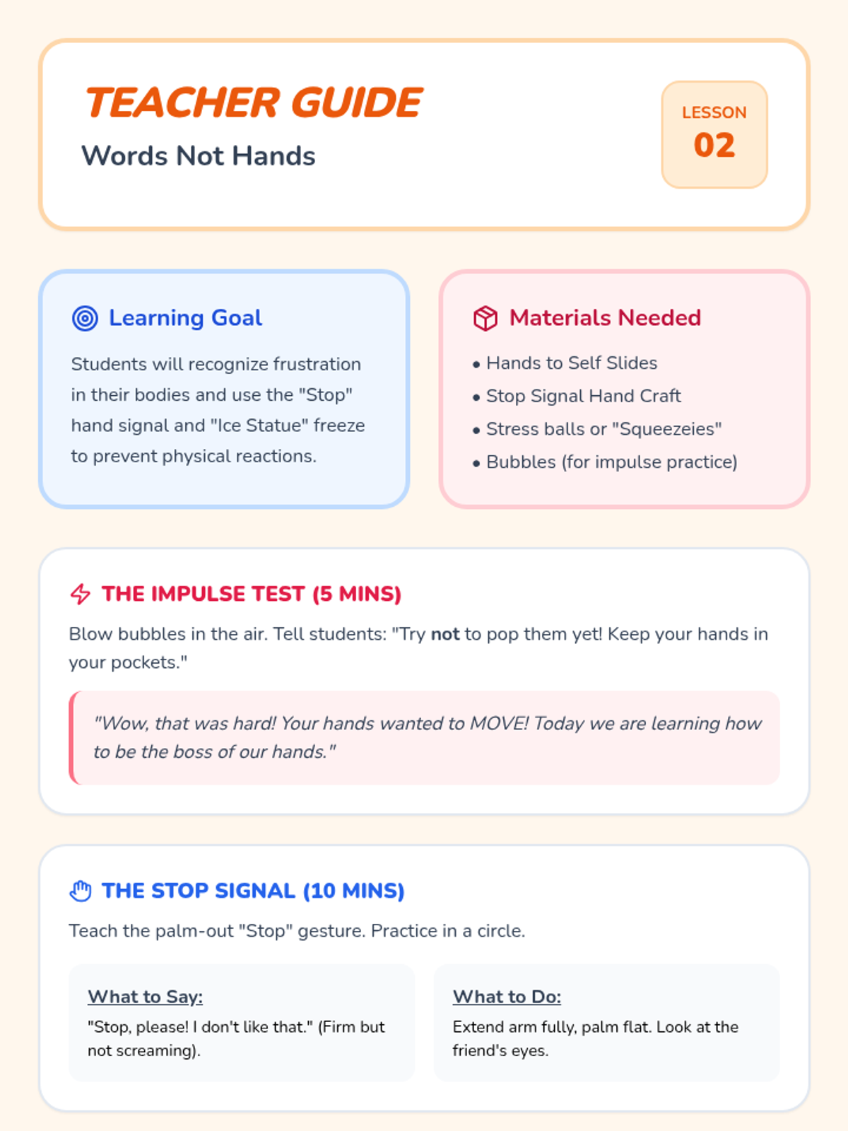 A 6-lesson social skills unit for K-1 students focused on self-regulation, personal space, and social interaction through the theme of forest animal friends. Students learn essential classroom behaviors like listening, deep breathing, and sharing through stories and guided activities.