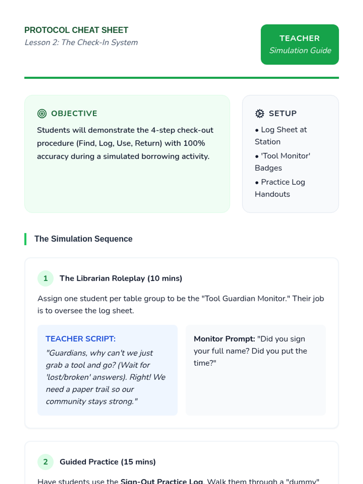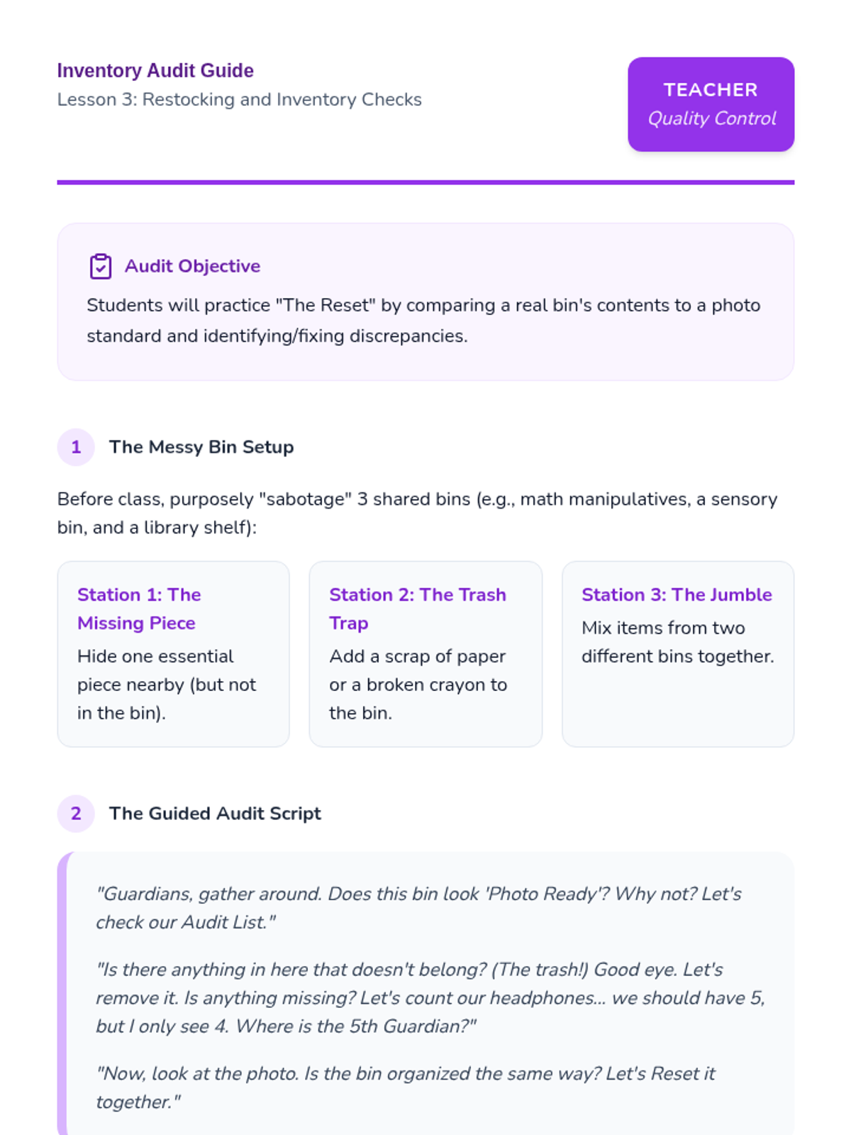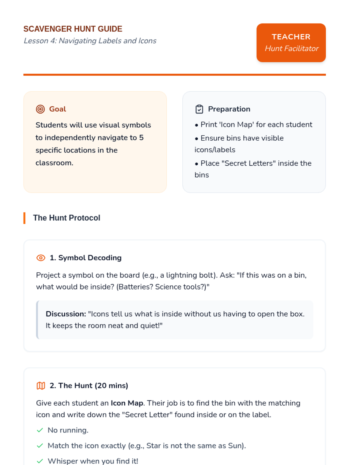 This sequence teaches 3rd-grade students, particularly those in special education, how to manage, respect, and organize classroom sensory tools and shared resources. Students develop accountability through check-in systems, inventory checks, and visual navigation skills.